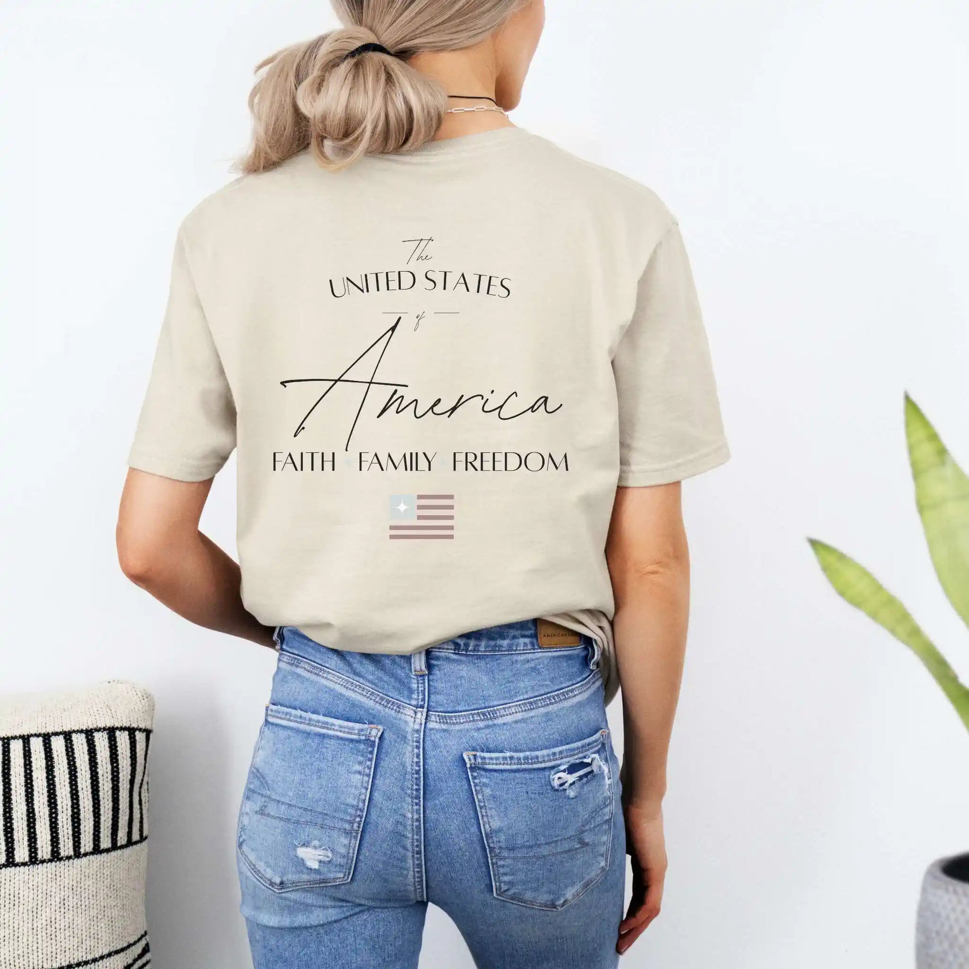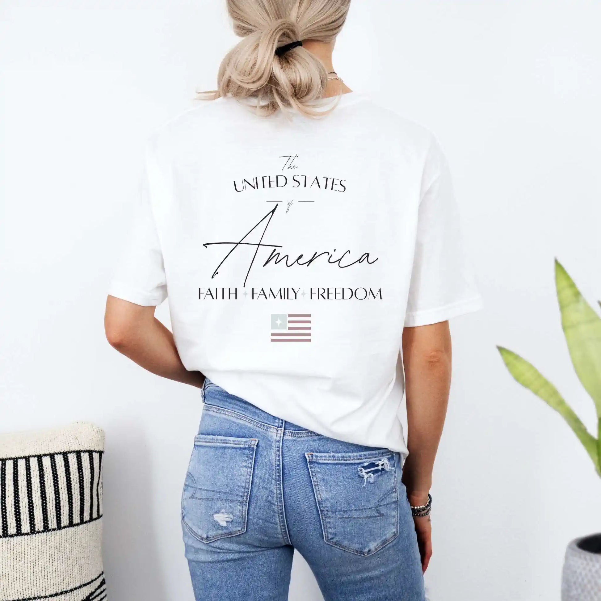Featuring a subtle "Since 1776" design on the front pocket, this classic t-shirt offers a touch of historical pride. The main design on the back proudly displays "The United States of America" with "Faith, Family + Freedom" and a stylized flag, celebrating core American values and embodying the American spirit.
