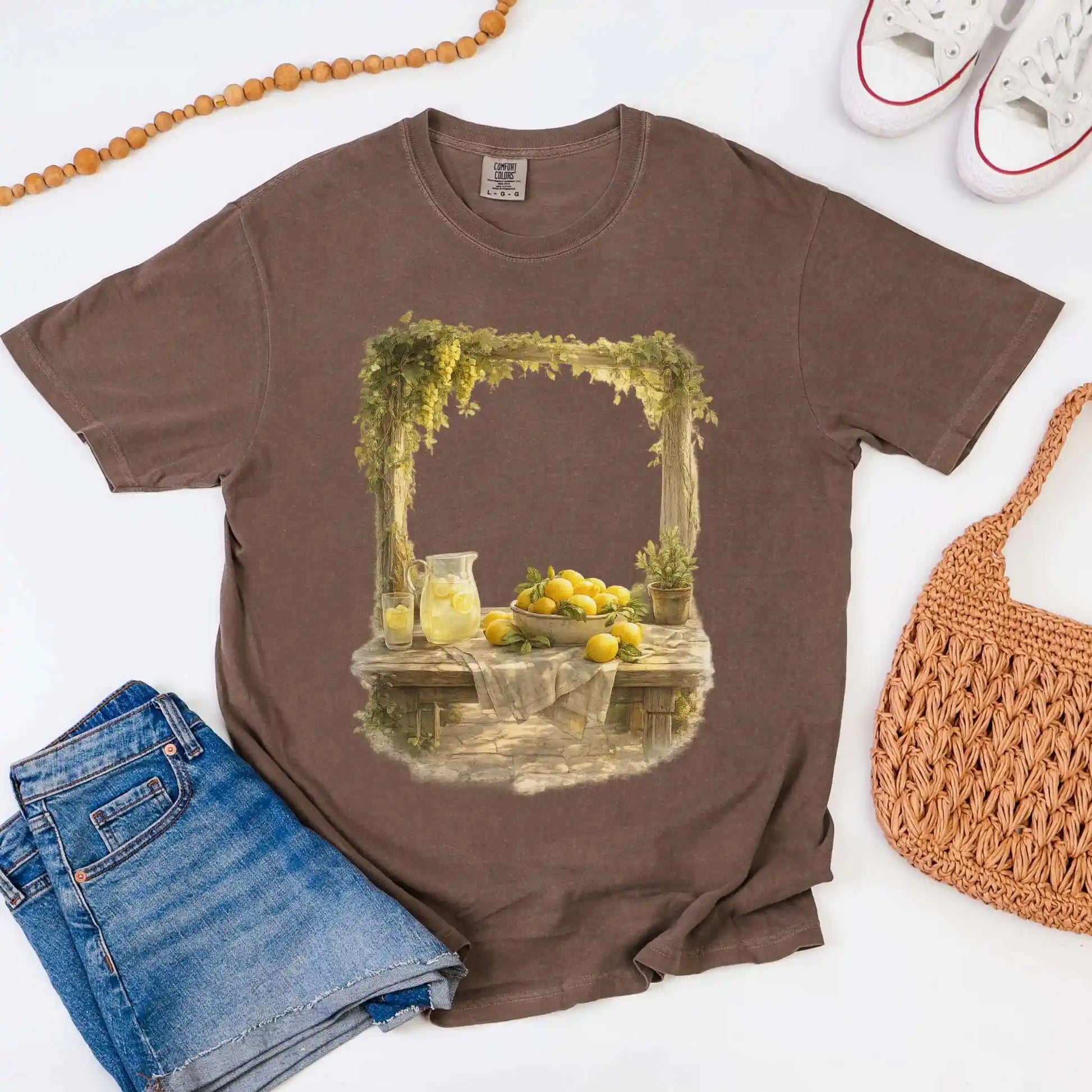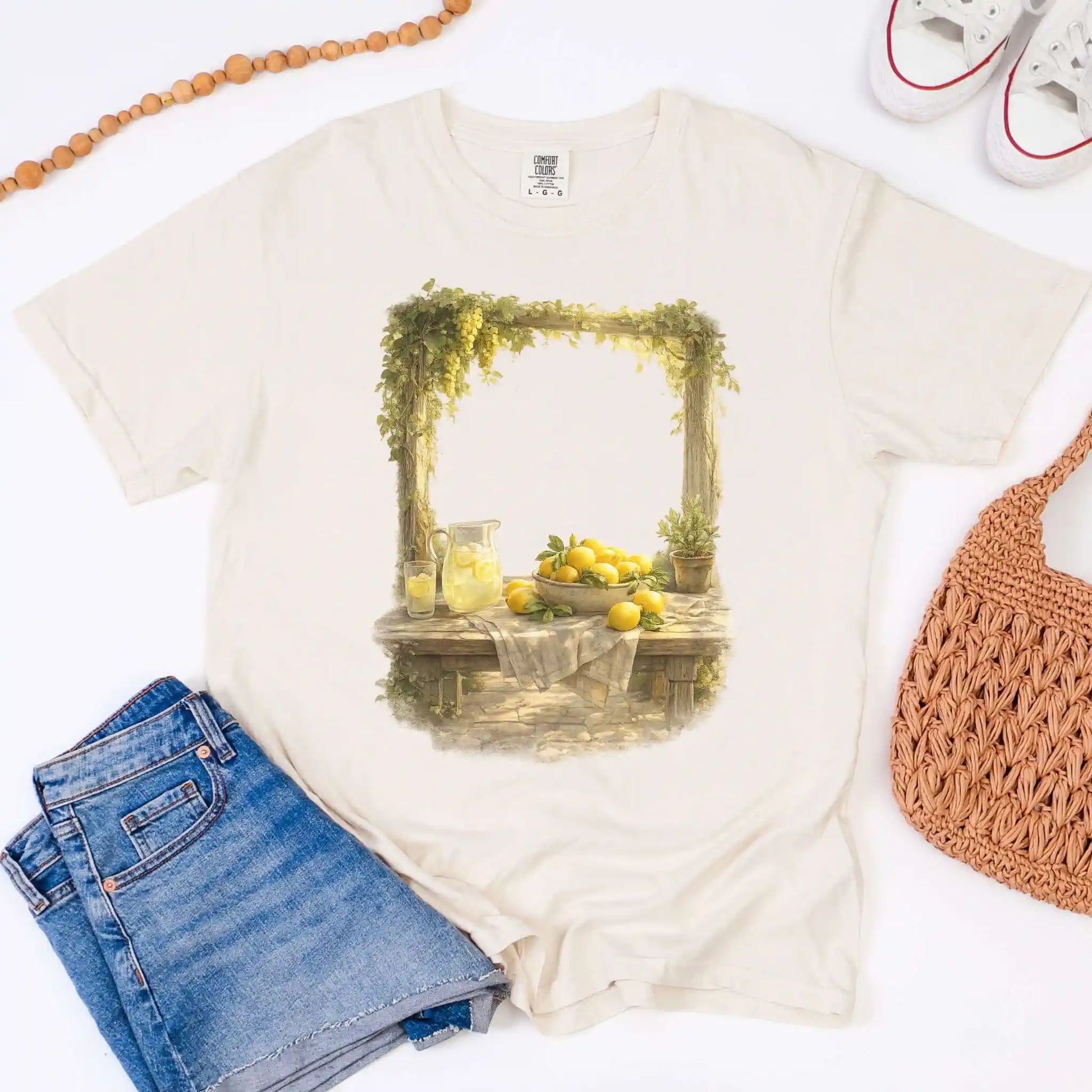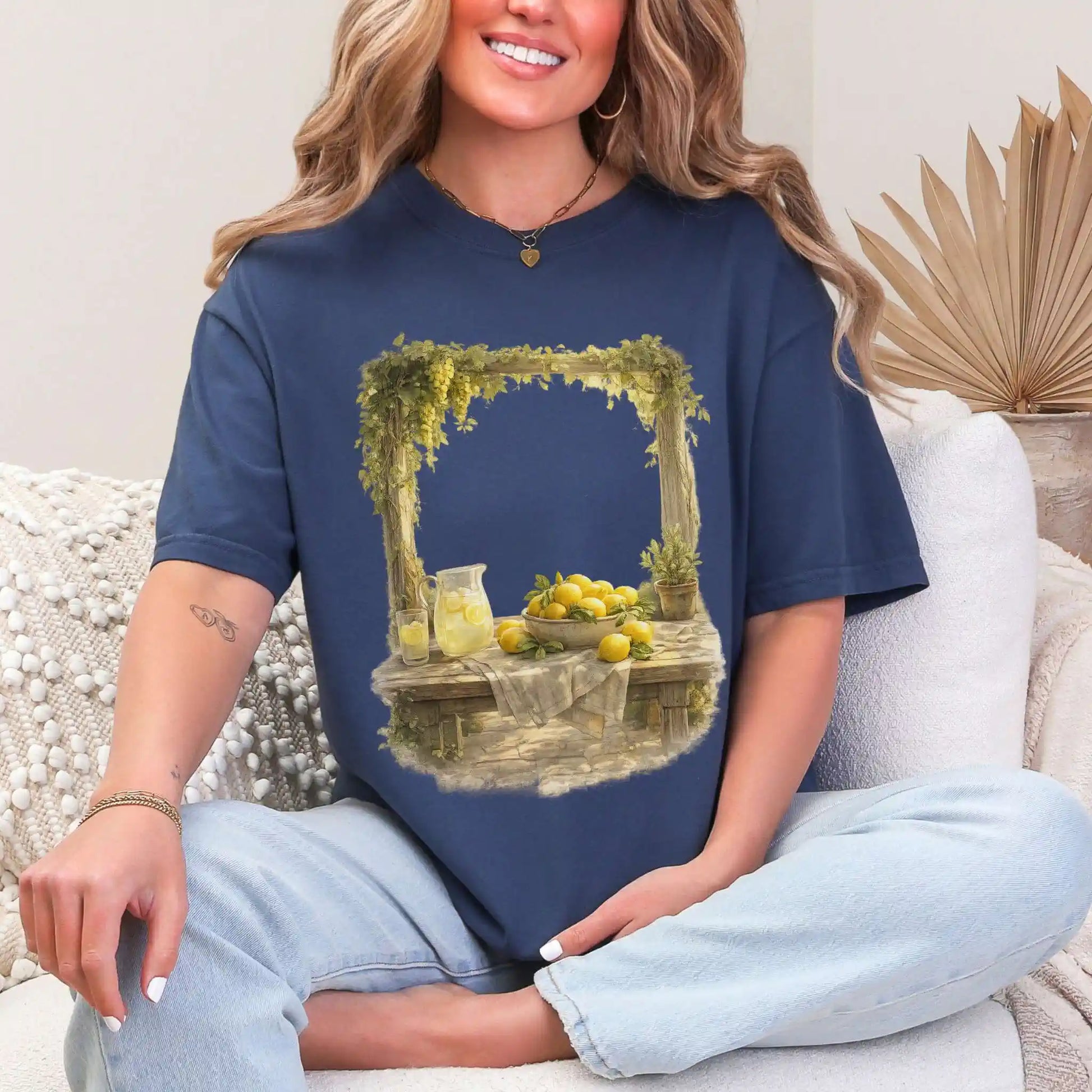 The front features a centered still life illustration of lemons arranged on a rustic table with soft greenery and a glass pitcher filled with lemonade, rendered in a vintage-inspired, painterly style. This t-shirt features a front center design and offers an easy, timeless feel that works beautifully year-round.