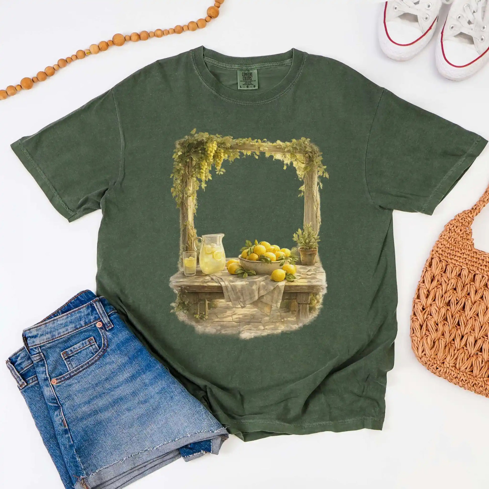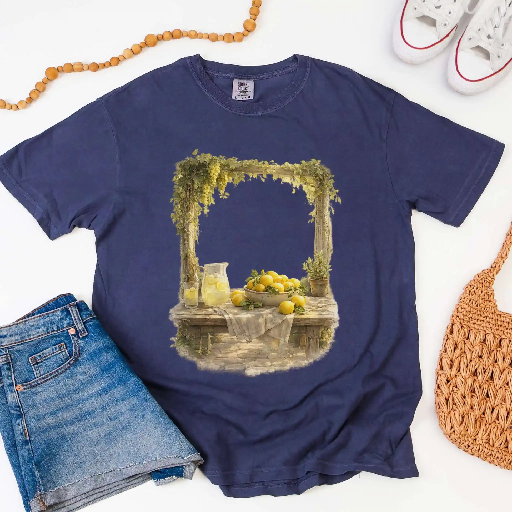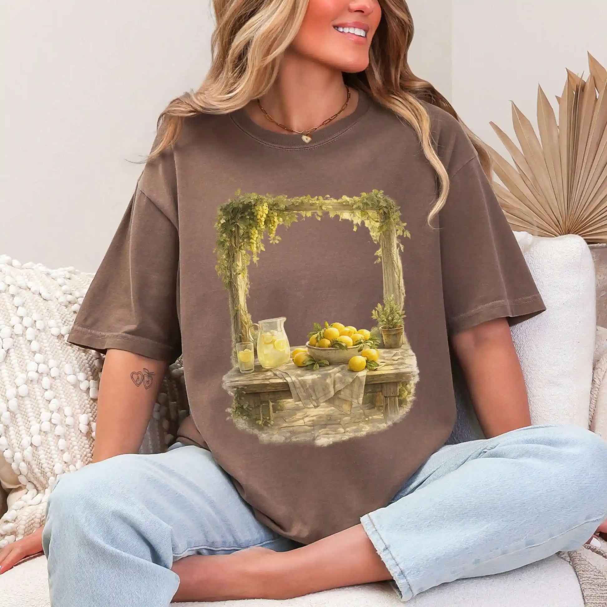 The front features a centered still life illustration of lemons arranged on a rustic table with soft greenery and a glass pitcher filled with lemonade, rendered in a vintage-inspired, painterly style. This t-shirt features a front center design and offers an easy, timeless feel that works beautifully year-round.