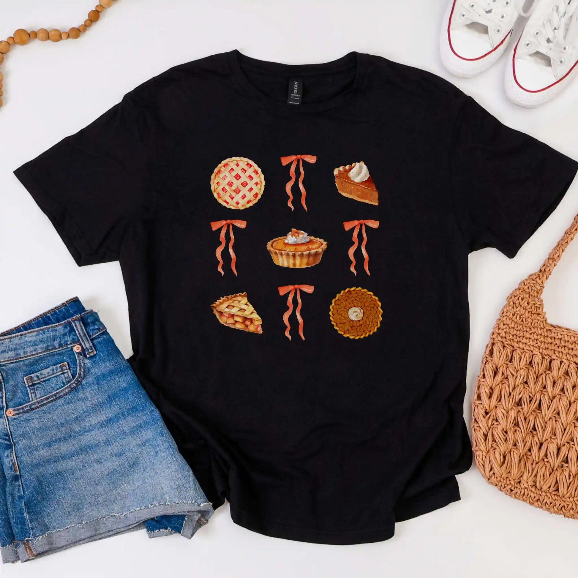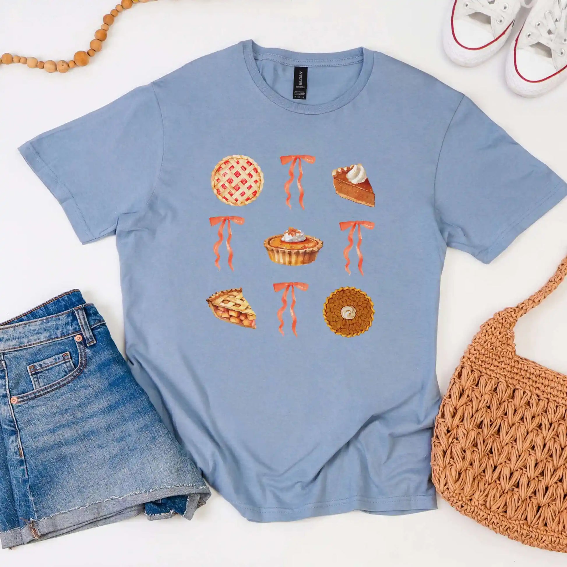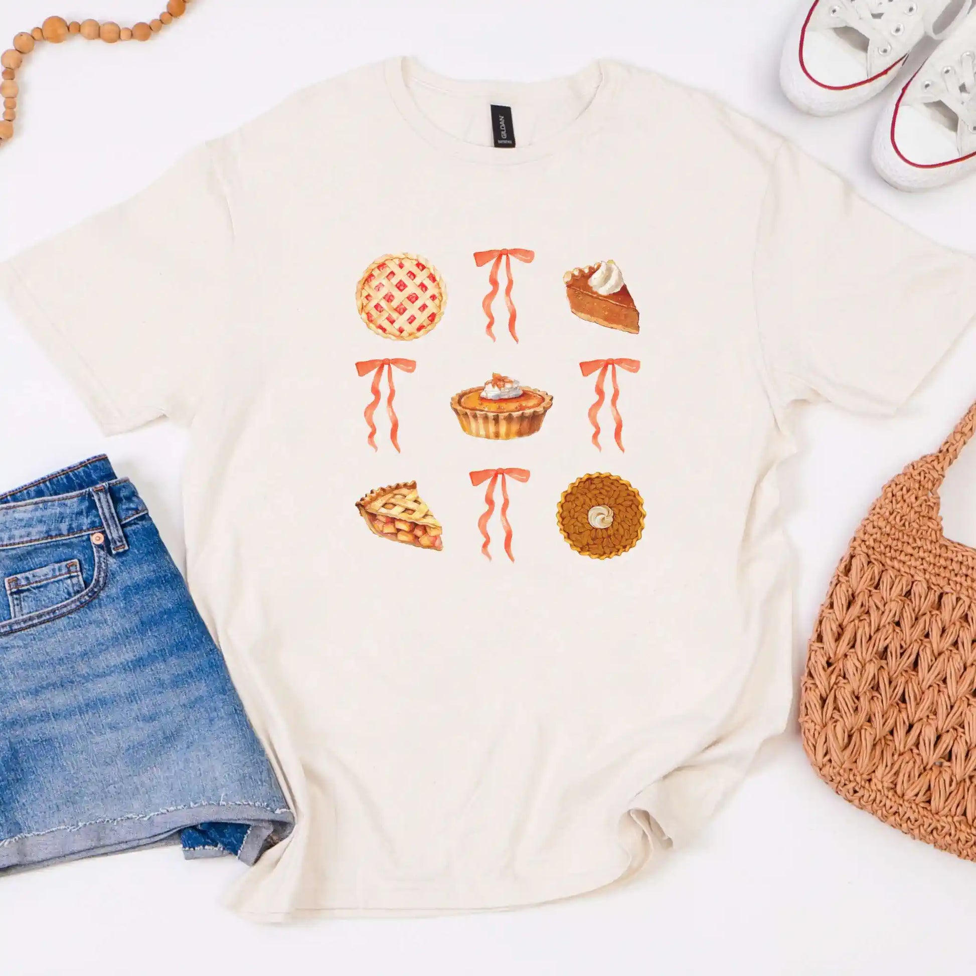 Features a charming front design of hand-painted pies framed with playful red ribbons. Printed on a classic t-shirt, it’s perfect for holiday baking days, family dinners, or simply wearing your love of dessert all season long.