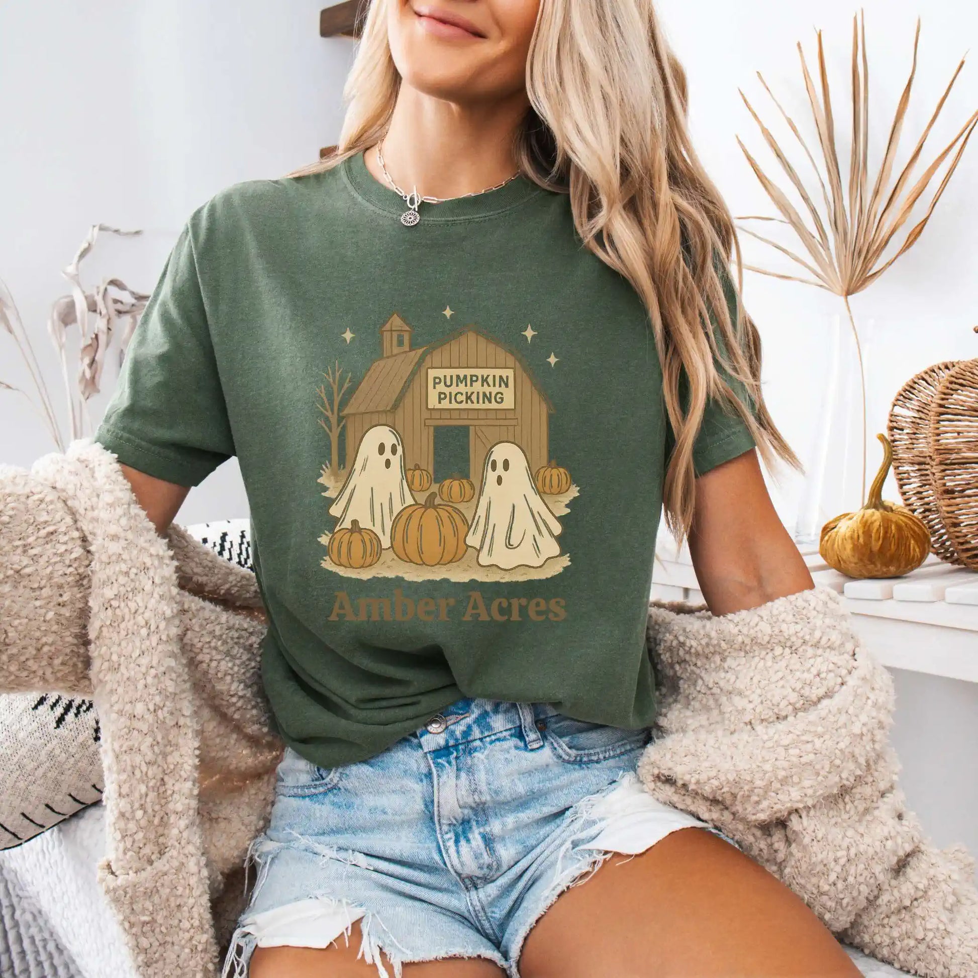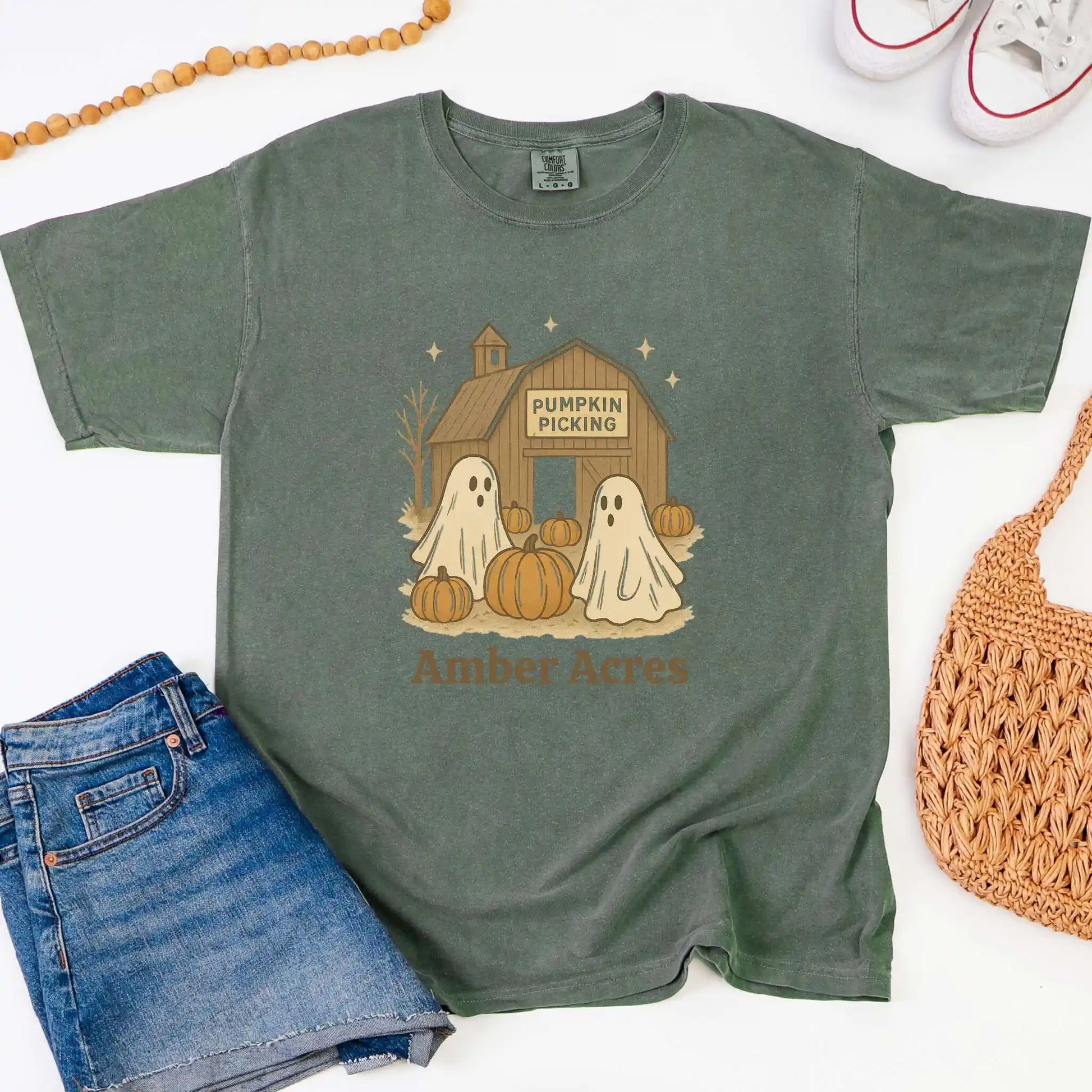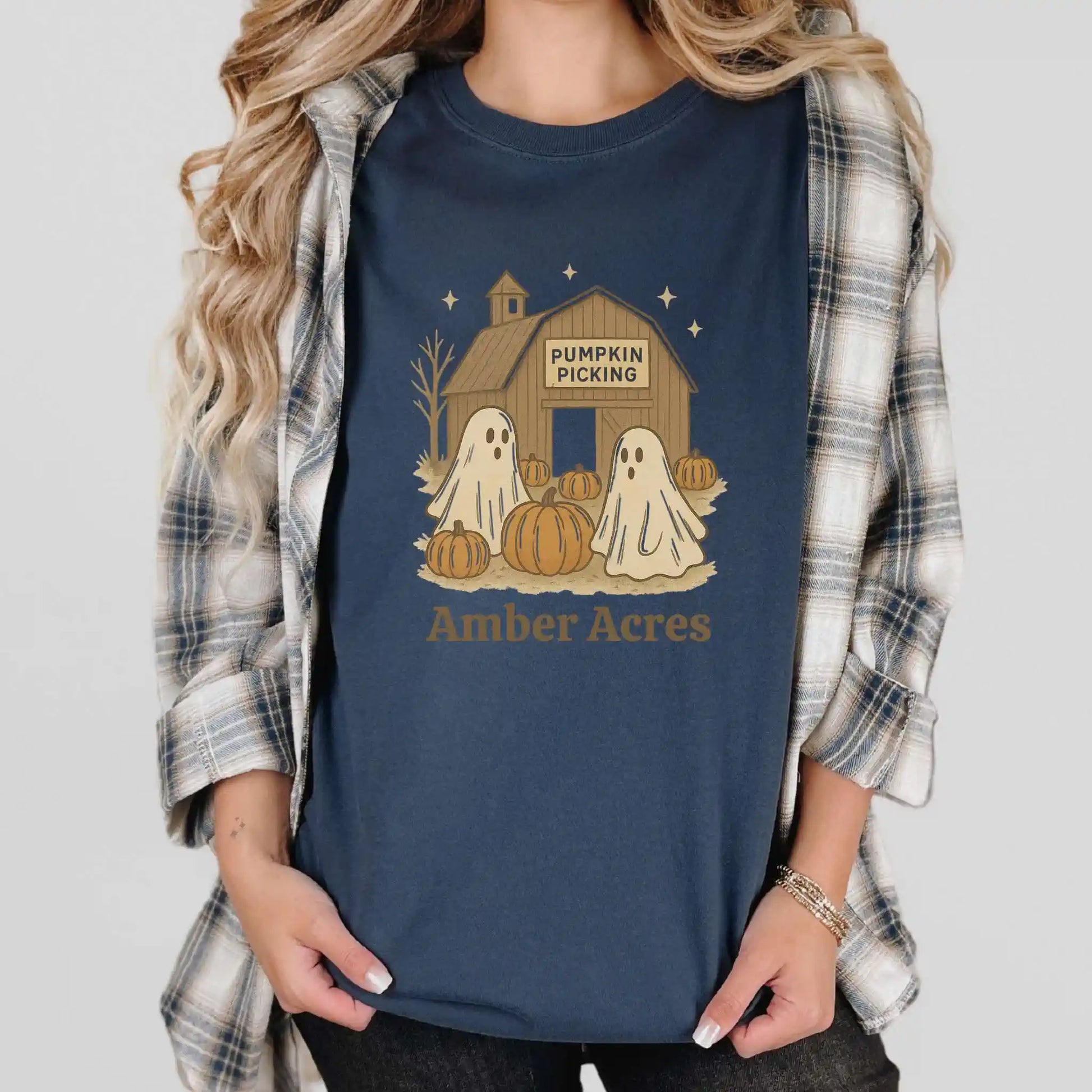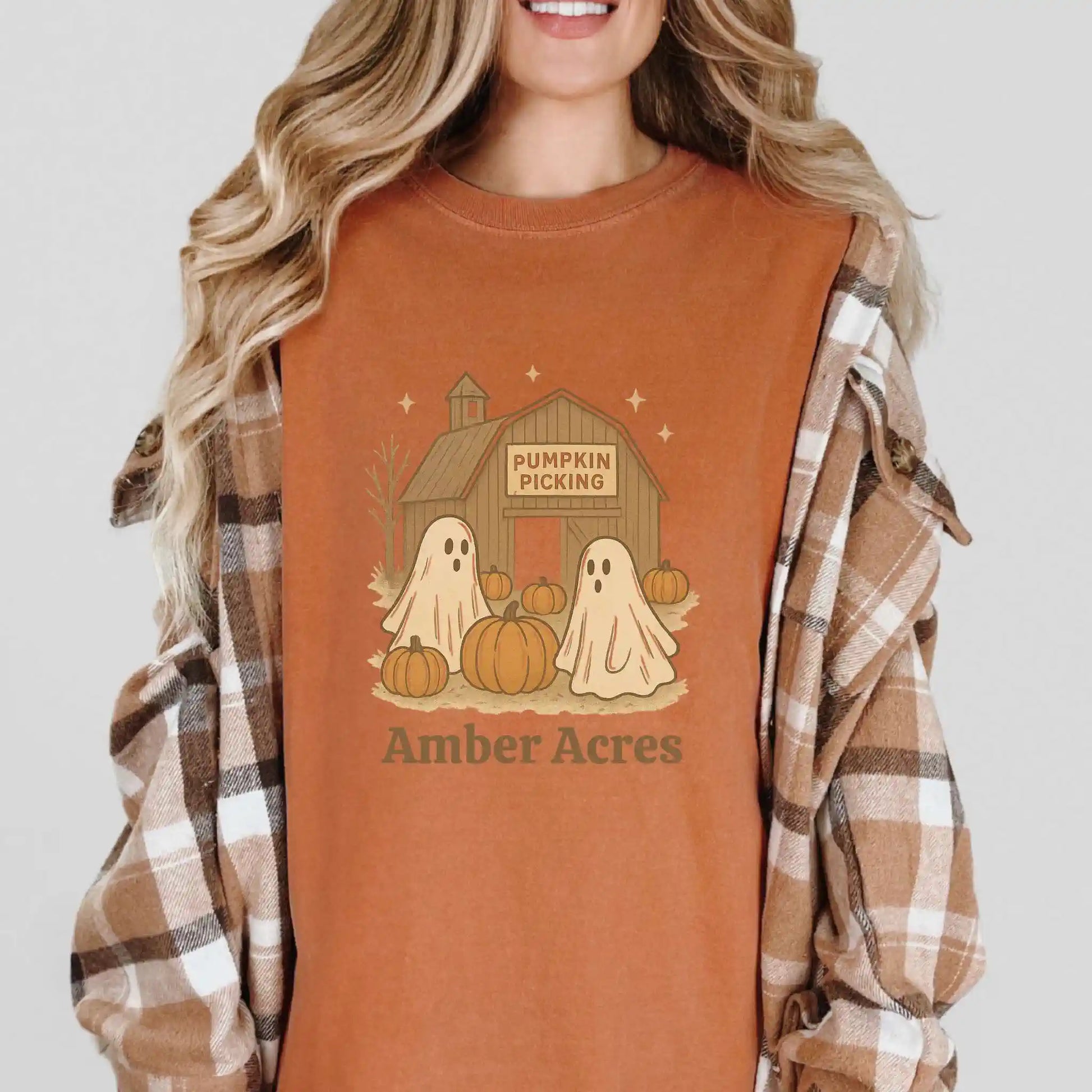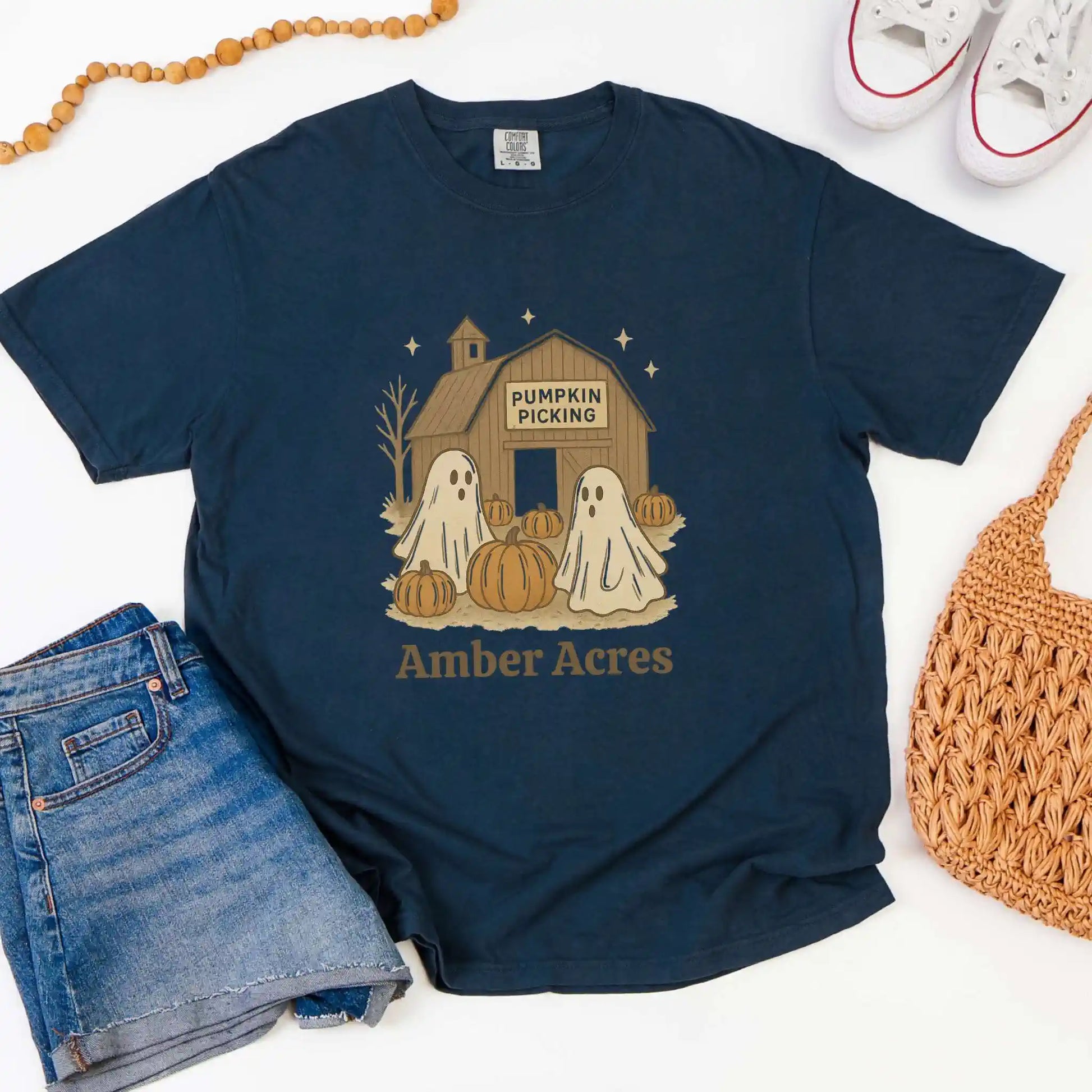 Features a front graphic of “Amber Acres” with two friendly ghosts exploring a barnyard pumpkin patch under a “Pumpkin Picking” sign. Printed on the front of a t-shirt, this design is ideal for pumpkin patch trips, fall festivals, or anyone who loves the charm of a crisp autumn afternoon.