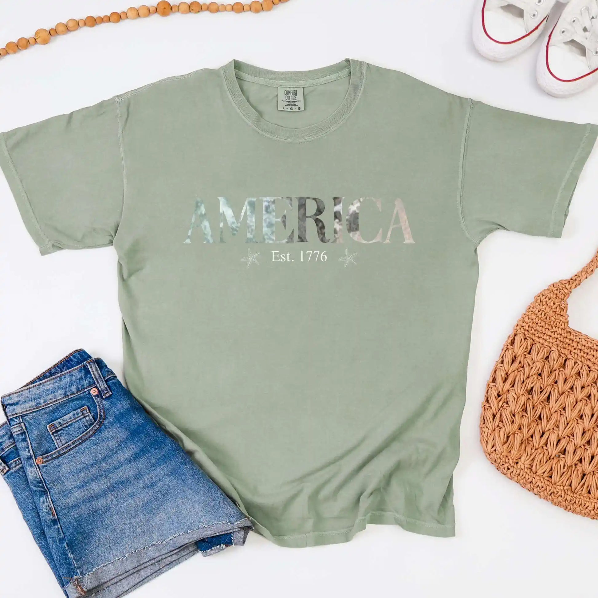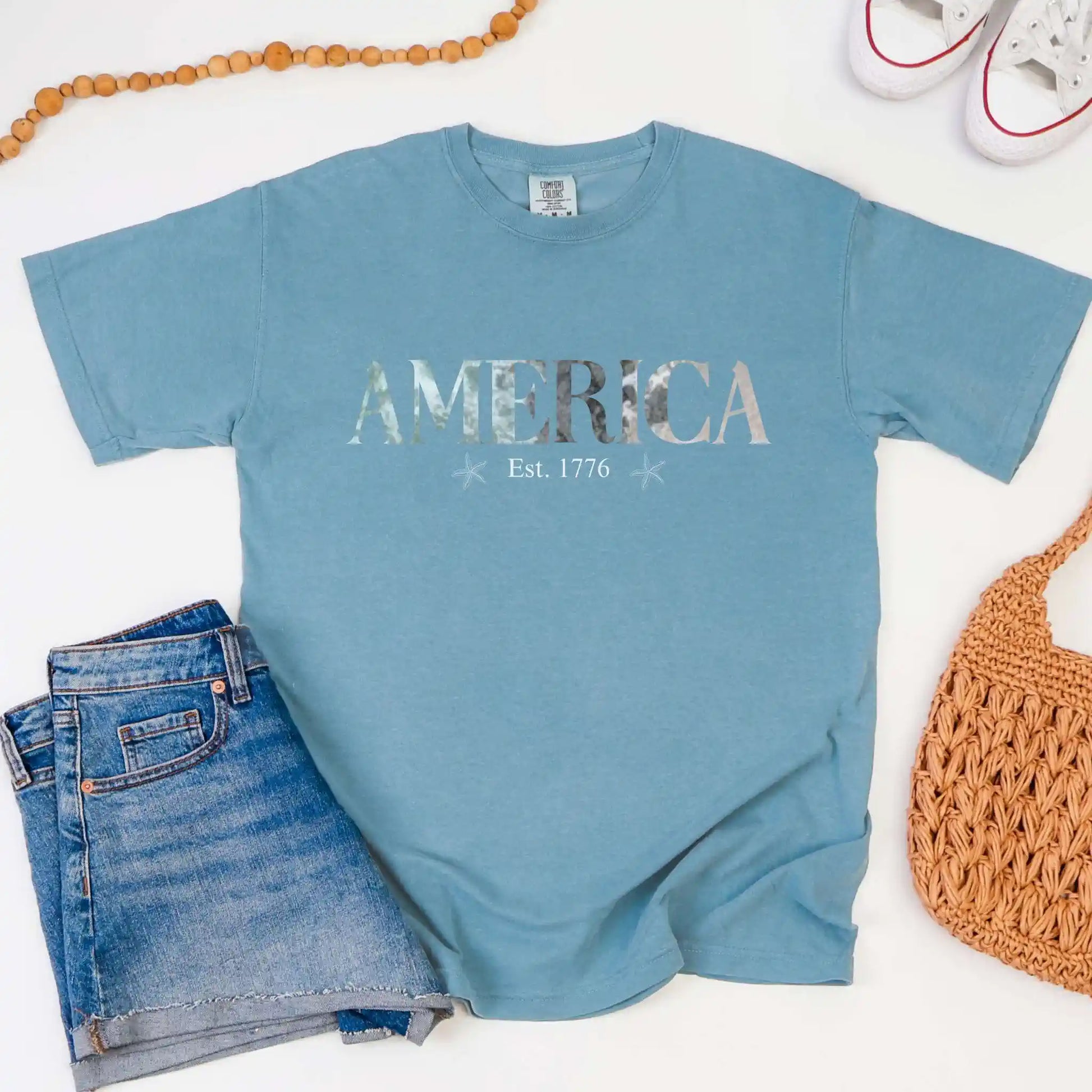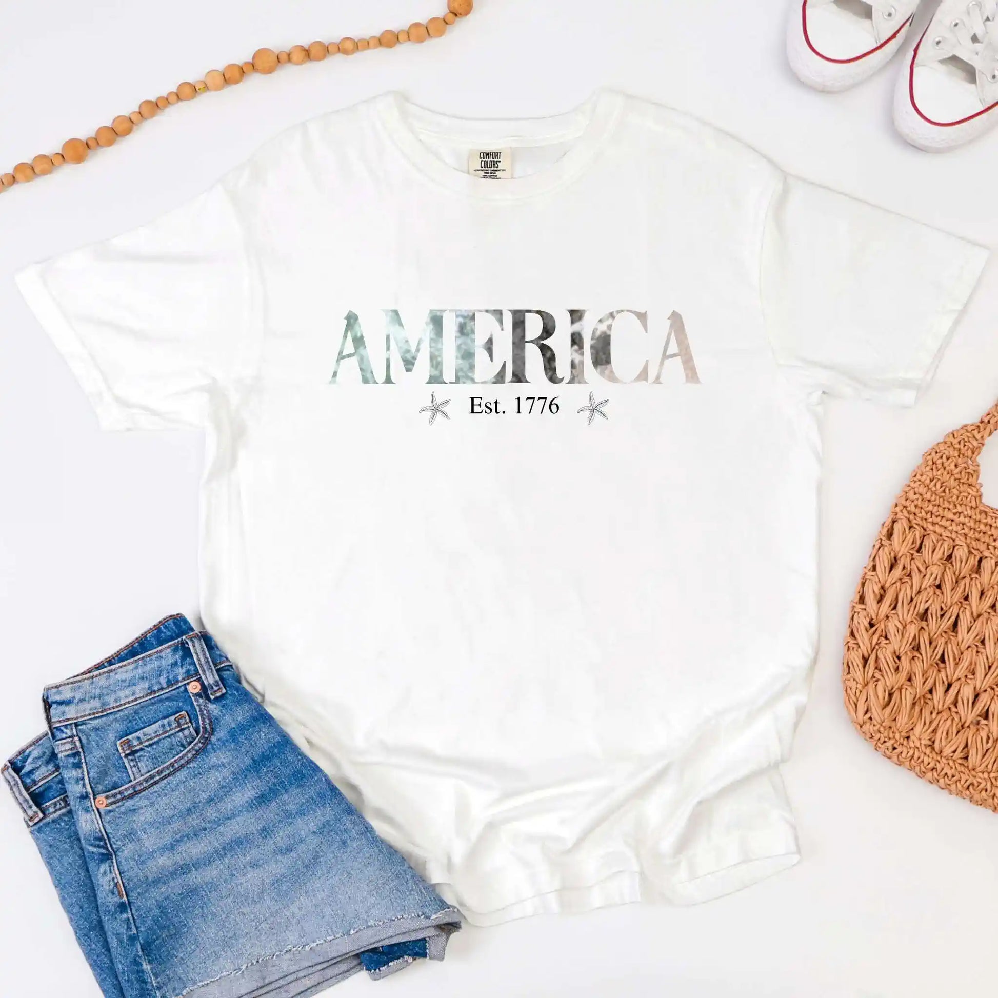Front Design of "AMERICA Est. 1776" featuring a faded, beach-inspired texture within the lettering and delicate starfish accents. It's a perfect blend of American pride and relaxed, coastal vibes.