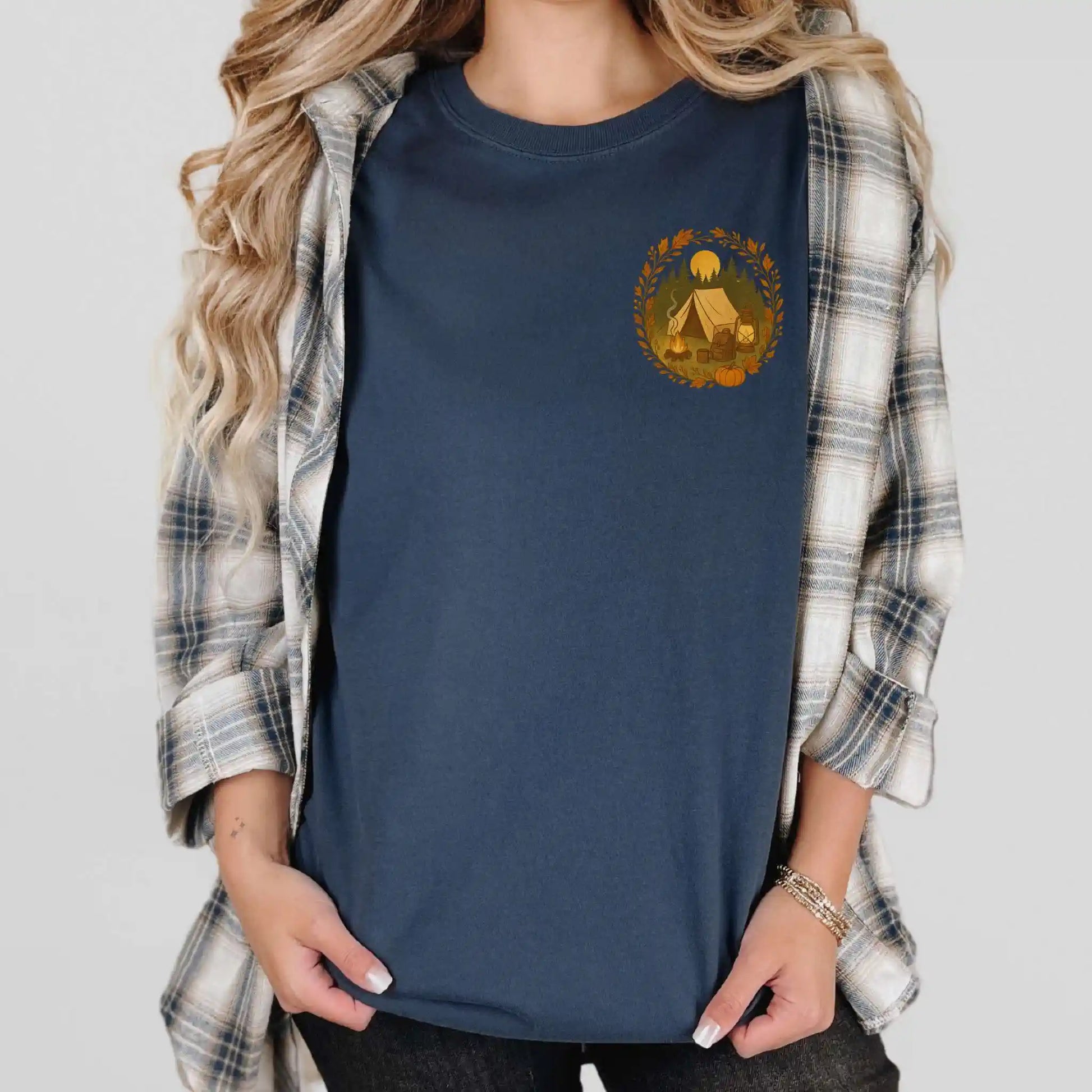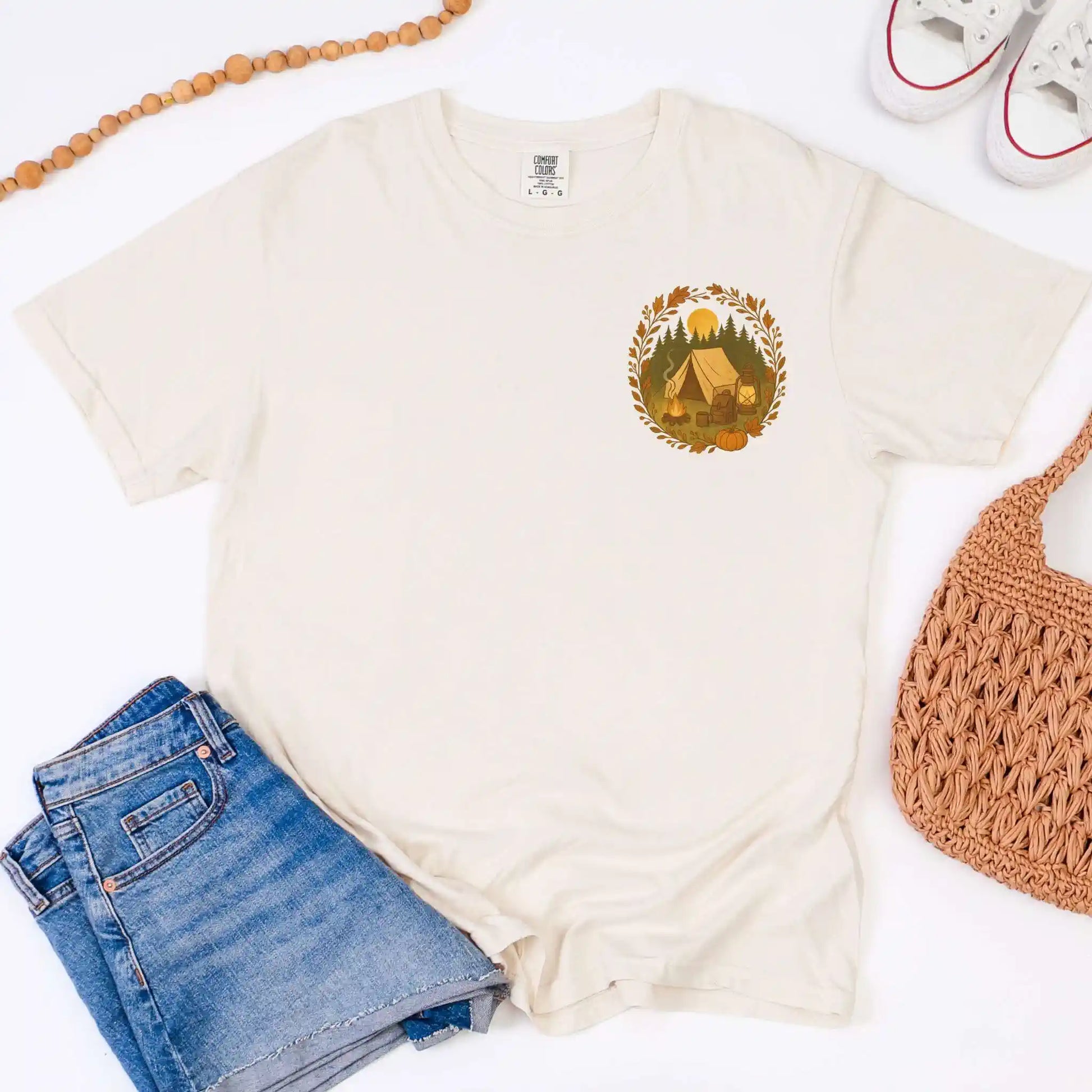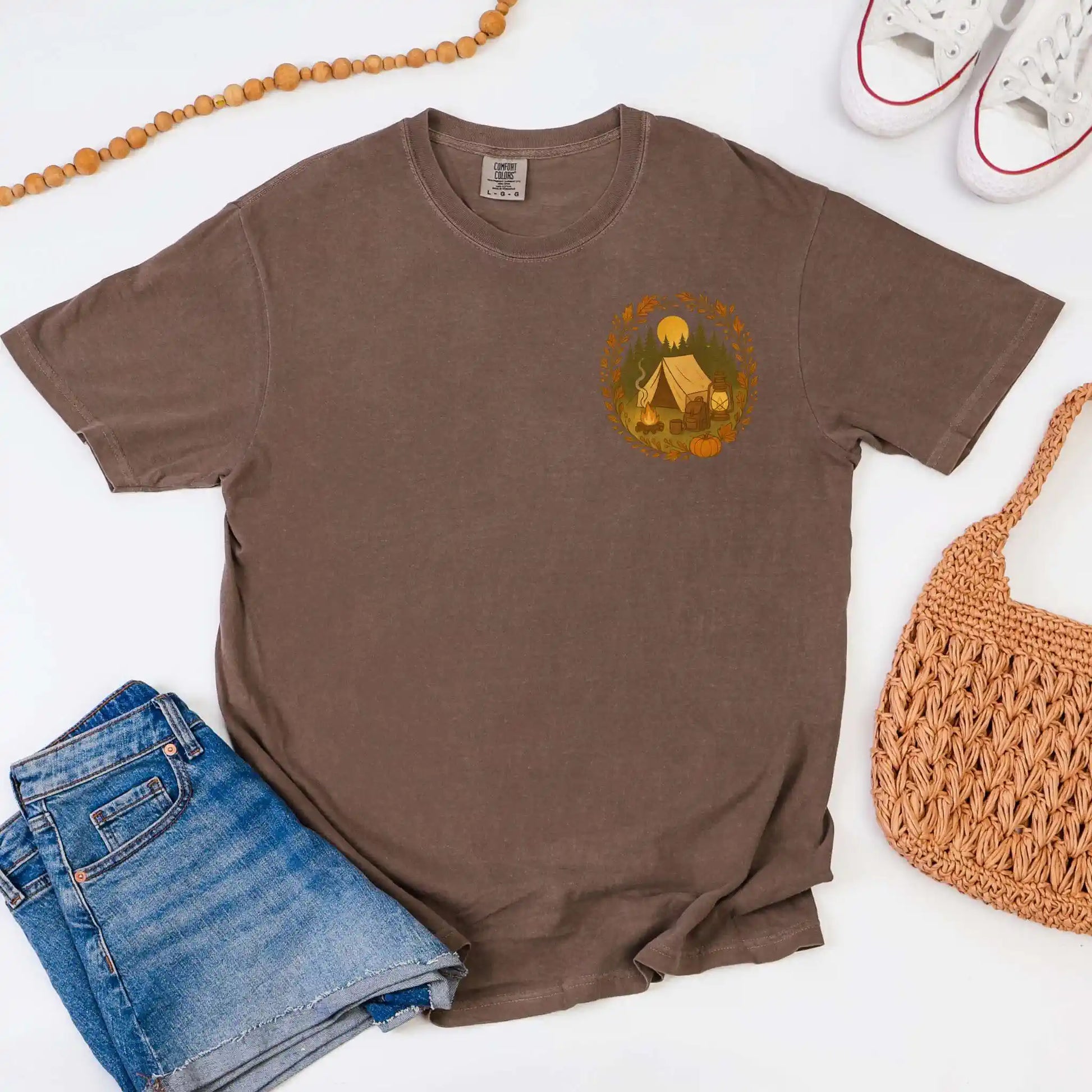 The front design features a rustic camping scene framed by fall foliage: a pitched tent, glowing lantern, and flickering fire beneath the forest treeline. Printed on the front of this t-shirt, it’s perfect for autumn weekends, camping trips, or simply bringing those outdoorsy vibes into everyday wear.