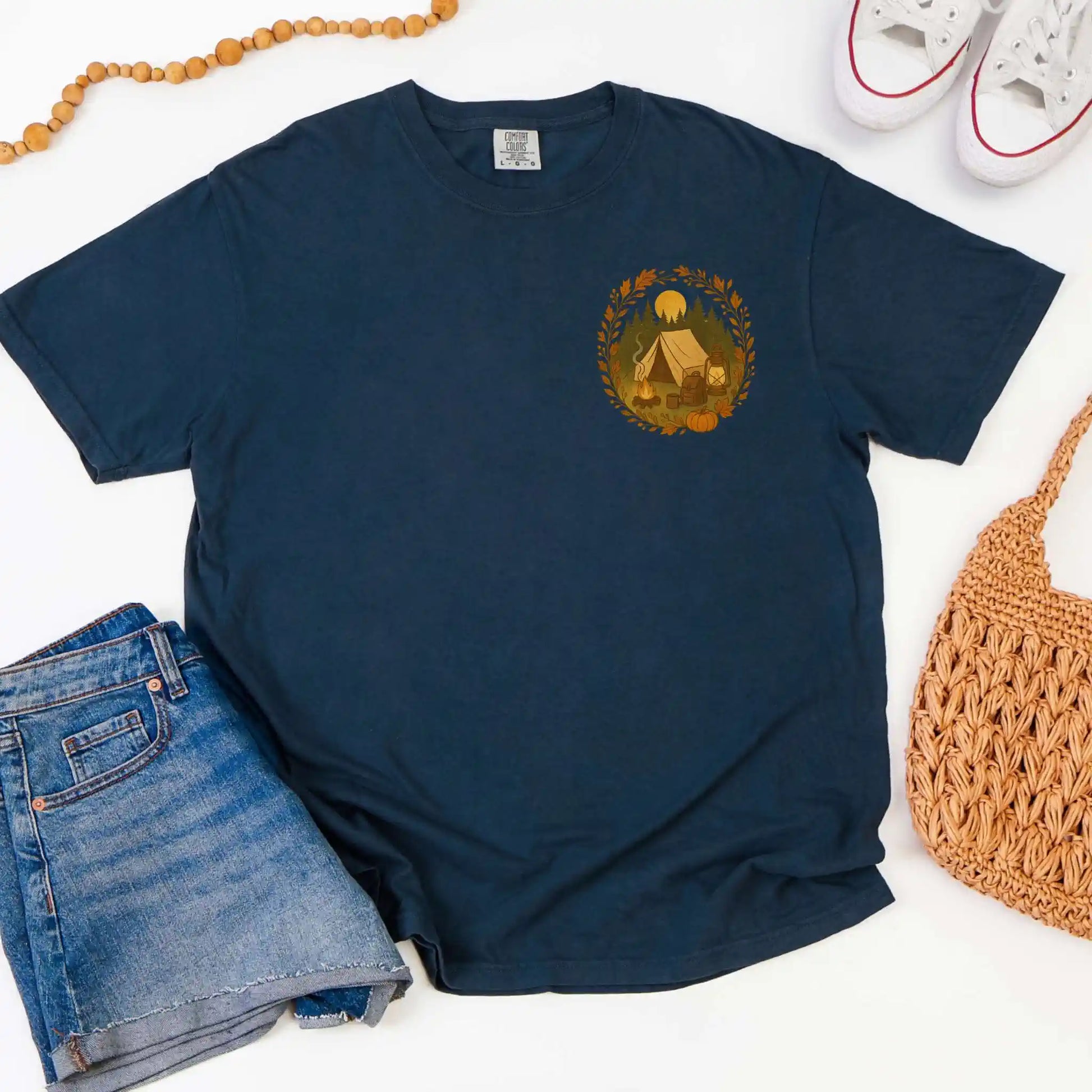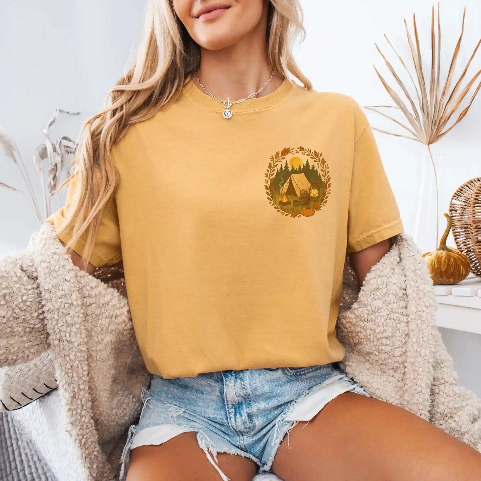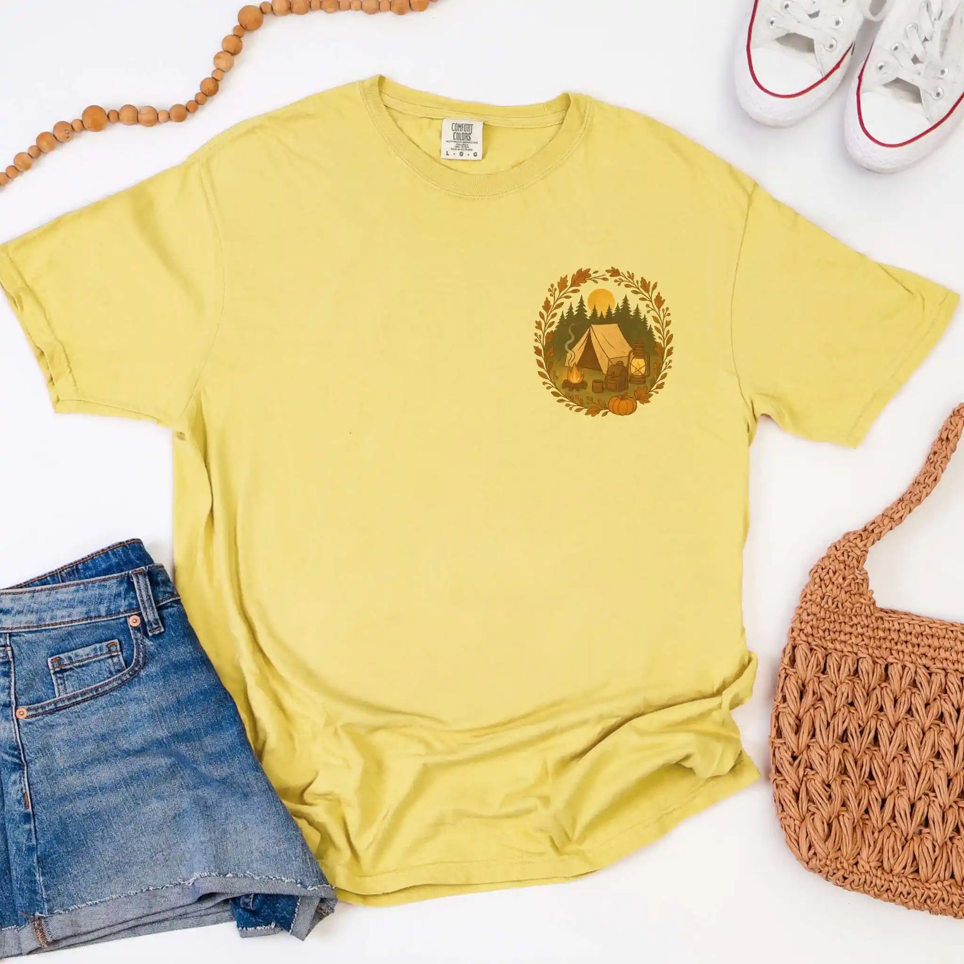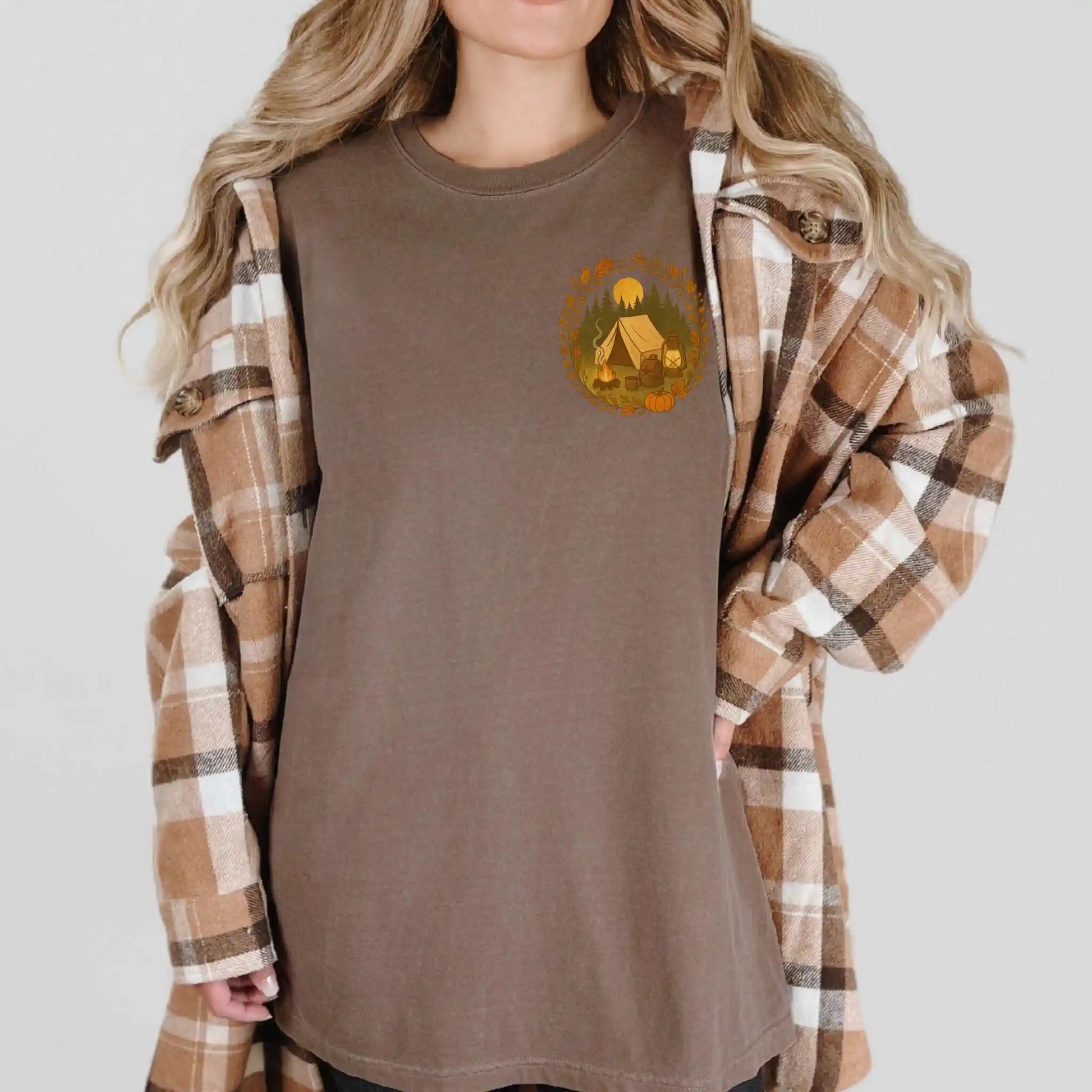 The front design features a rustic camping scene framed by fall foliage: a pitched tent, glowing lantern, and flickering fire beneath the forest treeline. Printed on the front of this t-shirt, it’s perfect for autumn weekends, camping trips, or simply bringing those outdoorsy vibes into everyday wear.