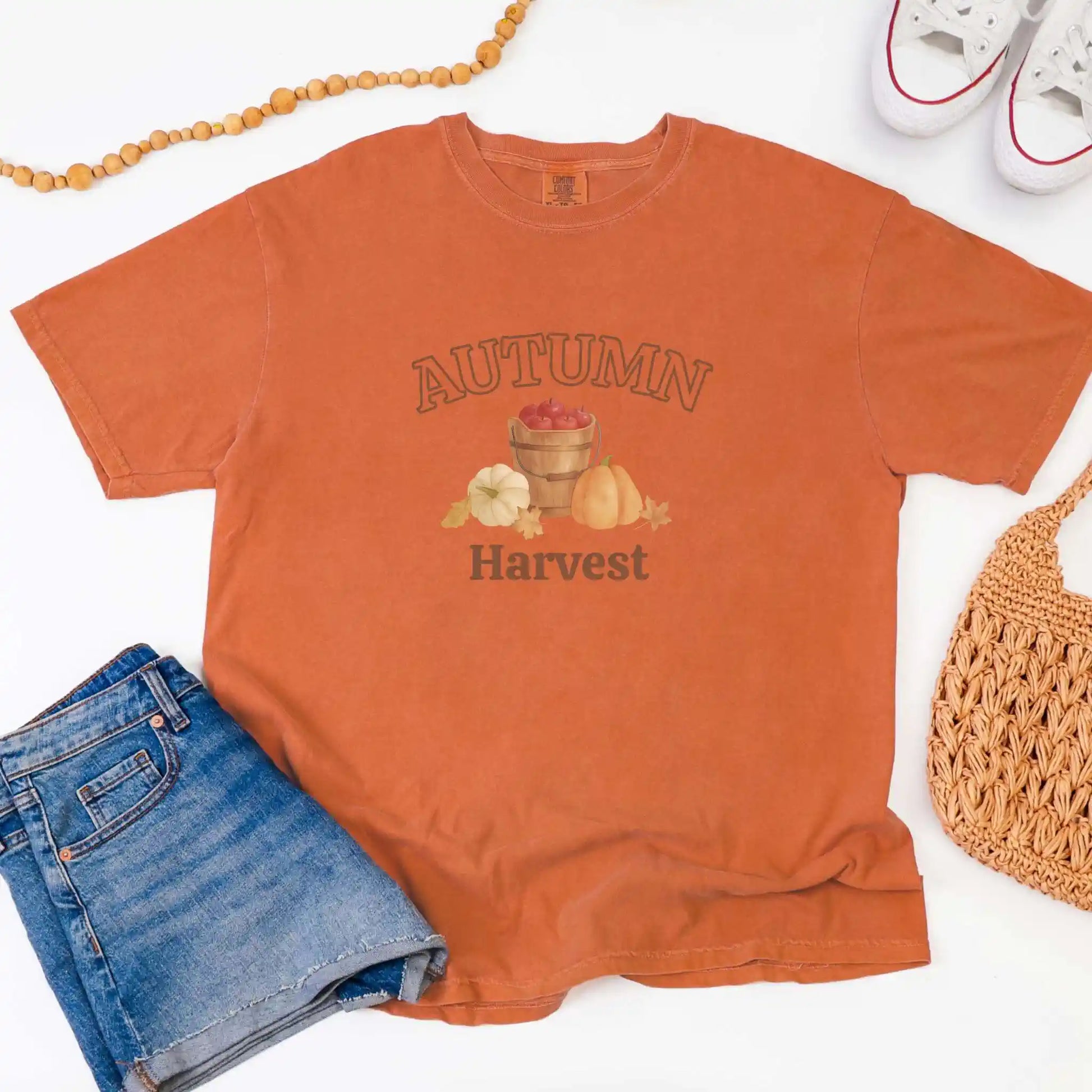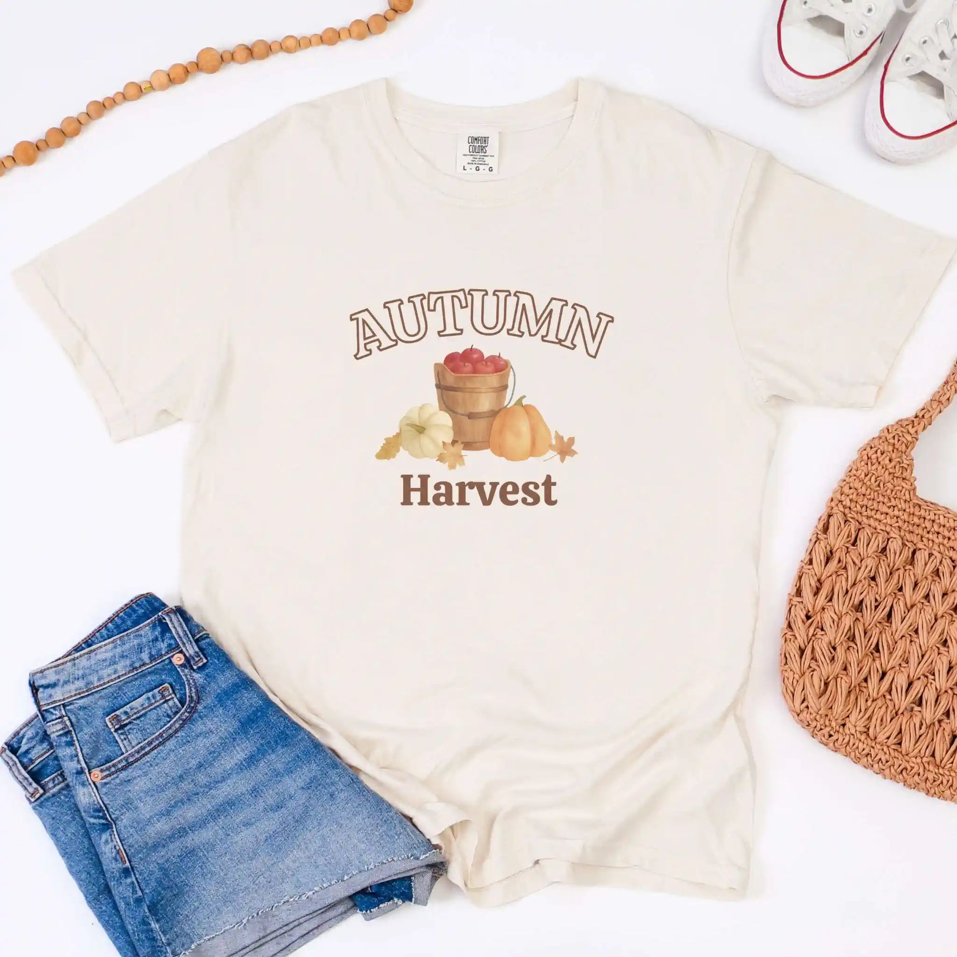 The front graphic showcases a rustic wooden bucket overflowing with apples, surrounded by pumpkins and scattered leaves. Placed front and center on the t-shirt, it’s an inviting design perfect for apple picking trips, pumpkin patch visits, or savoring the slow beauty of fall days.