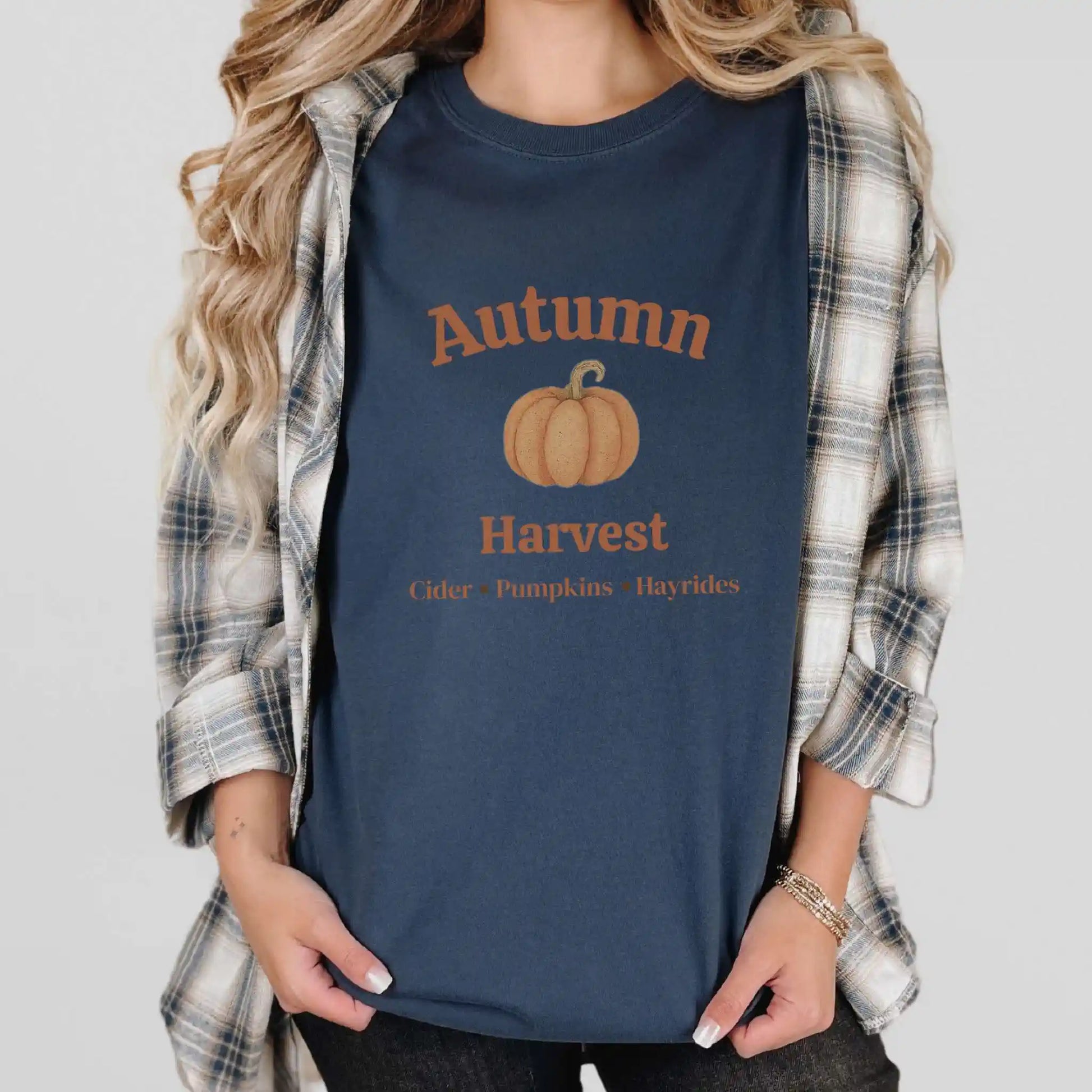 Featuring bold lettering and a classic pumpkin centerpiece, this graphic sits front and center on the t-shirt. With a seasonal tagline of “Cider • Pumpkins • Hayrides,” it’s the perfect companion for weekend outings, pumpkin patches, and all your favorite fall traditions.