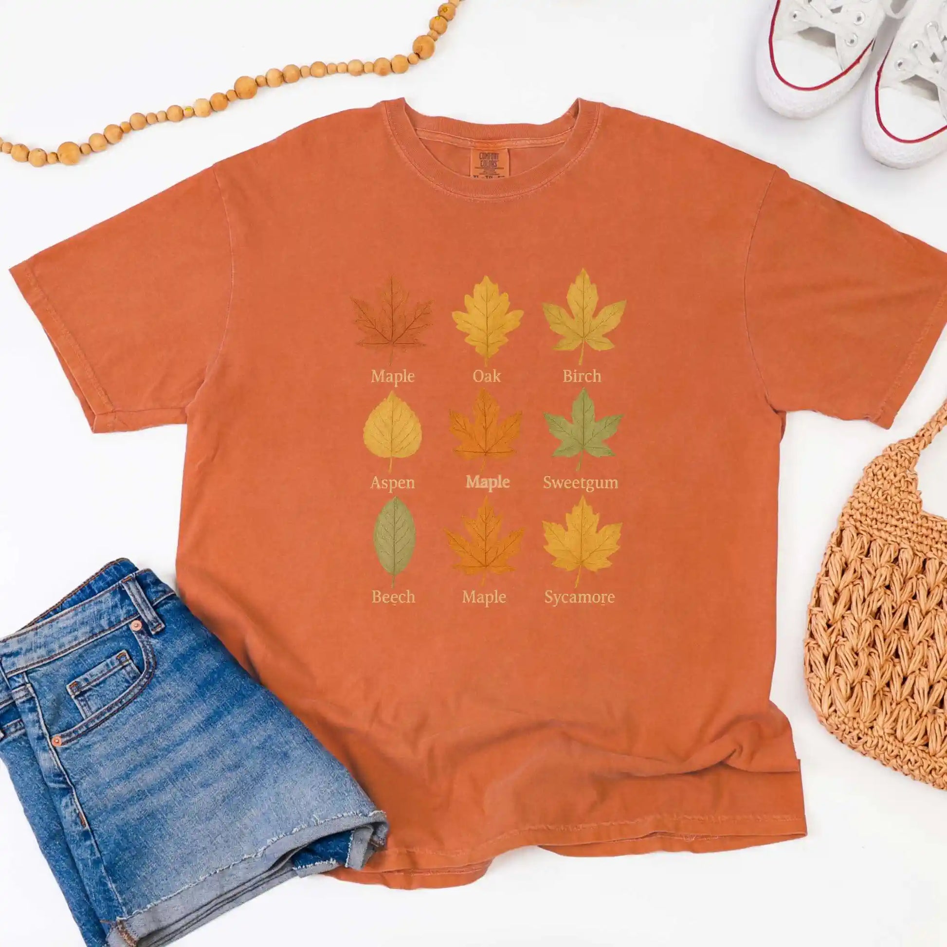 Features detailed drawings of nine leaves, including Maple, Oak, Birch, Beech, and Sycamore. Printed on the front of a t-shirt, this design is perfect for nature walks, autumn getaways, or cozy evenings by the fire.