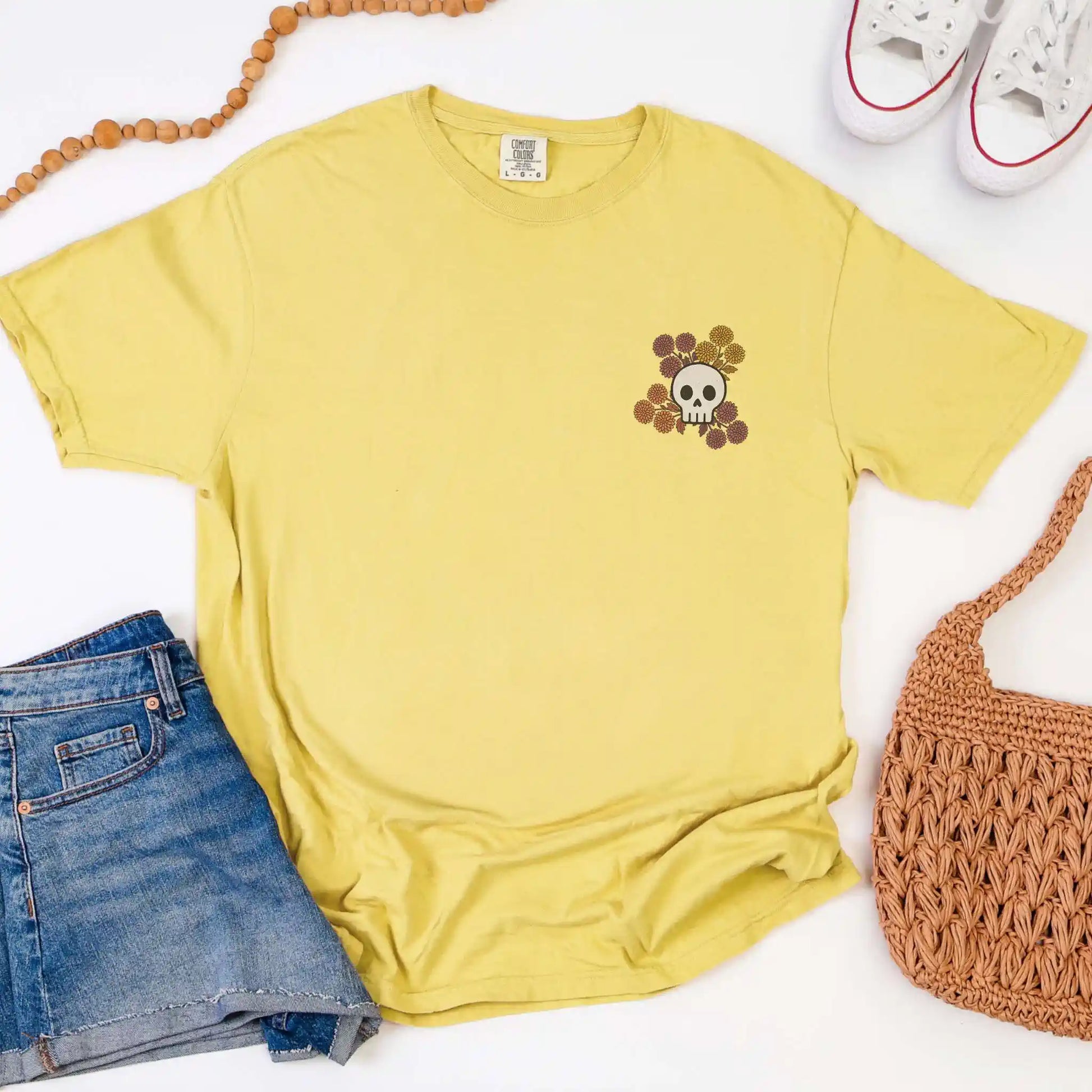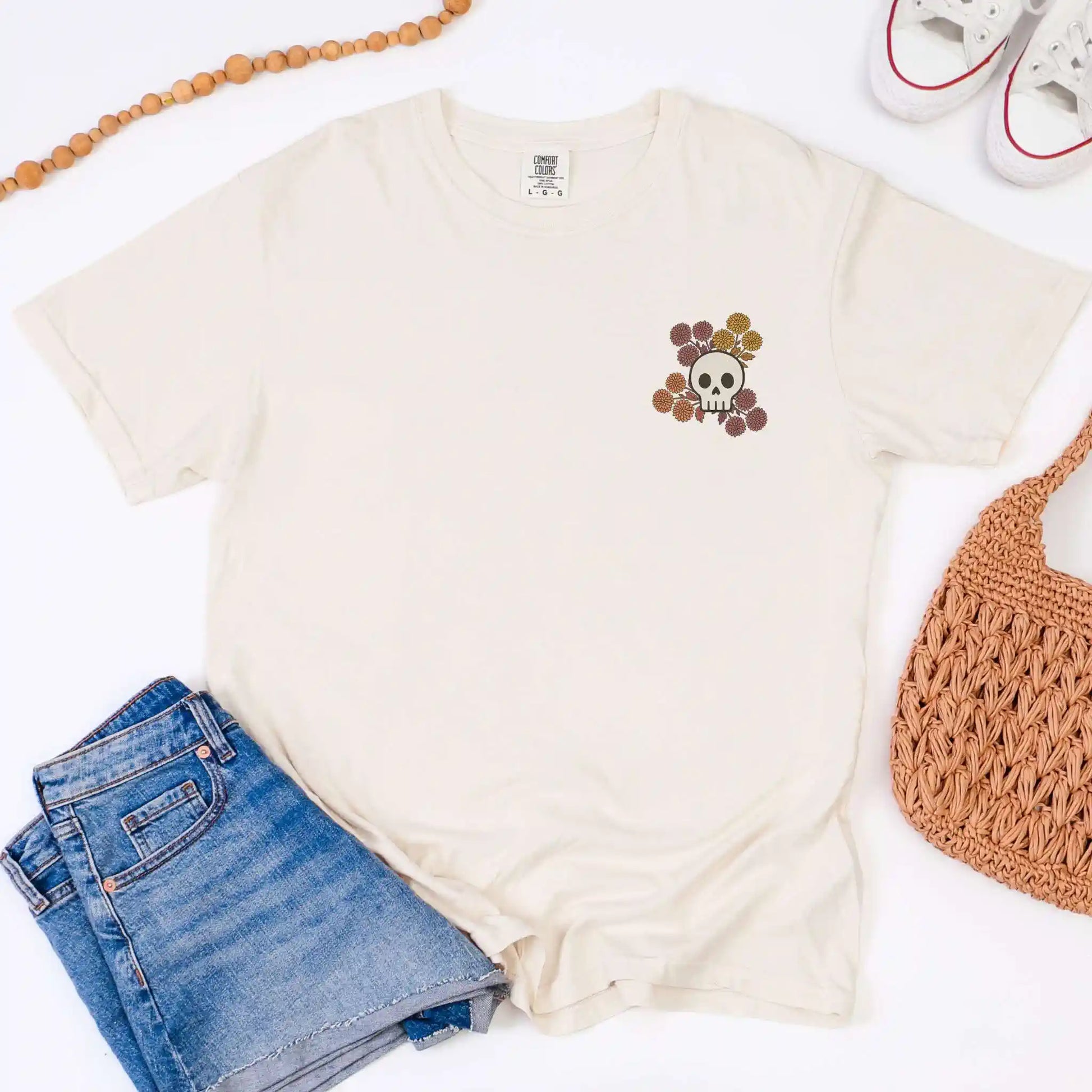 The front design features a skull framed by blooming mums in autumn hues, a nod to both Halloween and harvest traditions. Printed on a classic t-shirt, it’s ideal for pumpkin patch visits, fall festivals, or simply enjoying crisp evenings with a touch of seasonal style.