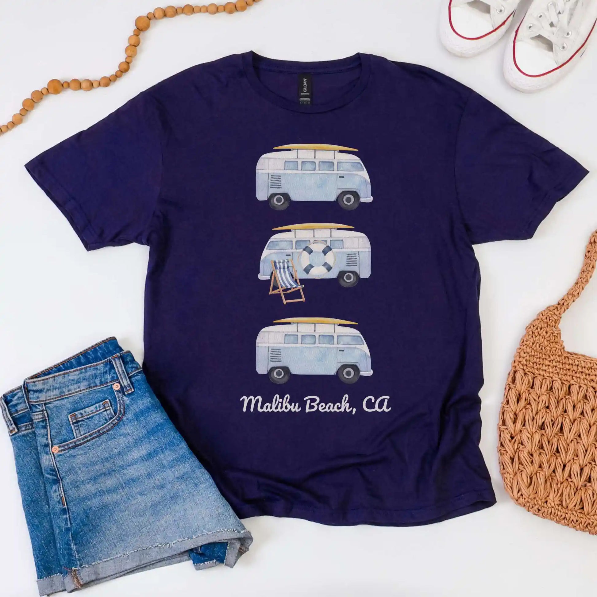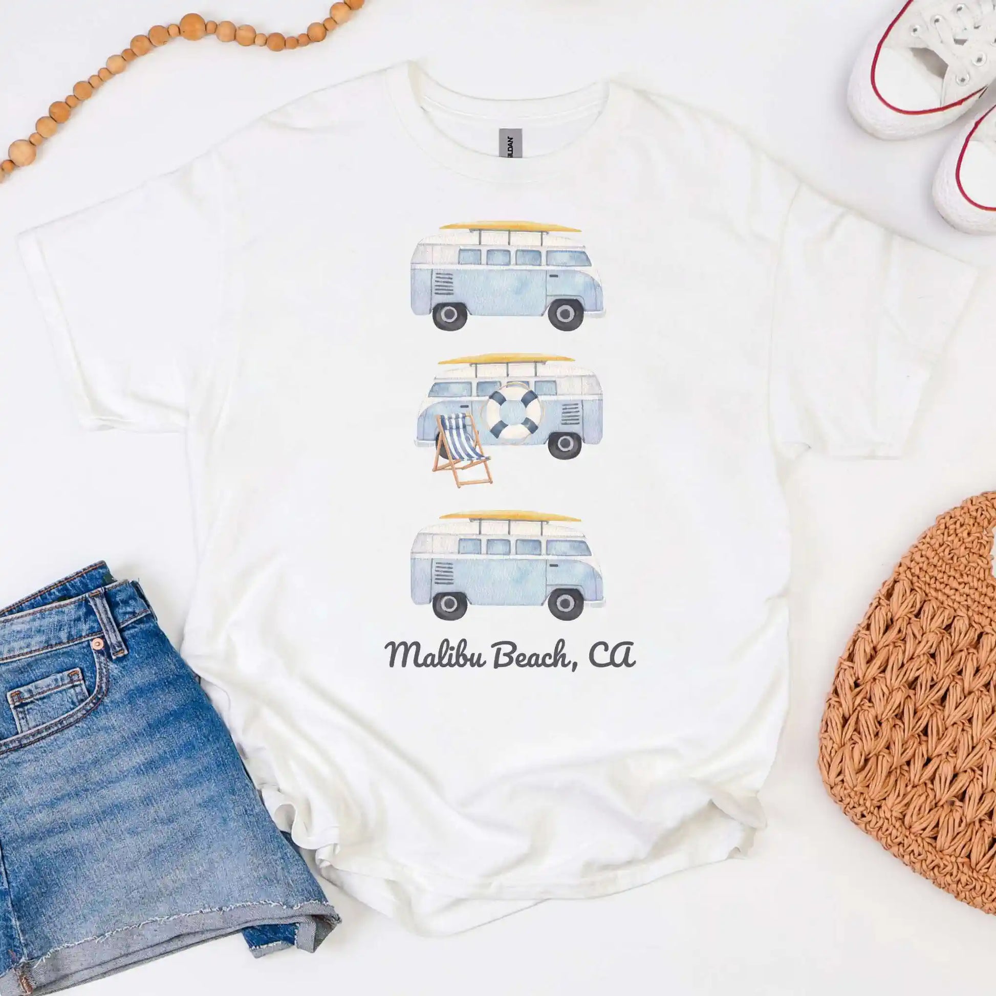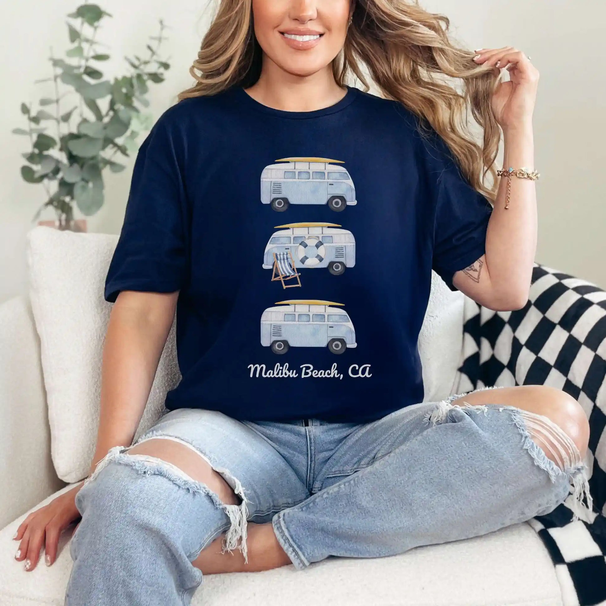 Featuring a soft front design of a classic beach van parked along the Malibu coast, this shirt captures the easygoing charm of golden-hour drives and salty air.