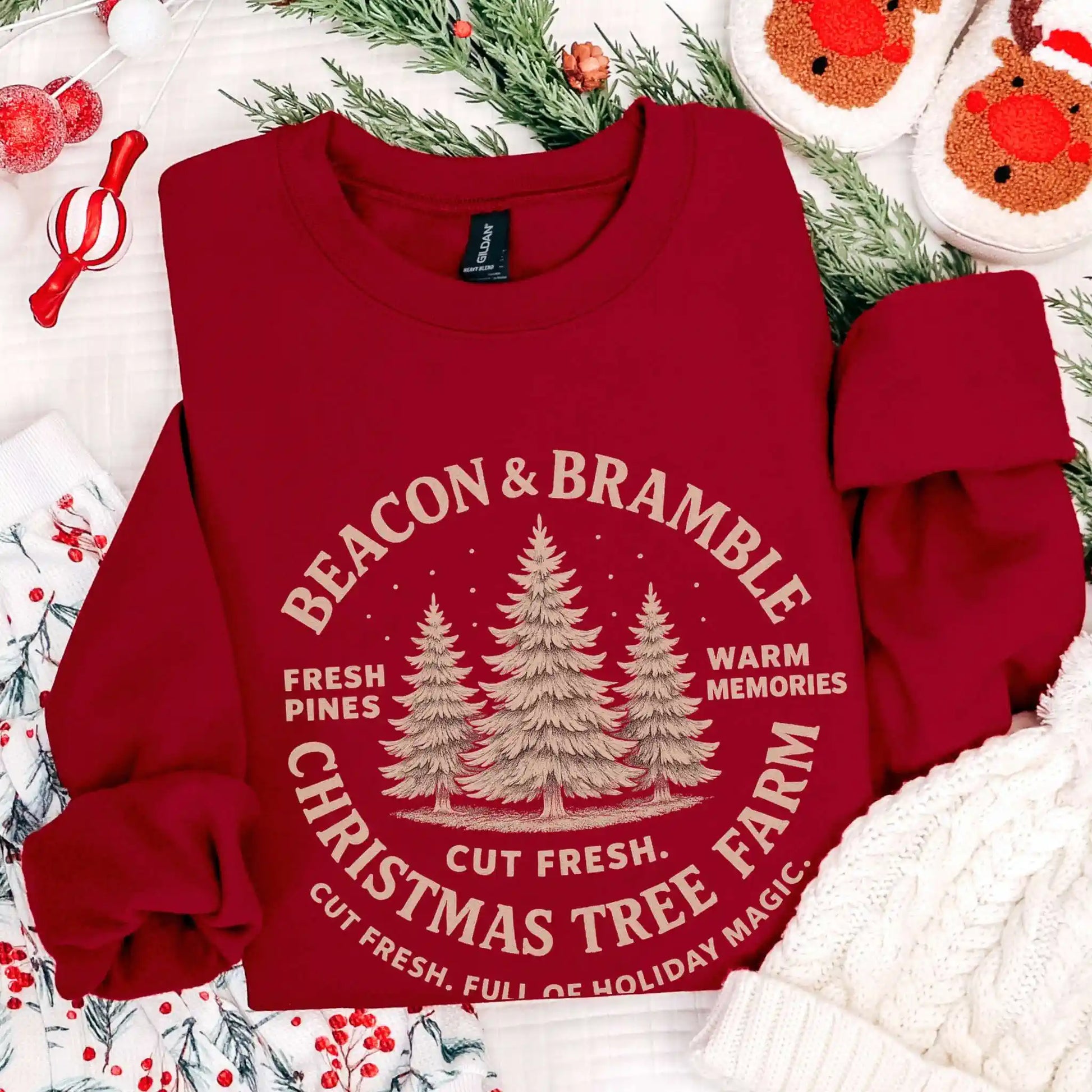 Our “Beacon & Bramble Christmas Tree Farm” sweatshirt brings that nostalgic, cozy holiday spirit to life. Featuring a vintage-style tree farm graphic with fresh pines and festive typography, it’s perfect for those who cherish the simple beauty of the season and the memories made picking out the perfect tree.