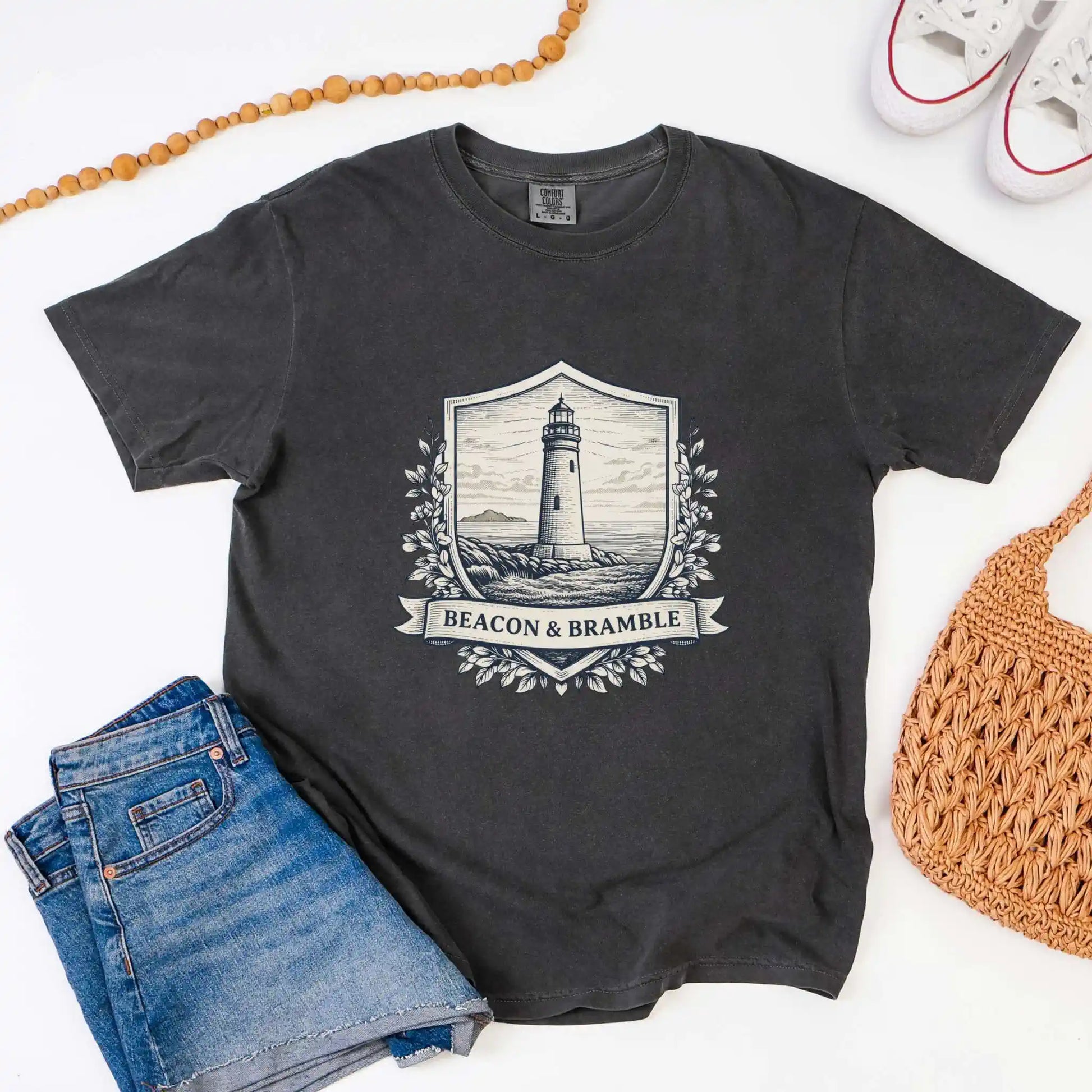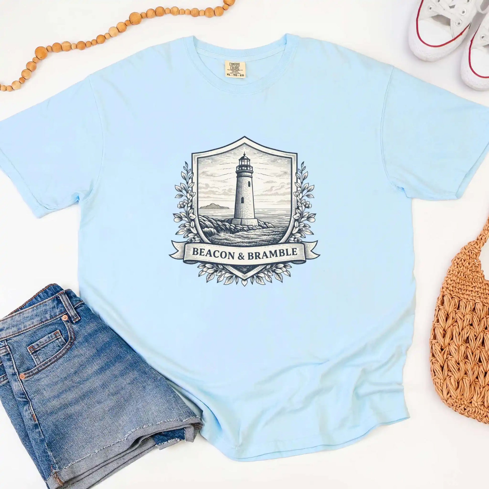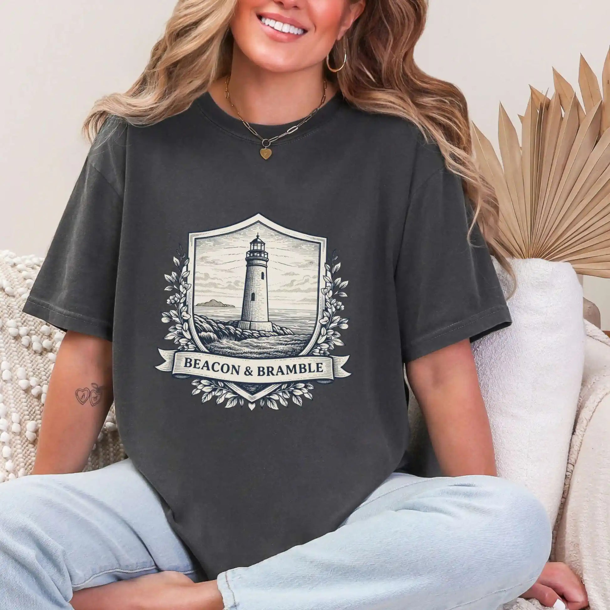 The design features a detailed lighthouse centered within a shield-style crest, framed by leafy branches and a classic banner bearing the Beacon & Bramble name. This front design is printed on a t-shirt and is well suited for everyday wear, coastal walks, or moments that call for something meaningful and enduring.