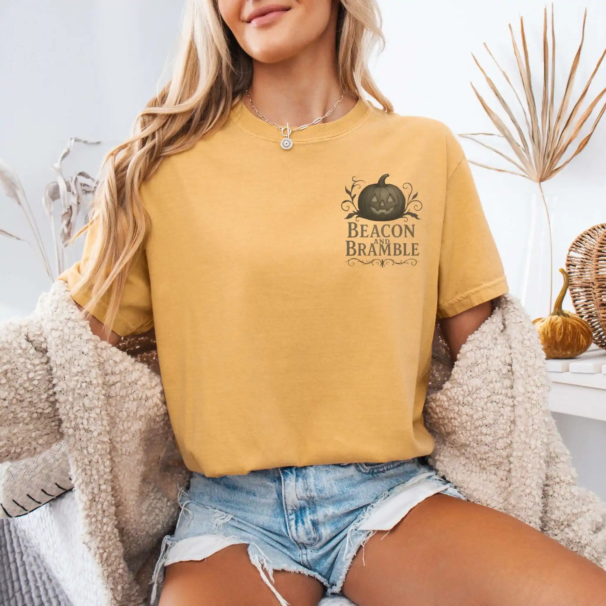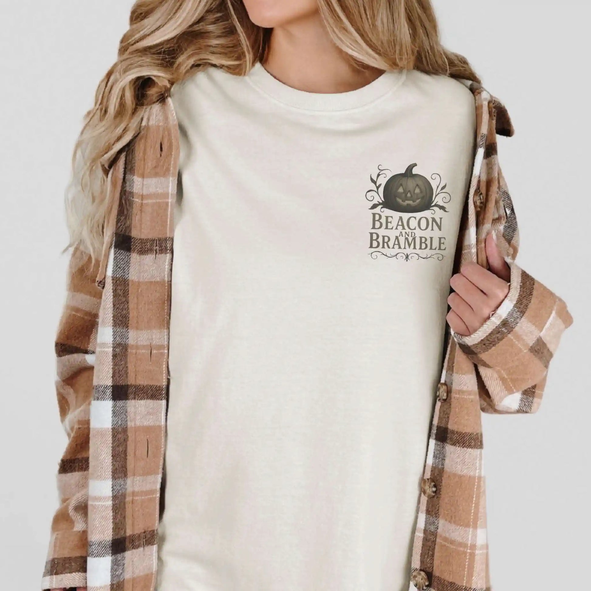 This design highlights the Beacon & Bramble name with a classic jack-o’-lantern emblem. Printed on the front of a timeless t-shirt, it’s perfect for spooky-season lovers, boutique-style Halloween looks, and year-round brand fans.