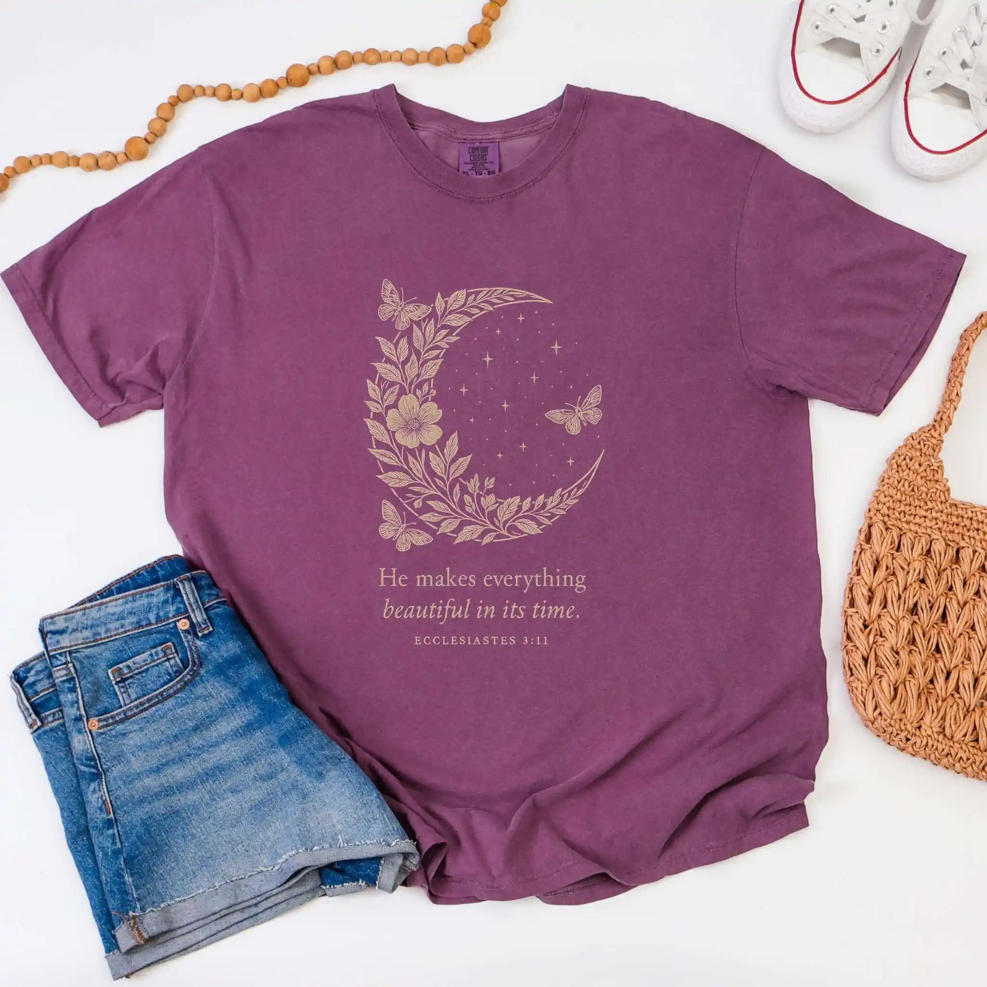 Features a crescent moon adorned with delicate florals and softly illustrated butterflies, surrounded by subtle stars. The phrase “He makes everything beautiful in its time” is paired with Ecclesiastes 3:11. This t-shirt features a front centered design and is perfect for gentle encouragement, reflection, or everyday wear with meaning.