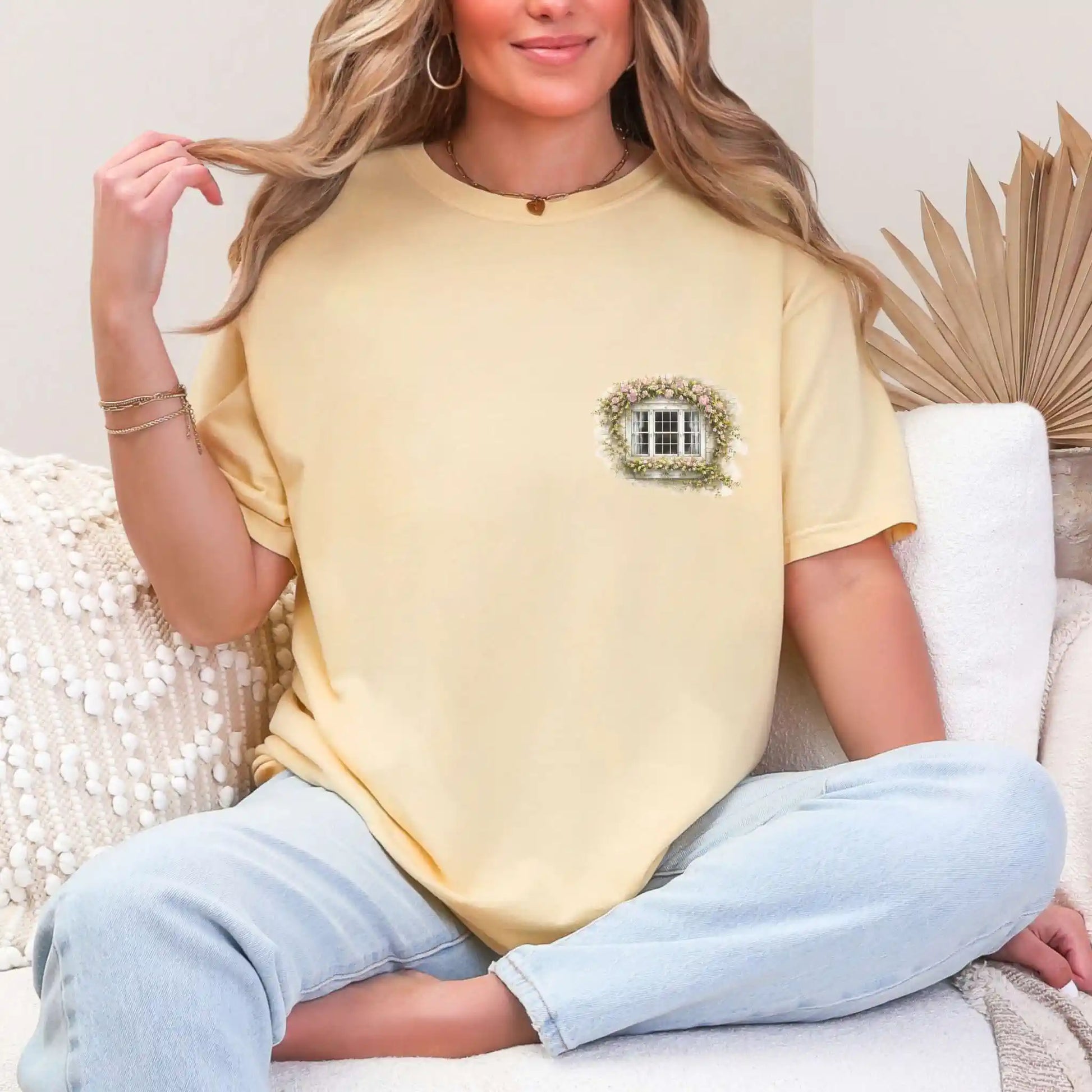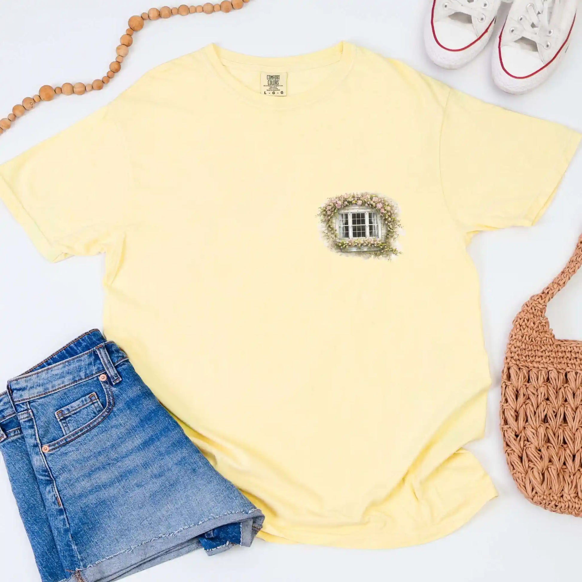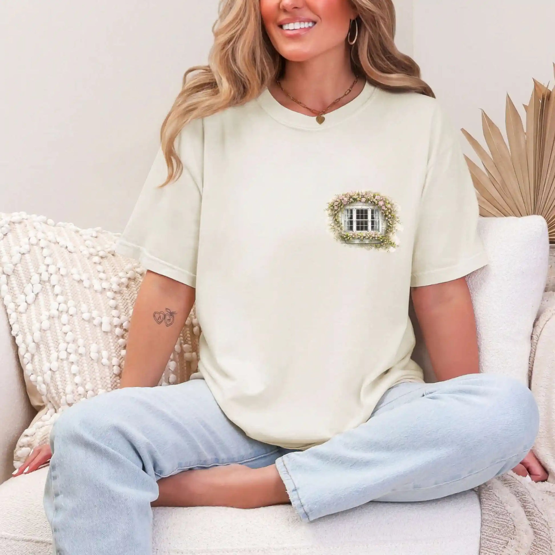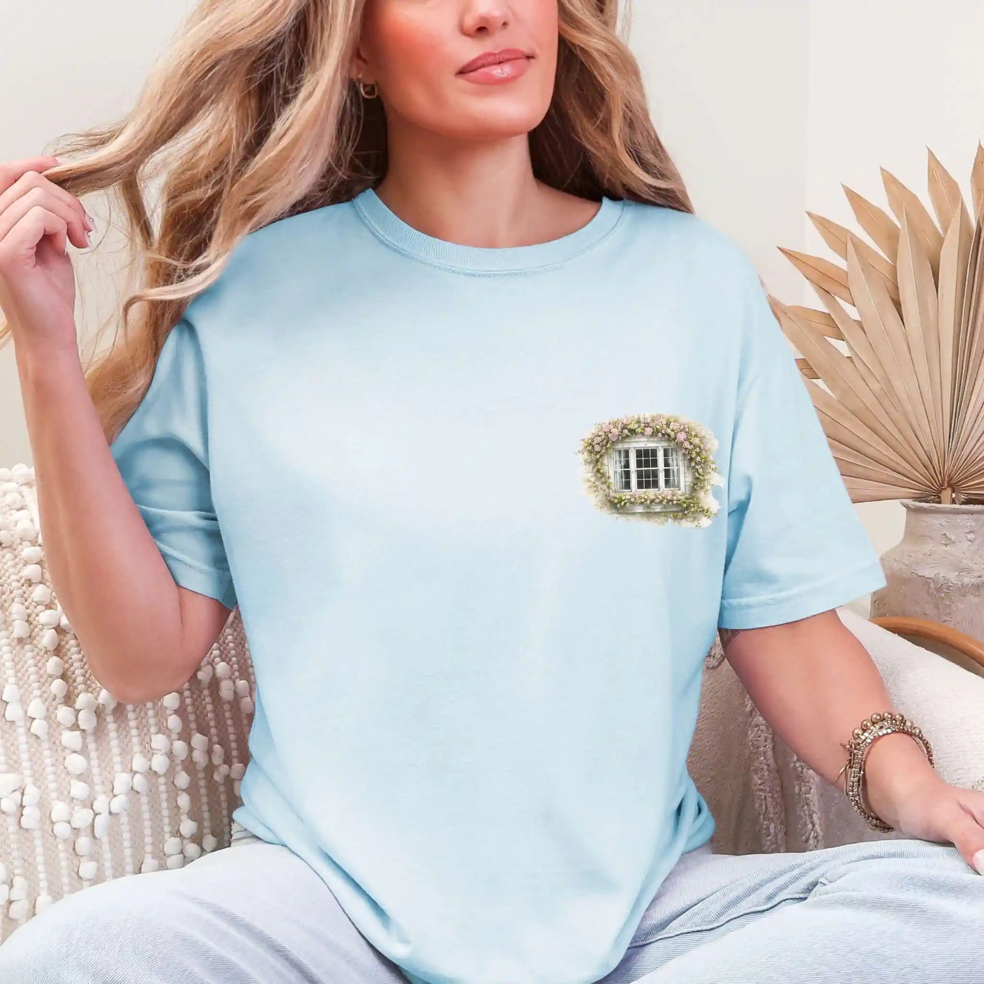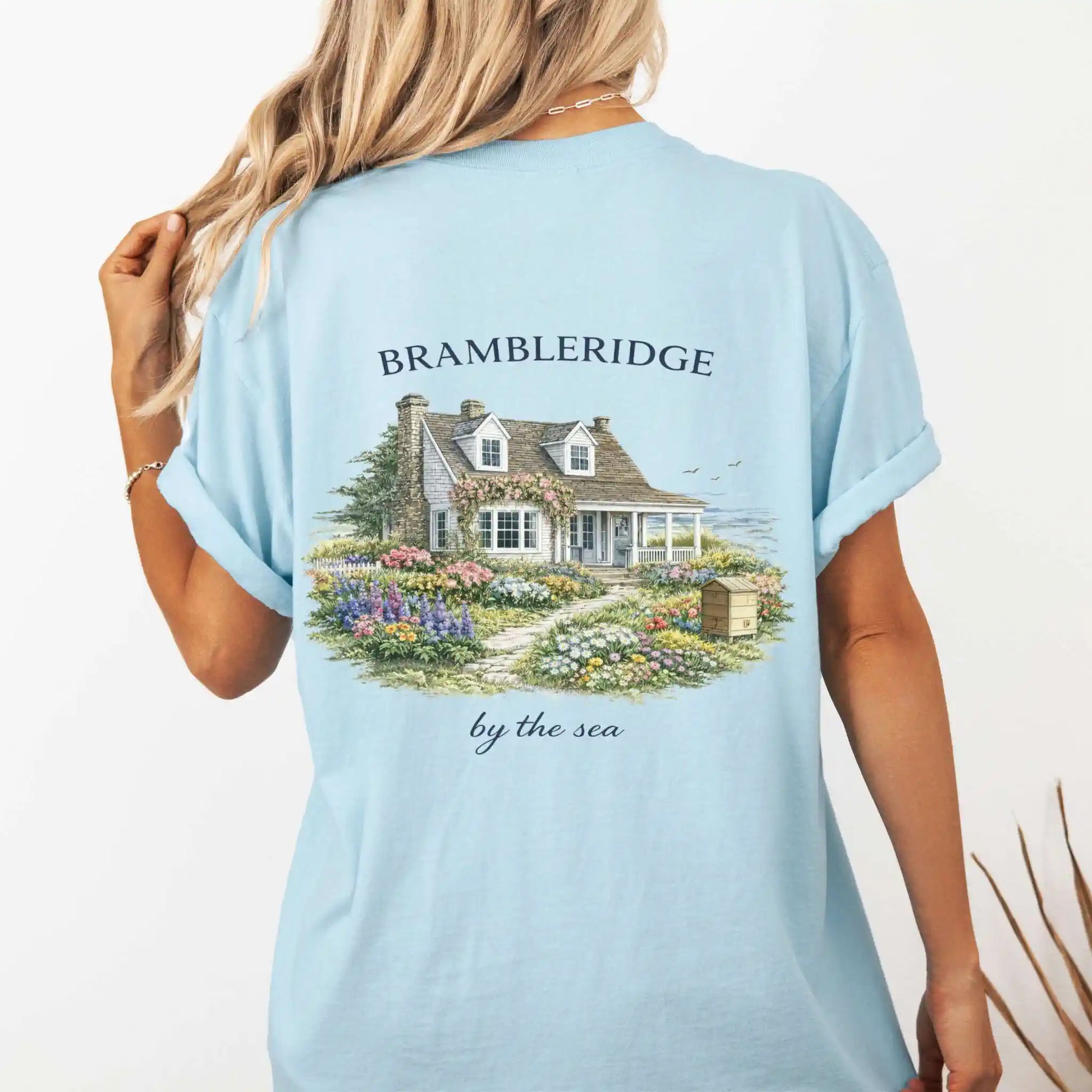 The front features a delicate window framed with climbing florals, evoking a soft, lived-in cottage view. The back showcases a detailed seaside cottage scene with garden paths, blooms, and the words “Brambleridge by the Sea” above. This front-and-back design is printed on a t-shirt and is well suited for everyday wear, weekend wandering, or moments that call for calm.