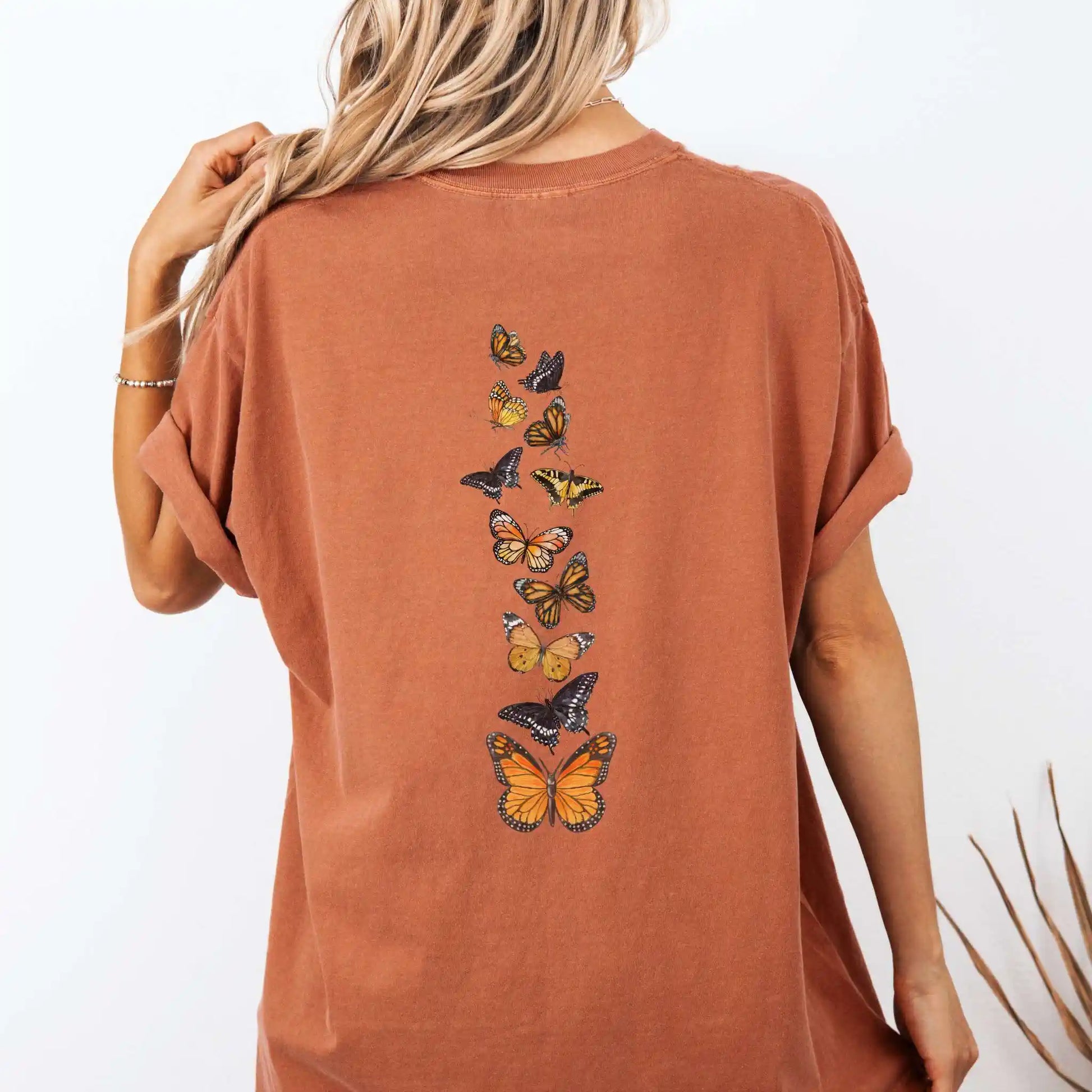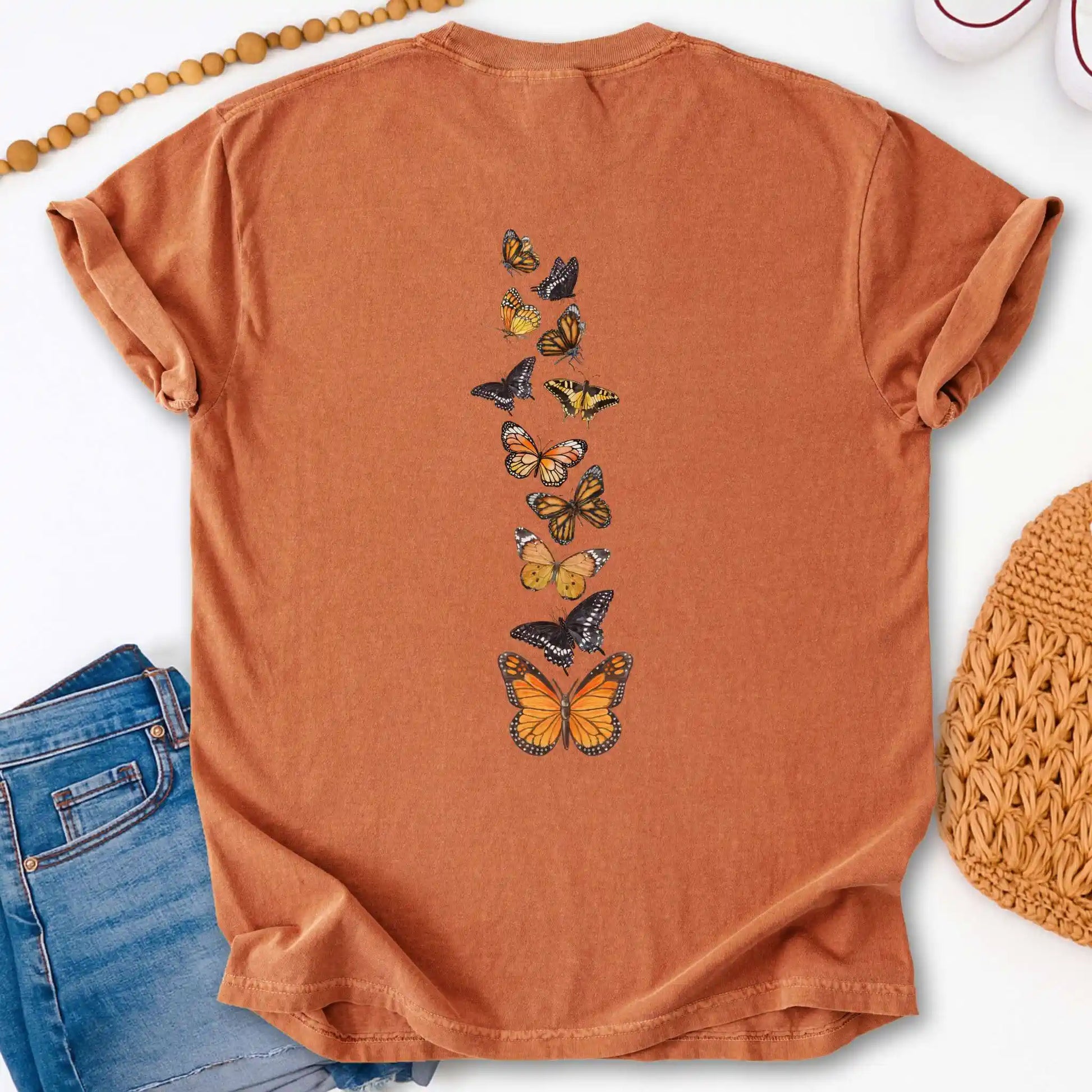 This captivating back design features a unique "spine" formed by a mesmerizing cascade of orange and black butterflies, bringing a sophisticated touch of nature's beauty to your everyday wear.