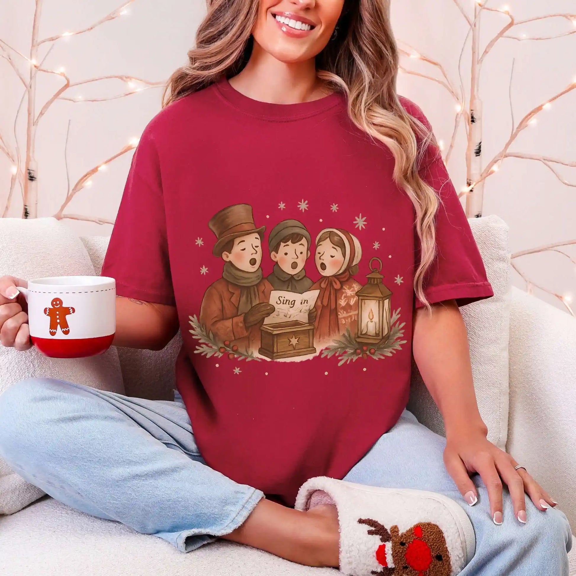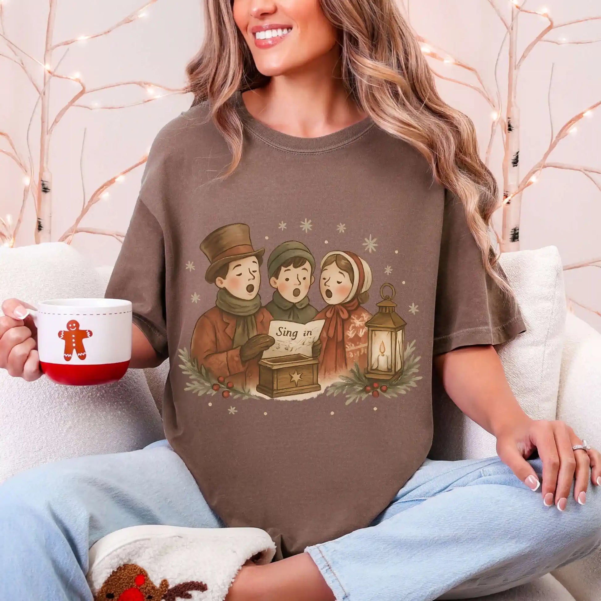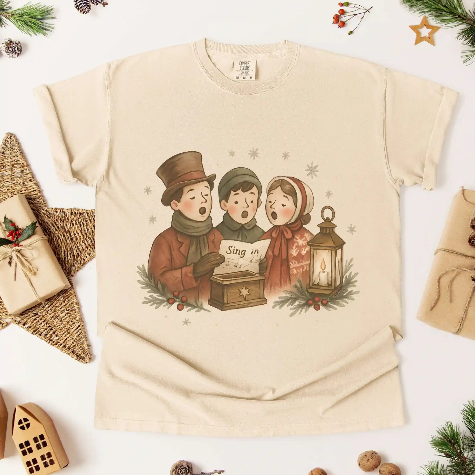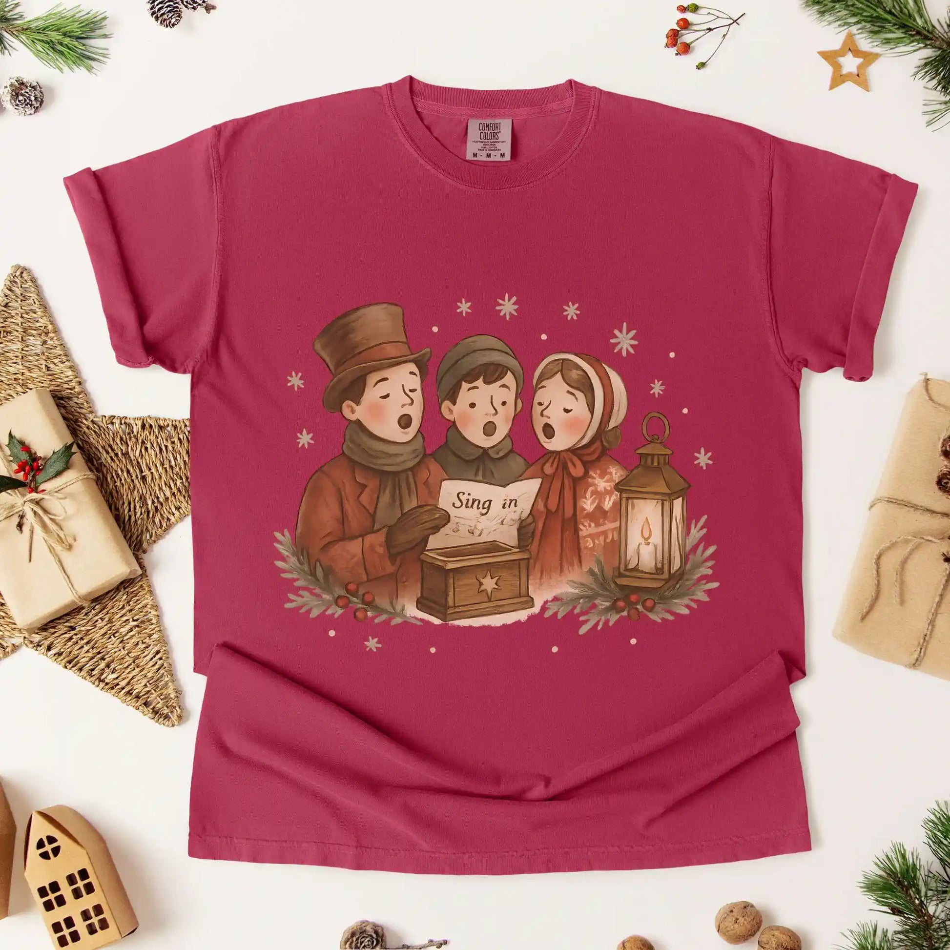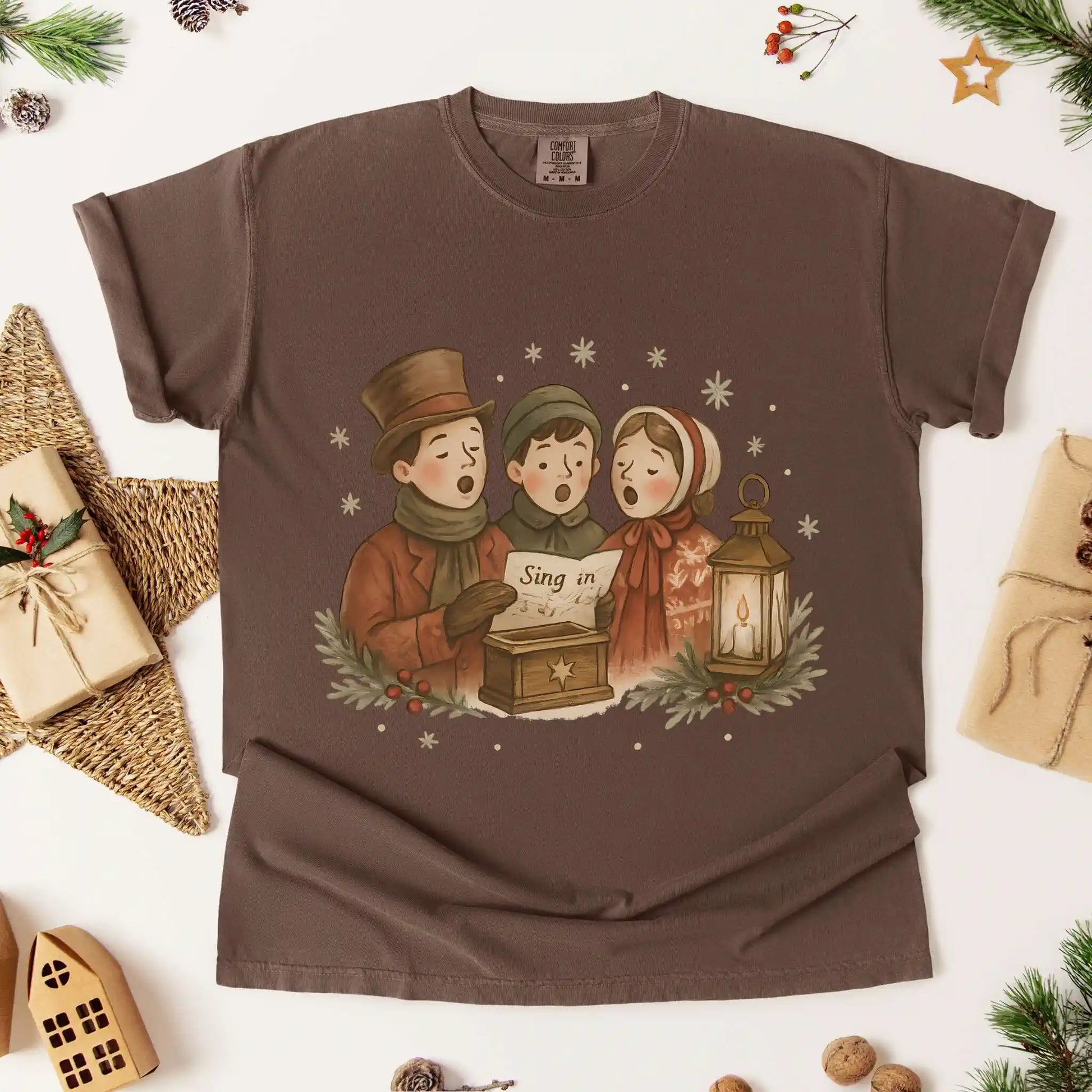 The front graphic features three carolers dressed in vintage attire, singing together beside a glowing lantern and festive greenery. Centered on the front of the t-shirt, this design is perfect for holiday strolls, winter festivals, or cozy gatherings filled with Christmas cheer.