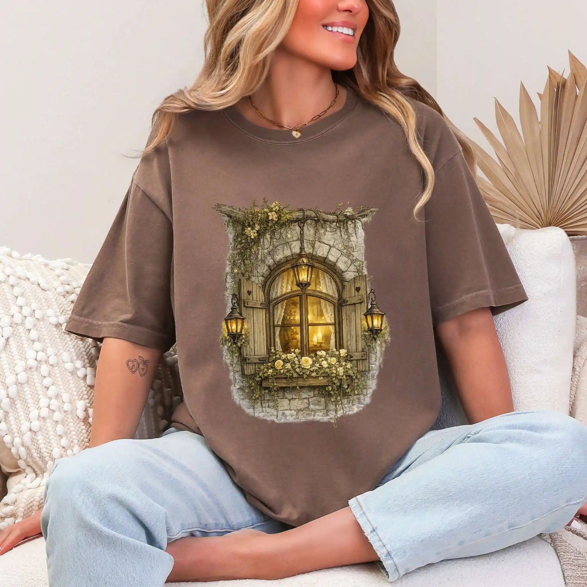The centered front design features an arched stone window framed with lanterns and climbing roses. Perfect for cozy evenings and cottage-inspired style.