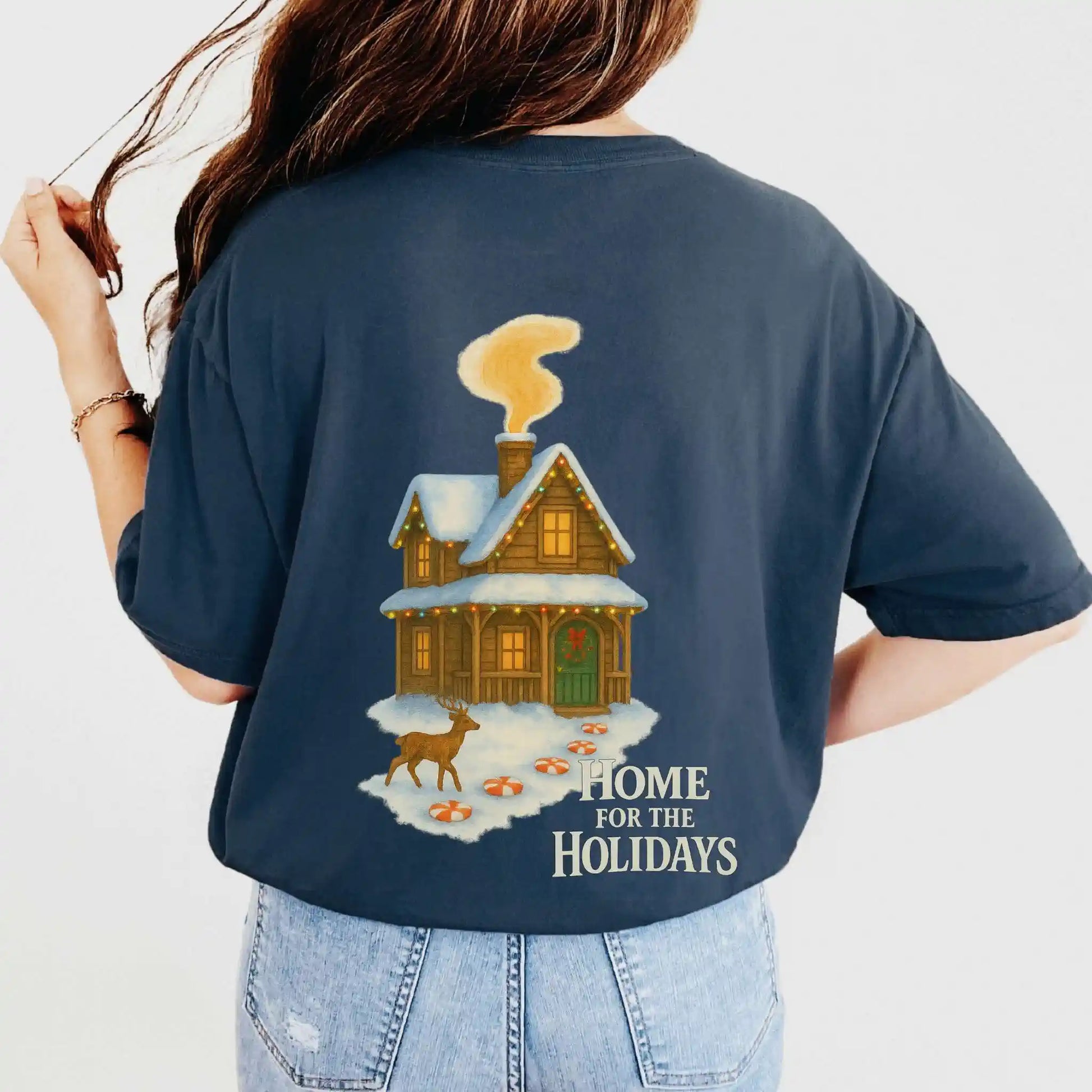 Features a front-and-back design: the front shows a quaint snow-covered cabin, while the back expands into a full holiday scene with glowing lights, a reindeer, candy-cane stepping stones, and the phrase “Home for the Holidays.” Ideal for Christmas parties, holiday photos, or simply cozying up all winter long.