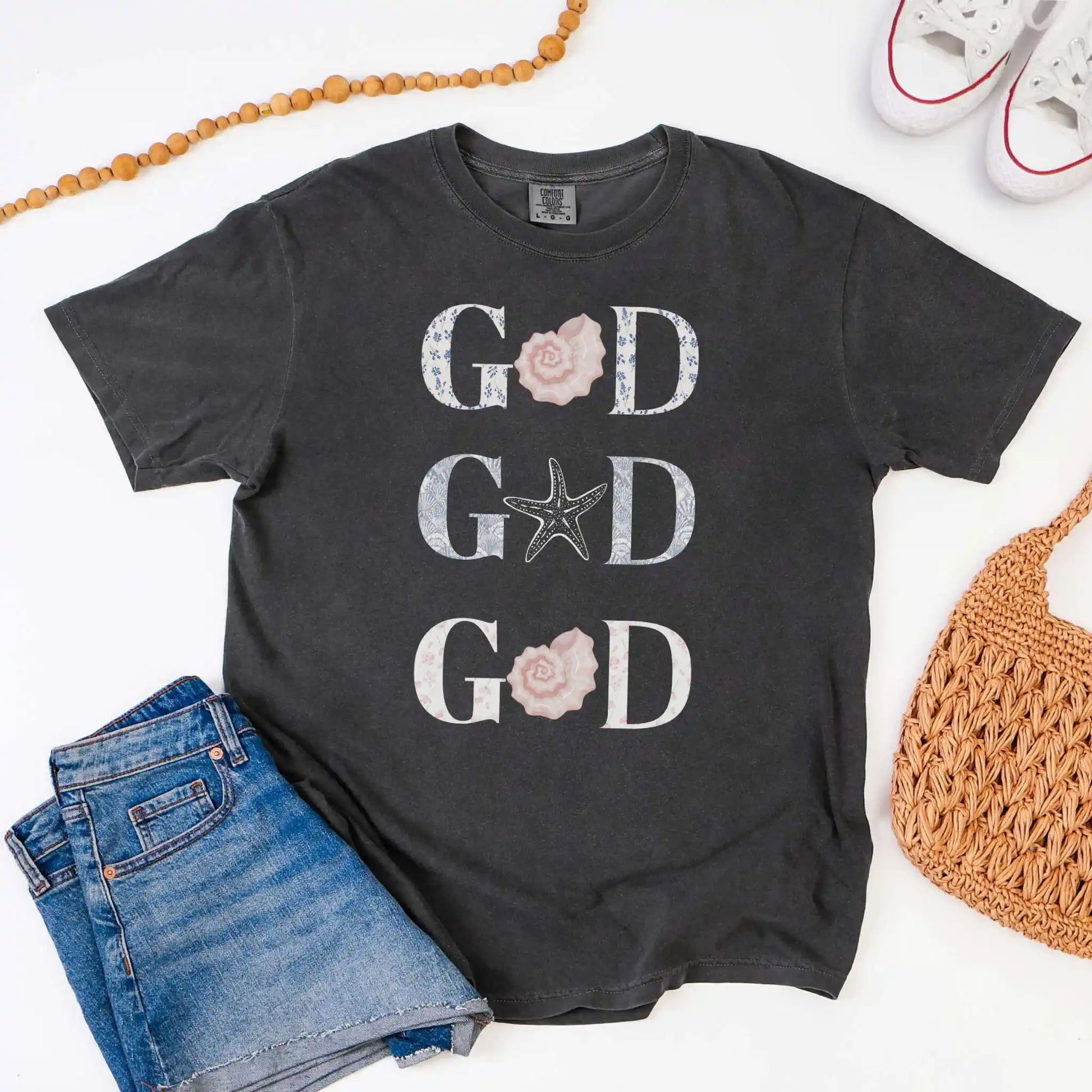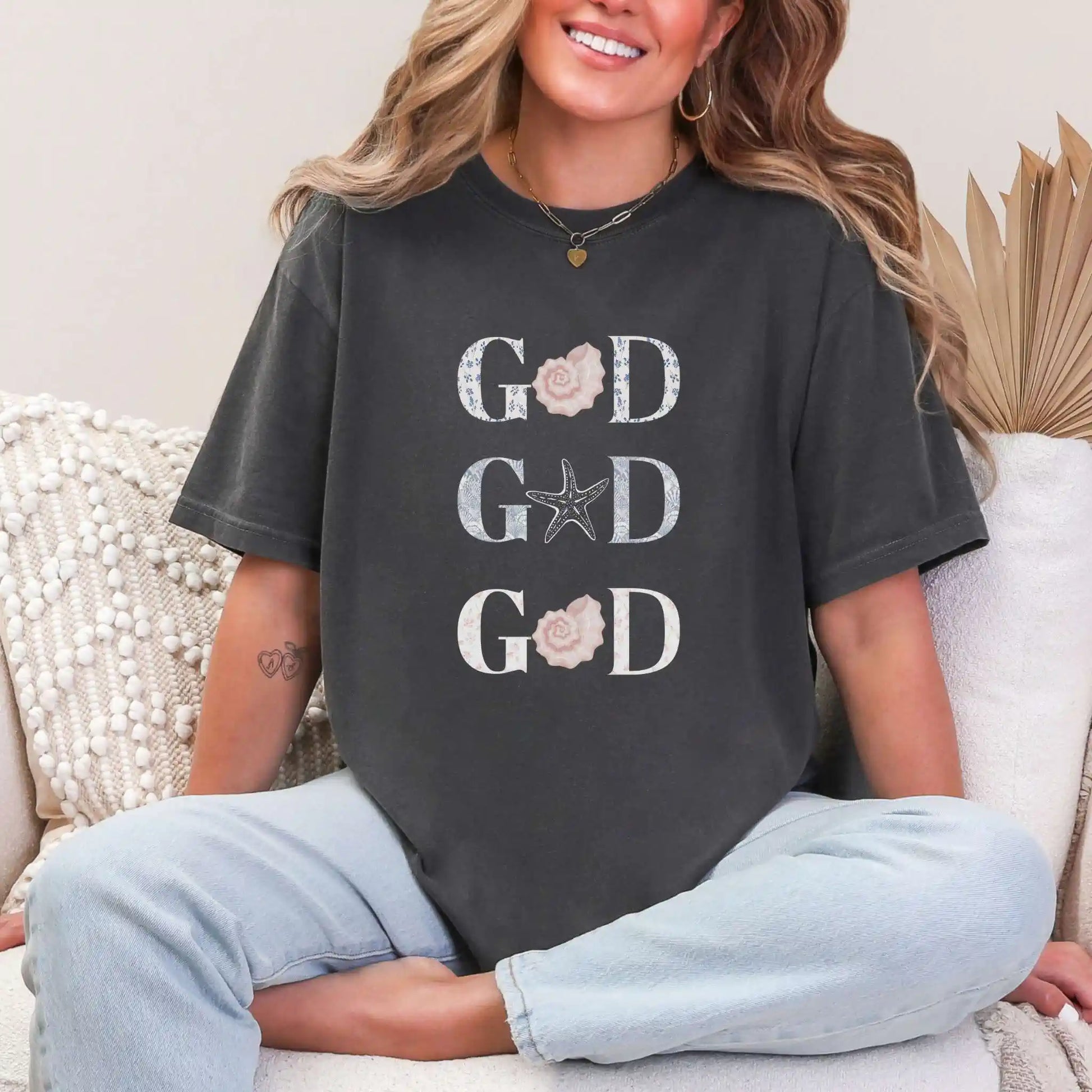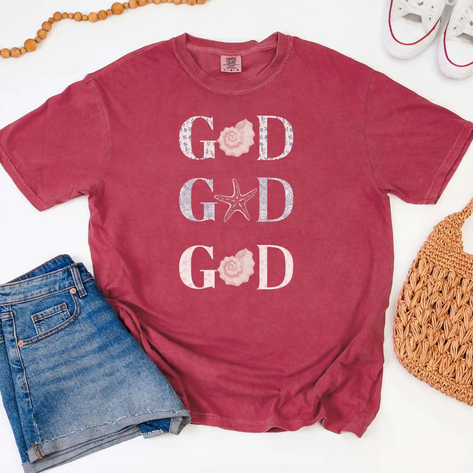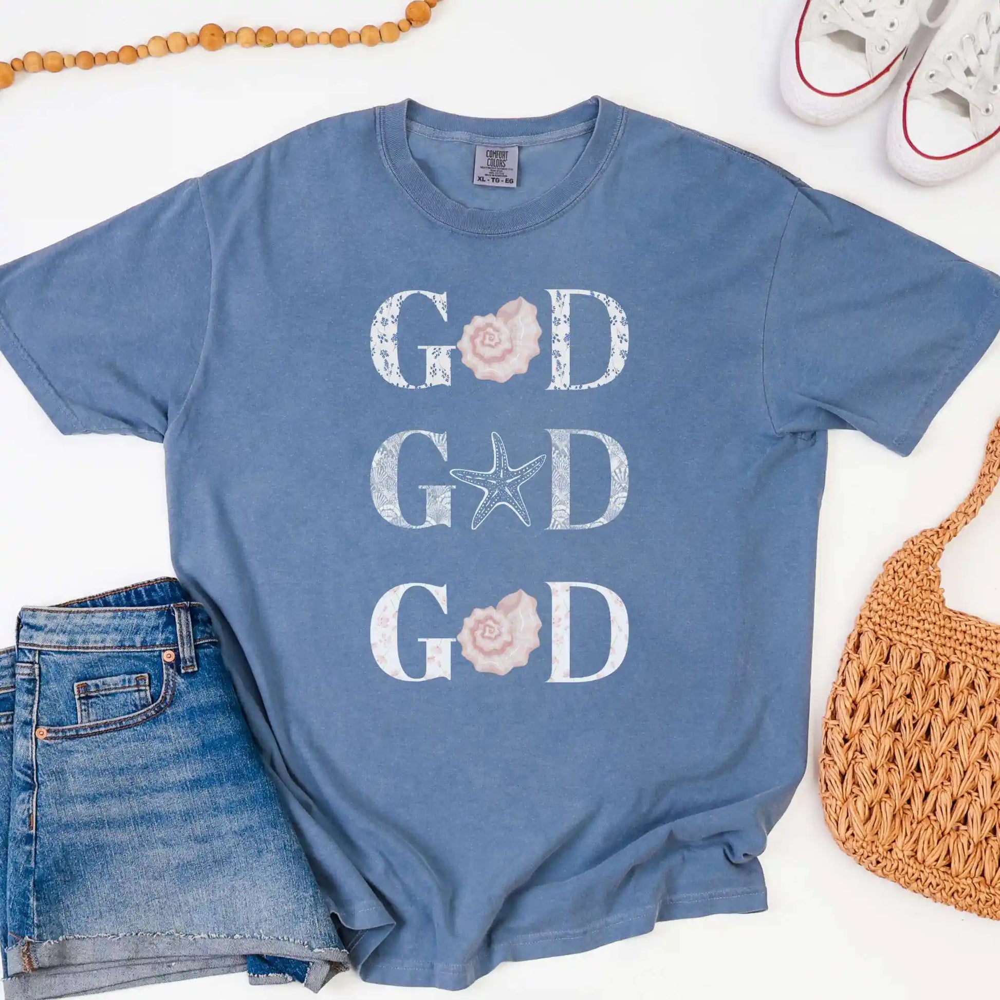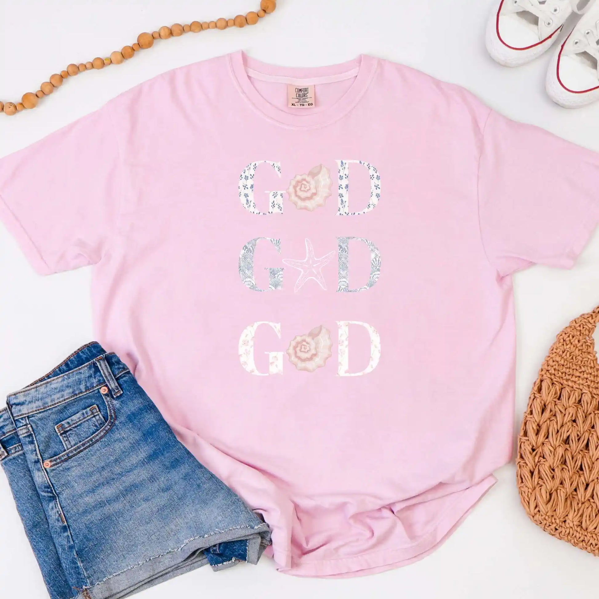 The word “GOD” is repeated three times in soft, soothing patterns. One version swaps the “O” for a pink spiral seashell, another uses a delicate starfish, and the third features blush-toned floral accents. Each iteration is filled with intricate marine or botanical prints in blue and pink — a visual prayer wrapped in waves and wonder.