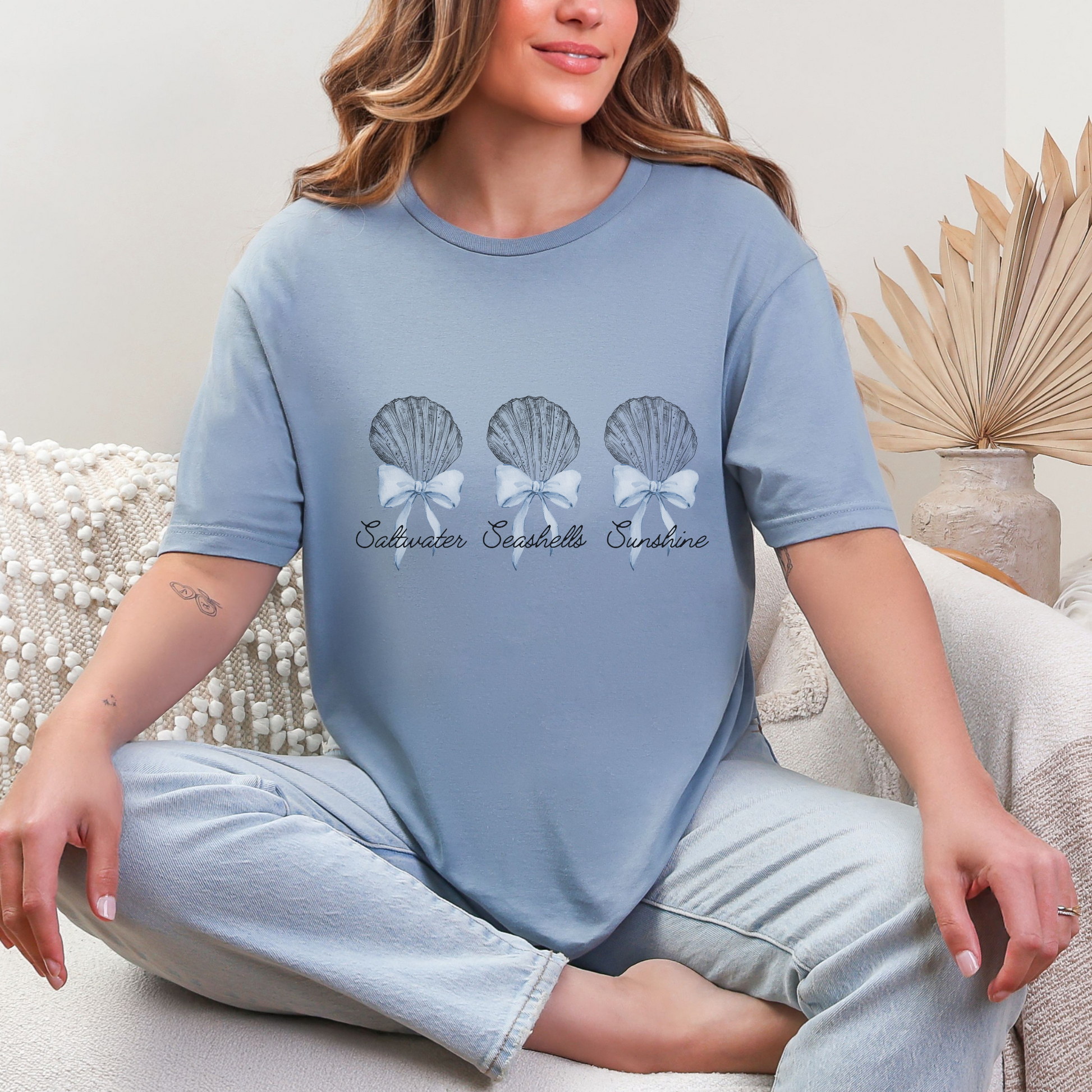 Front Design of whimsical seashell illustrations, each tied with a soft blue ribbon, accompanied by the lovely phrase "Saltwater Seashells Sunshine." This design brings a touch of coastal serenity and summer joy to your wardrobe.