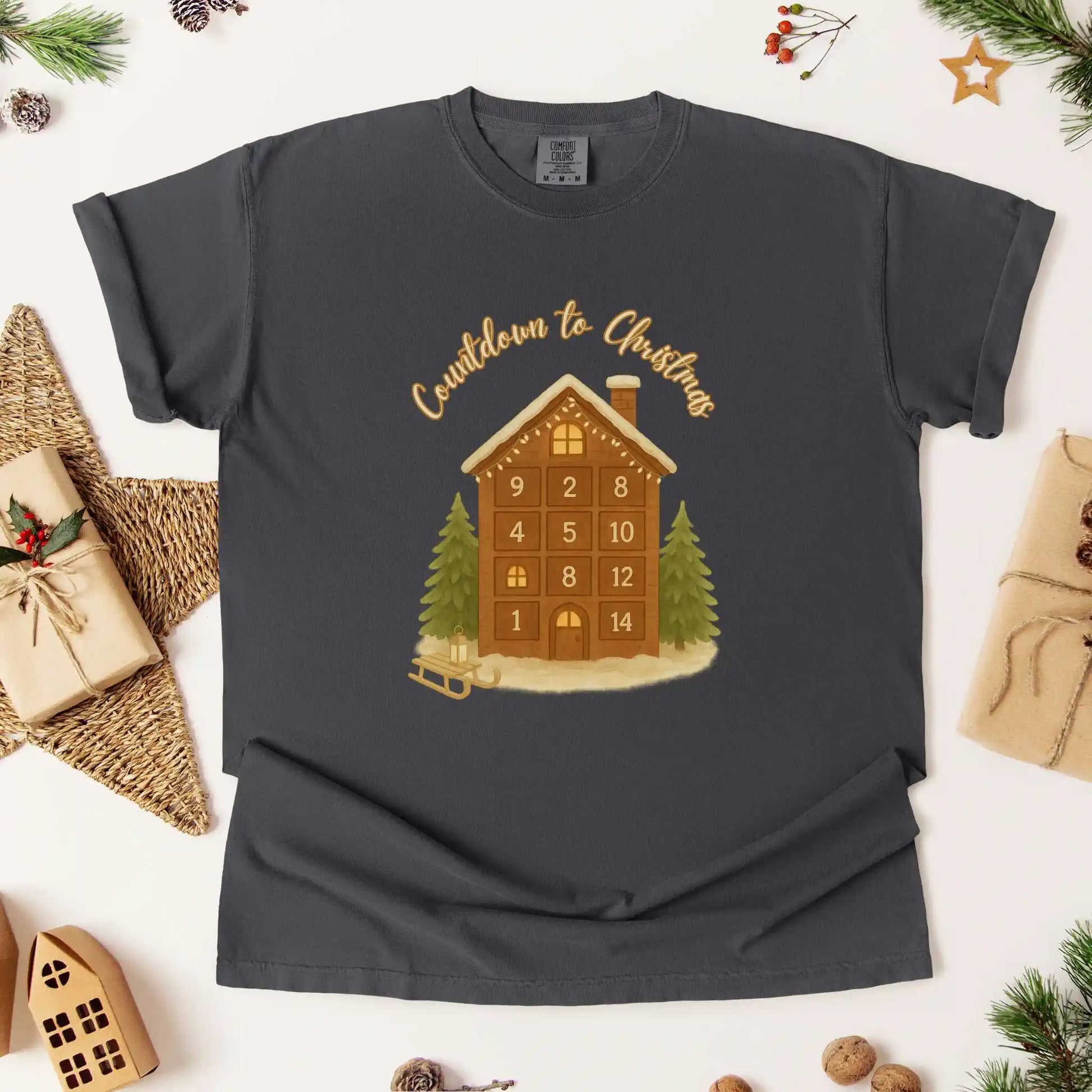 The artwork features a gingerbread-style house transformed into an advent calendar, framed by evergreens and topped with festive lettering that reads “Countdown to Christmas.” Printed on the front of the t-shirt, it’s ideal for holiday parties, cozy nights in, or tree-trimming celebrations.