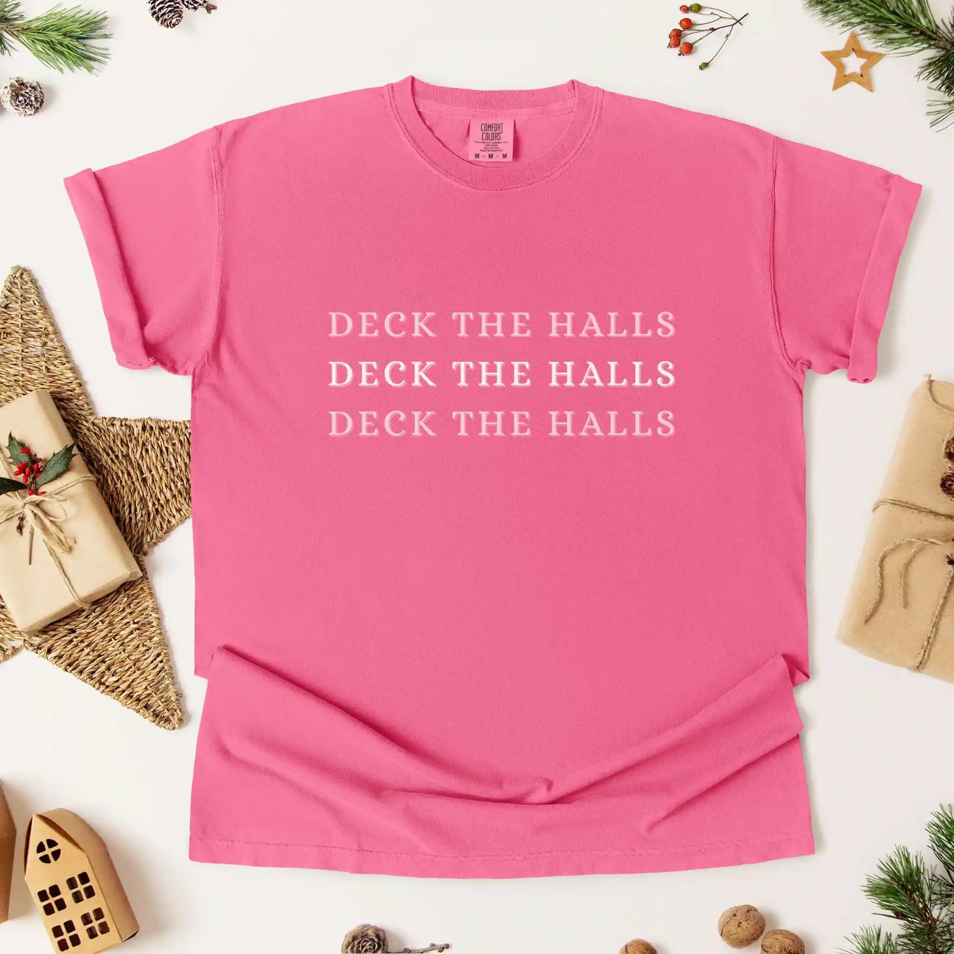 Features the phrase “Deck the Halls” repeated three times in stacked vintage lettering with subtle shading for dimension. Center front design on a t-shirt that pairs perfectly with cozy flannels, holiday lights, and carols by the fire.