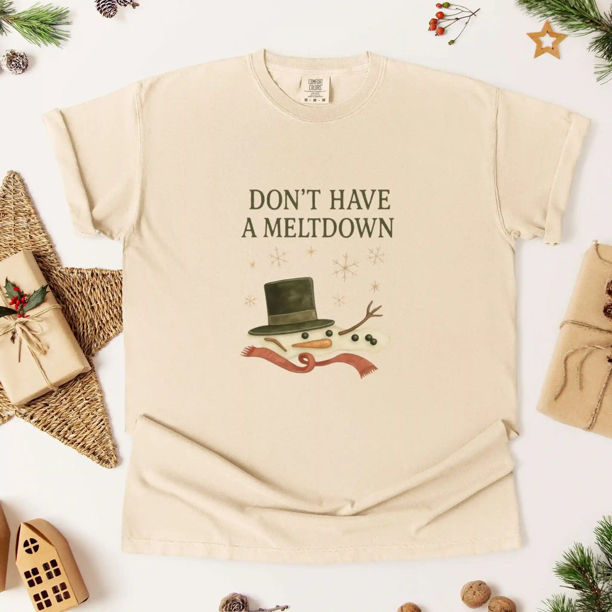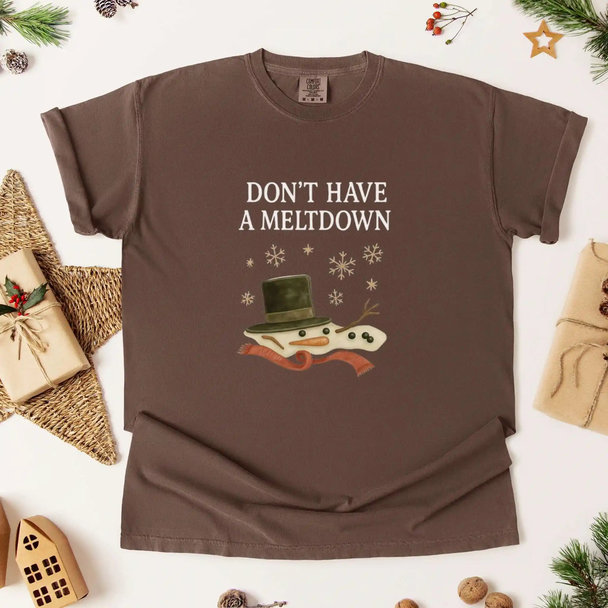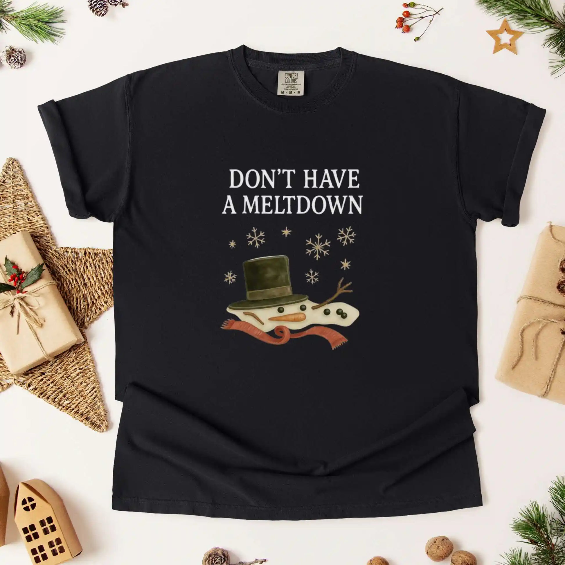 Features a melting snowman with a tilted top hat, carrot nose, twig arms, scarf, and snowflakes beneath the phrase “Don’t Have A Meltdown.” Front placement design made for cozy movie nights, errand runs, or laughter-filled gatherings.