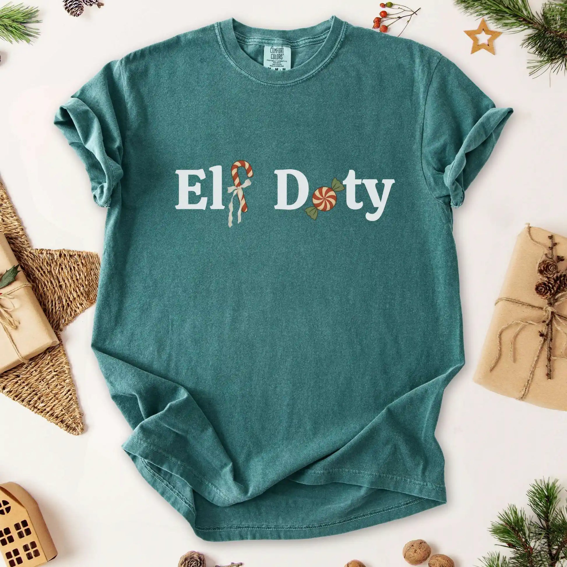 Features the phrase “Elf Duty” in bold lettering accented with a candy cane and peppermint candy, tied with a delicate ribbon for a sweet holiday touch. Center front design on a t-shirt made for baking, gift wrapping, and all things merry and bright.