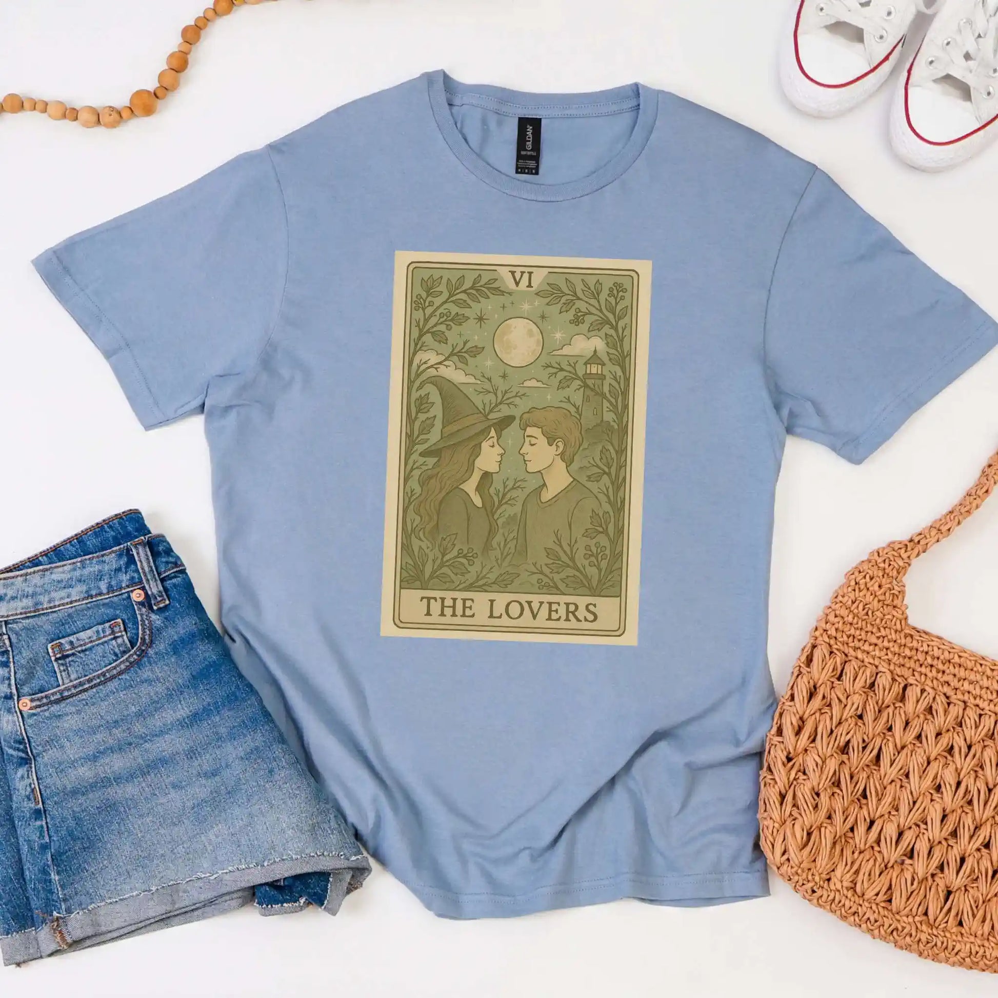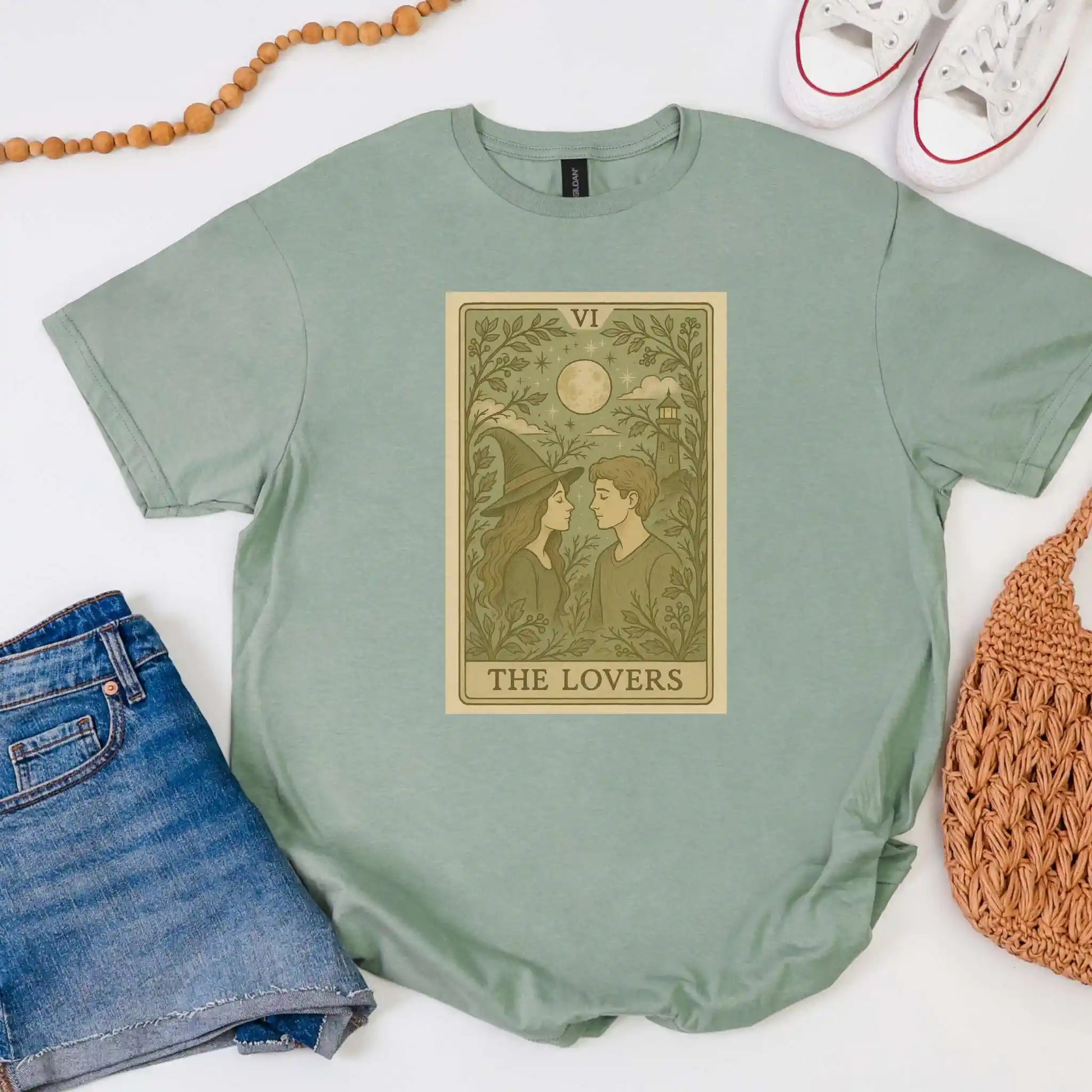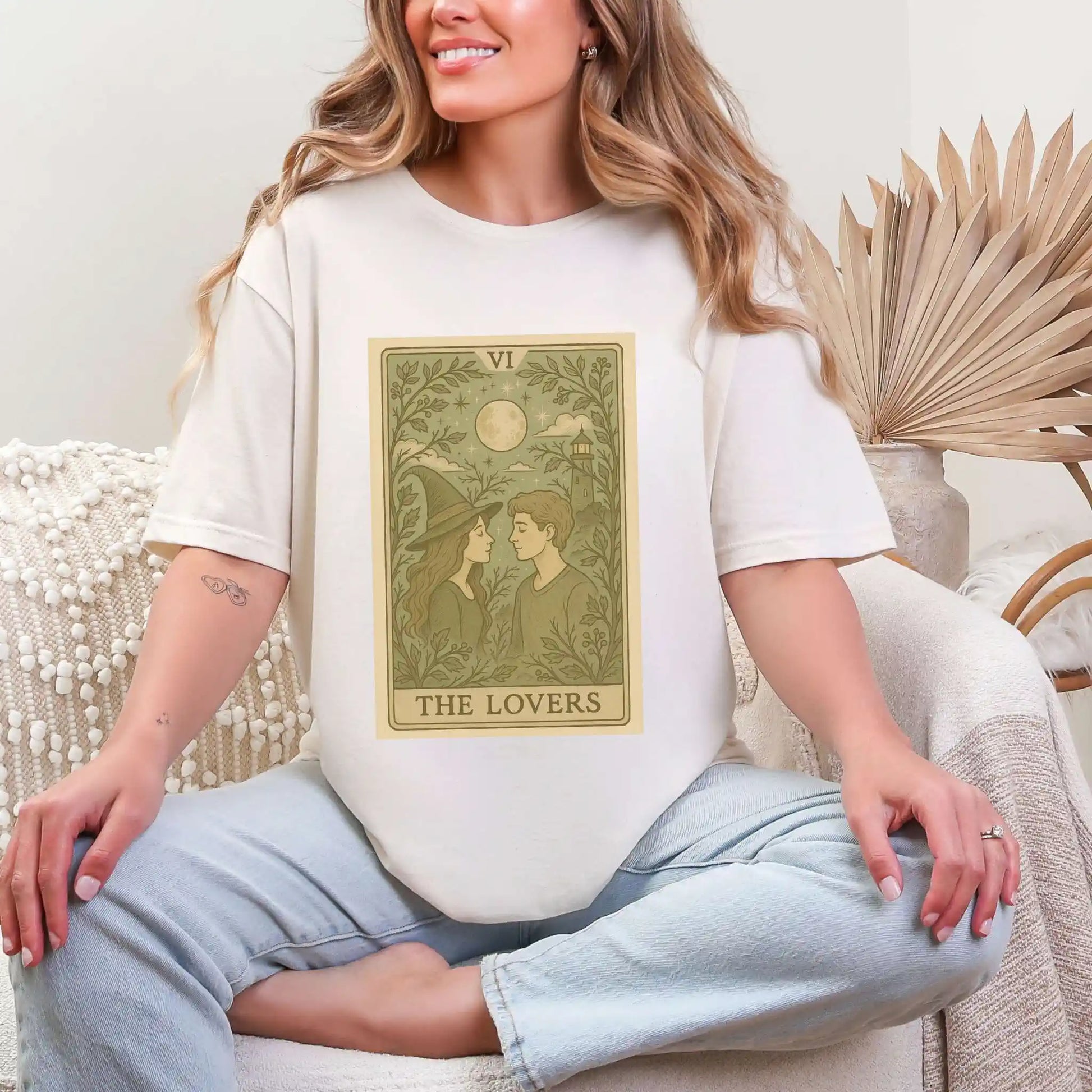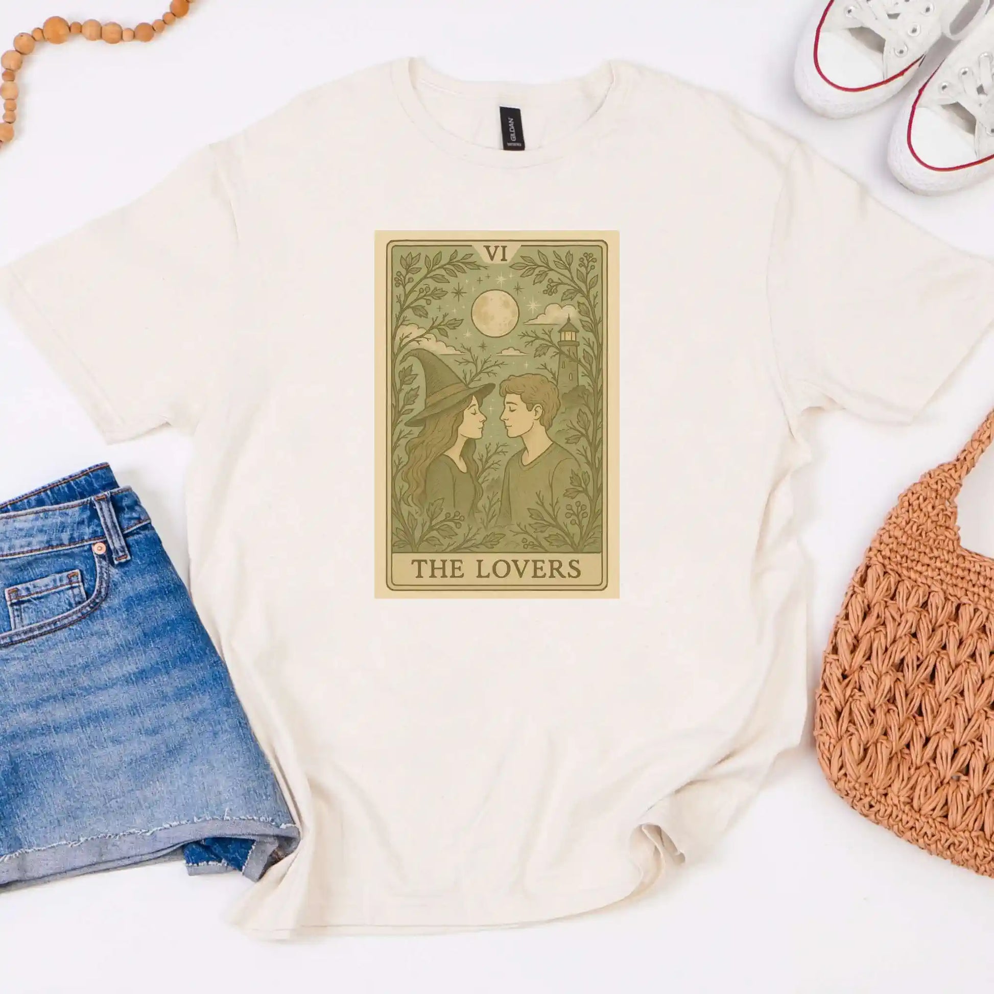 Framed by leafy branches and subtle stardust, the scene is crowned by the number VI and a distant lighthouse, tying love and light together. This t-shirt has a large front graphic — ideal for date nights or quiet spells under the stars.