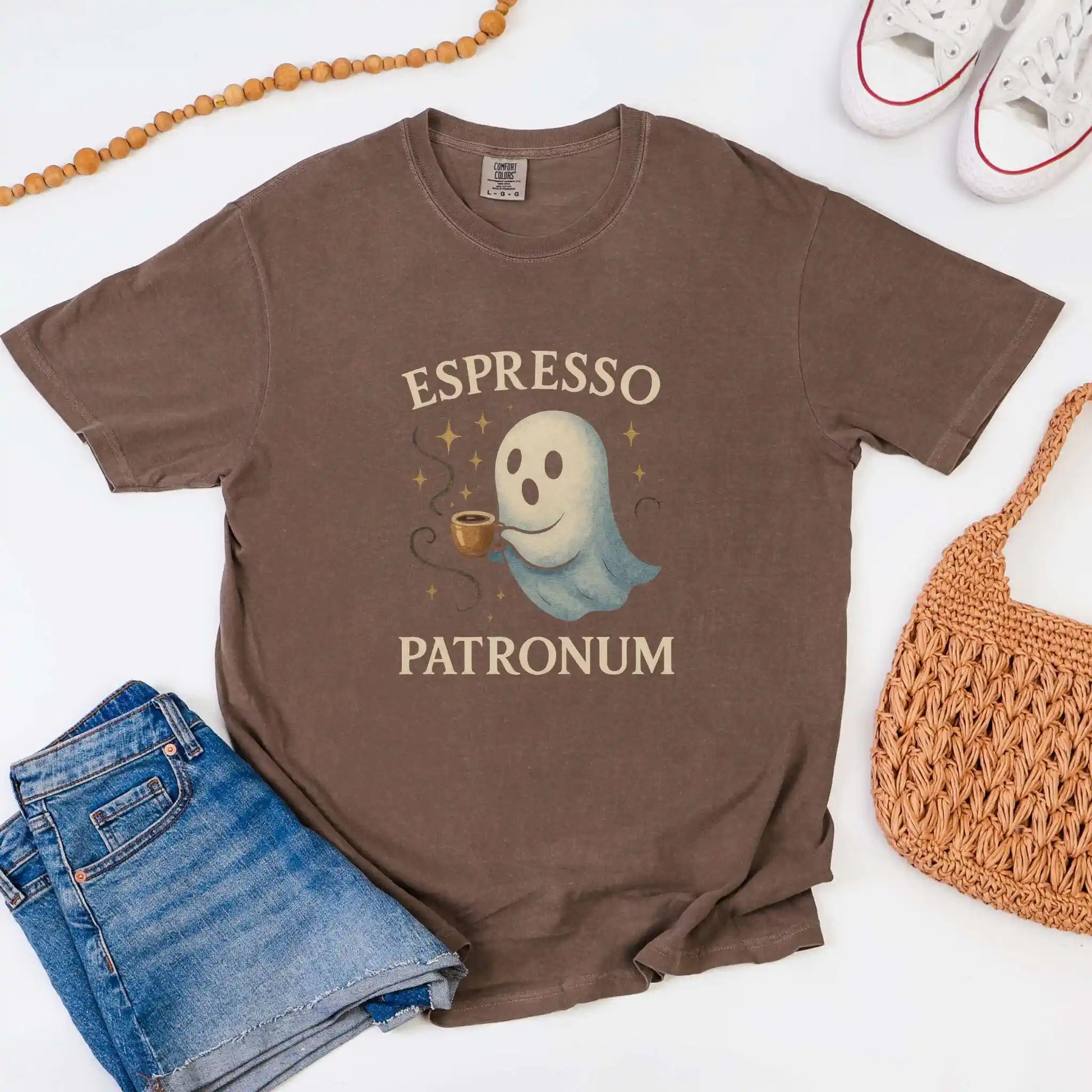Features a front design of a floating ghost holding a glowing coffee cup, surrounded by twinkling stars and the words “Espresso Patronum.” Printed on a classic t-shirt with a front placement — perfect for book lovers, coffee dates, or spooky season fun.