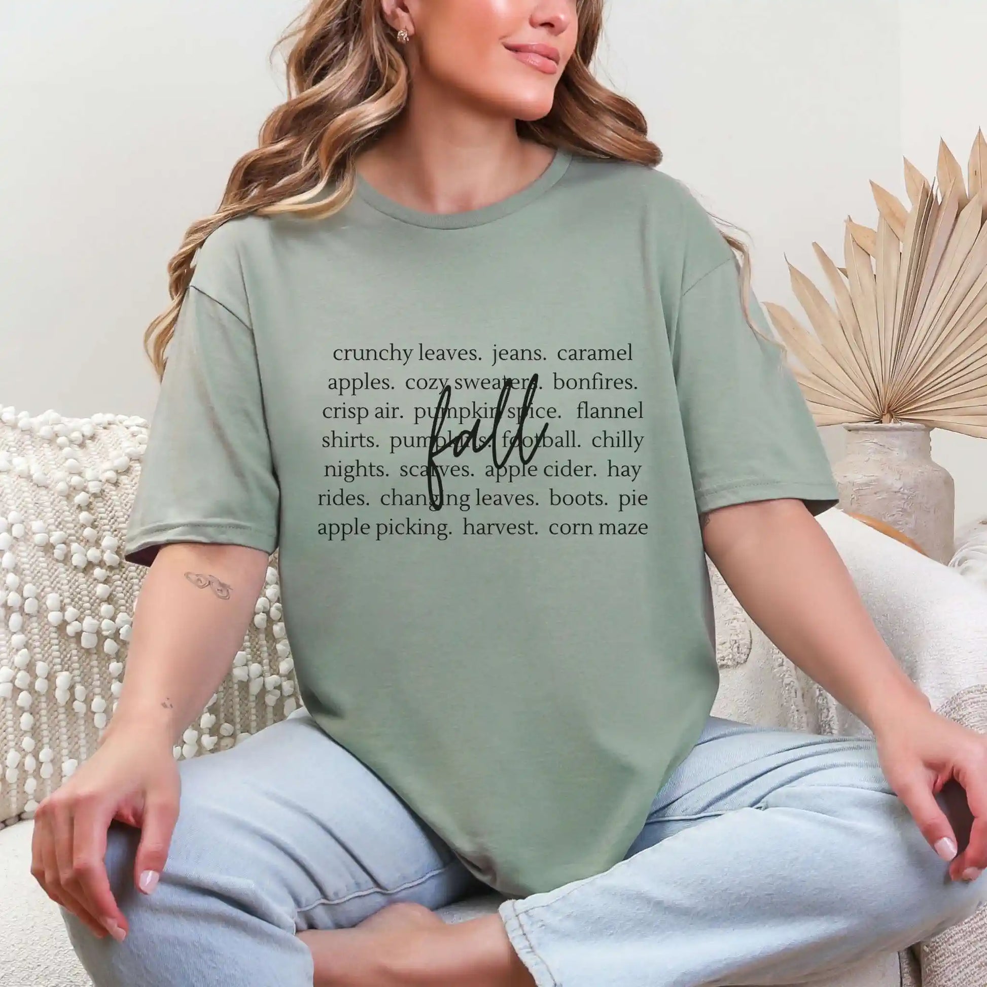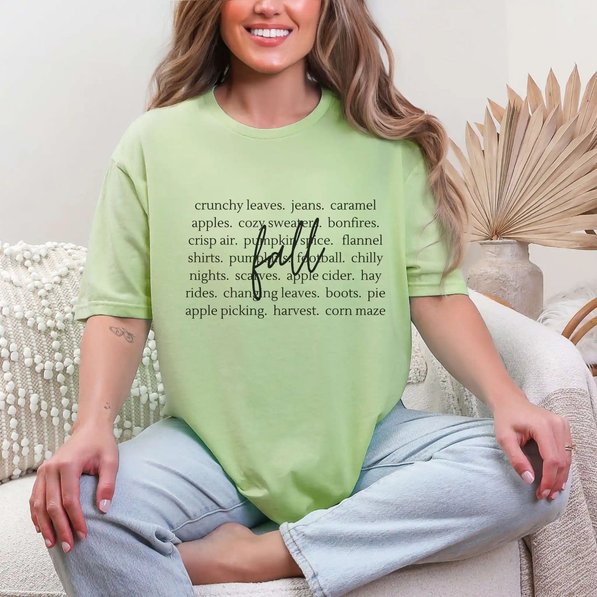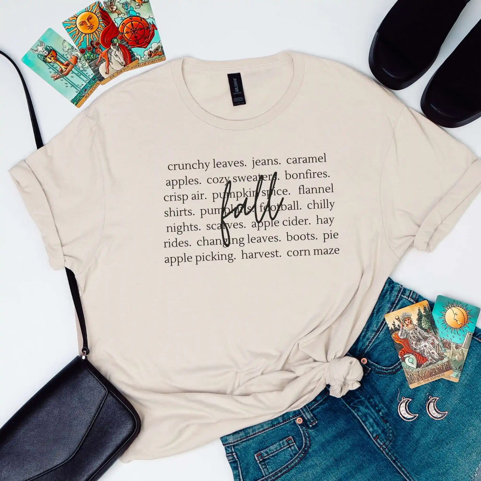 A typographic collage of everything we love about autumn — crunchy leaves, cozy sweaters, pumpkin spice, chilly nights, apple cider, hayrides, and more. The bold script “fall” overlays the text for a playful, layered effect.