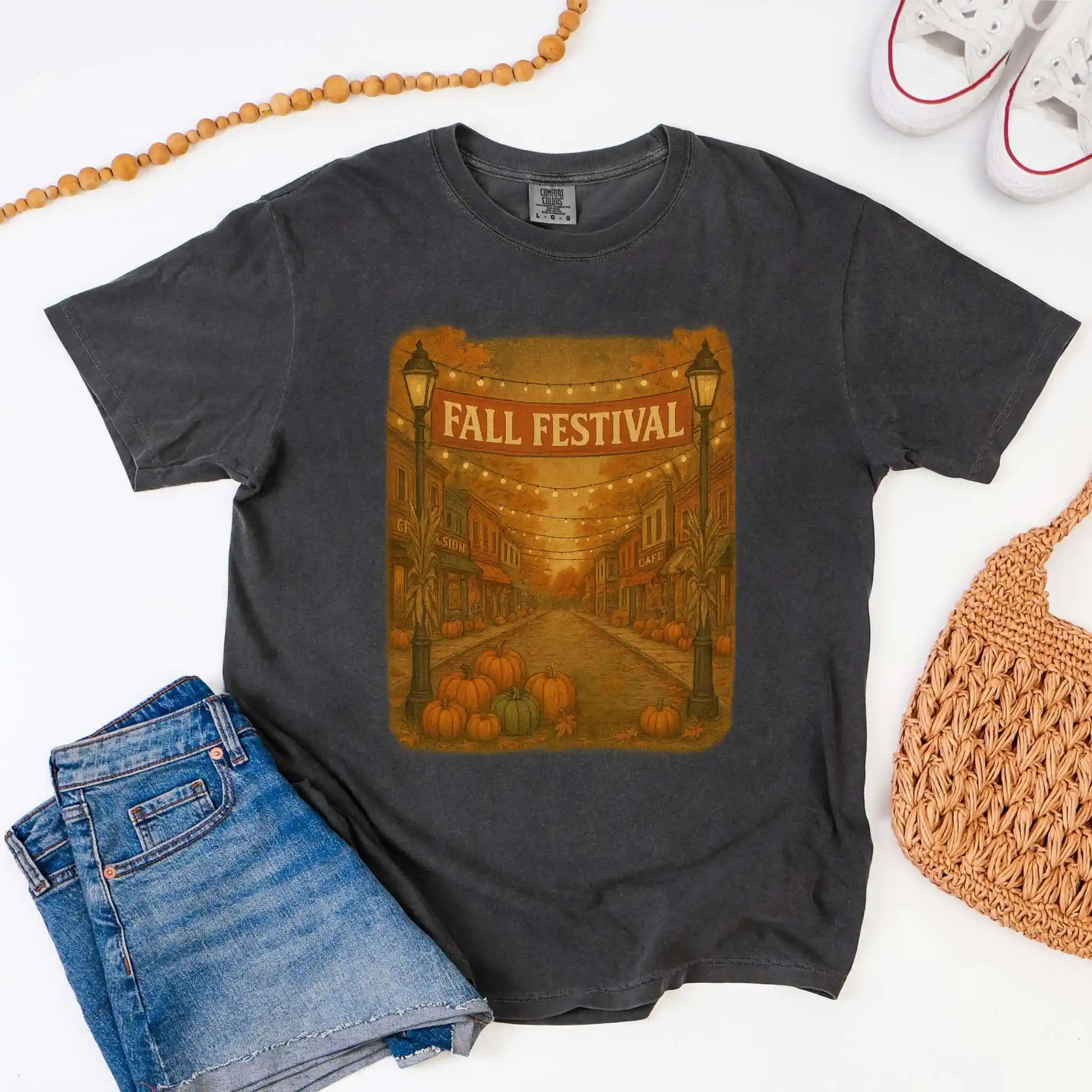 A quaint town street lined with pumpkins and glowing lights is framed by lampposts and a banner reading “Fall Festival.” Centered on the front of a t-shirt, this heartwarming design is perfect for pumpkin patches, local fairs, or casual fall evenings.