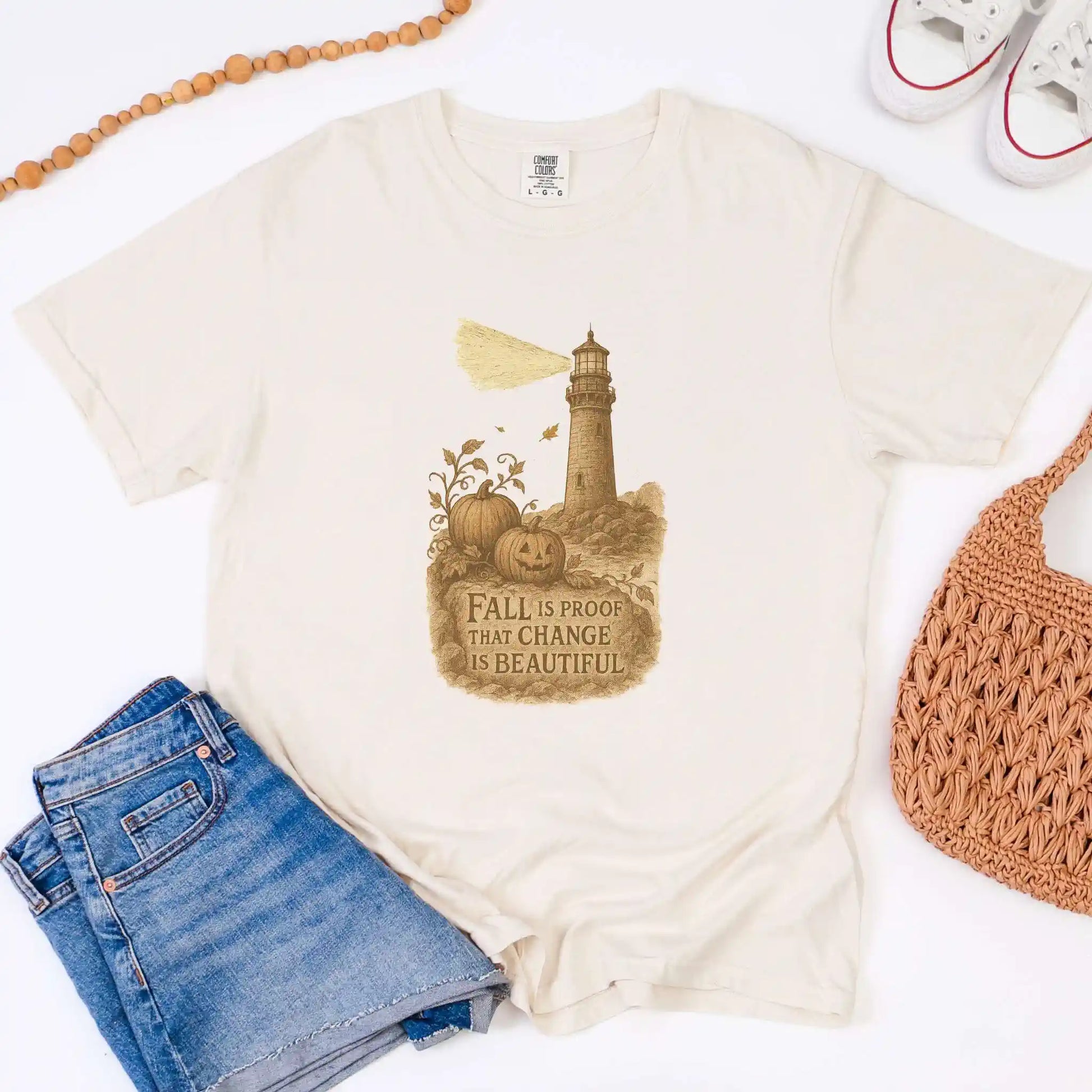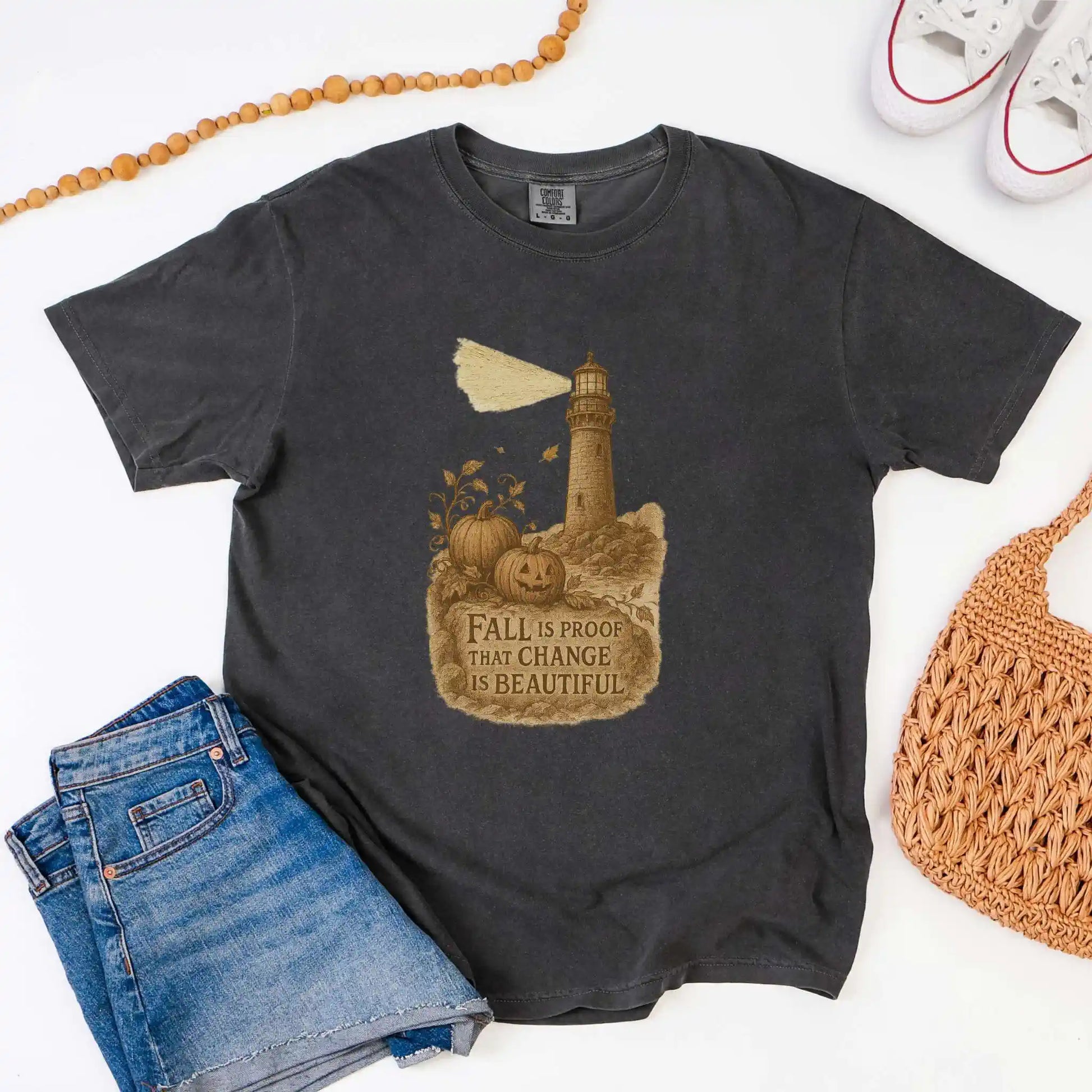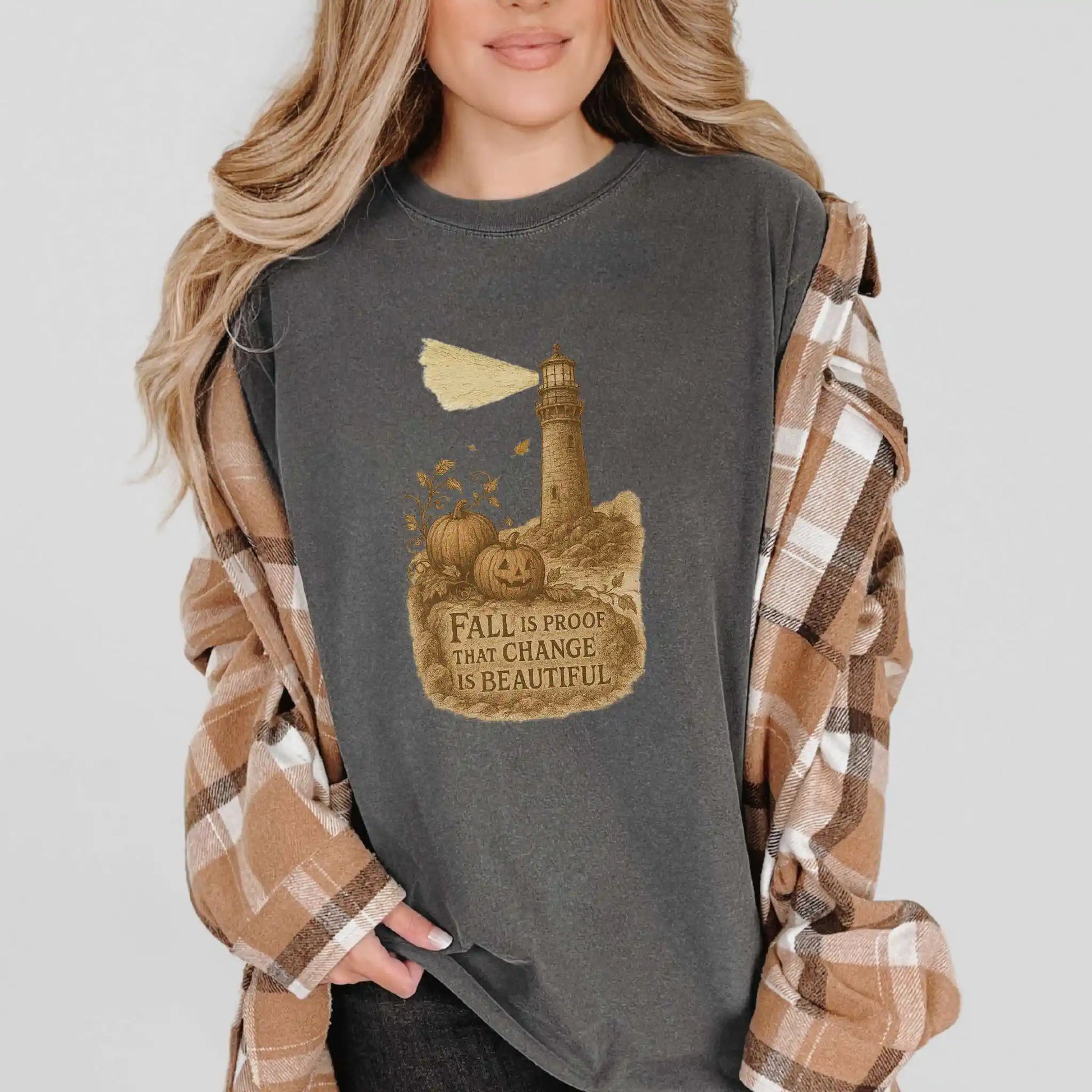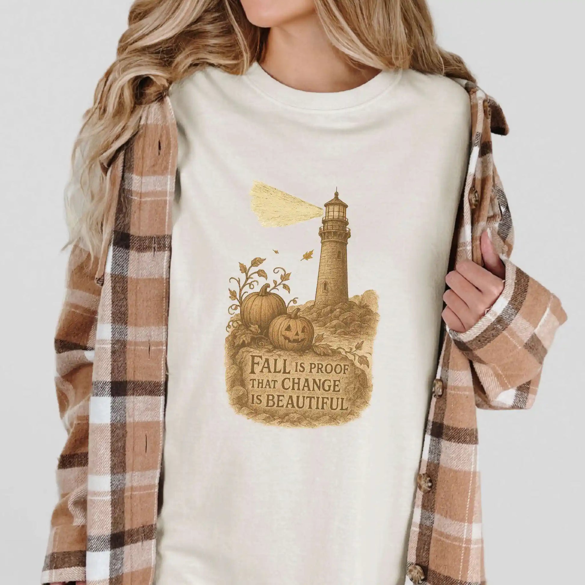 The front design features a lighthouse casting its golden beam beside pumpkins, swirling leaves, and the words “Fall is Proof That Change is Beautiful.” Printed on the front of this t-shirt, it’s a perfect piece for fall strolls, seasonal gatherings, or anyone who finds comfort in autumn’s wisdom.