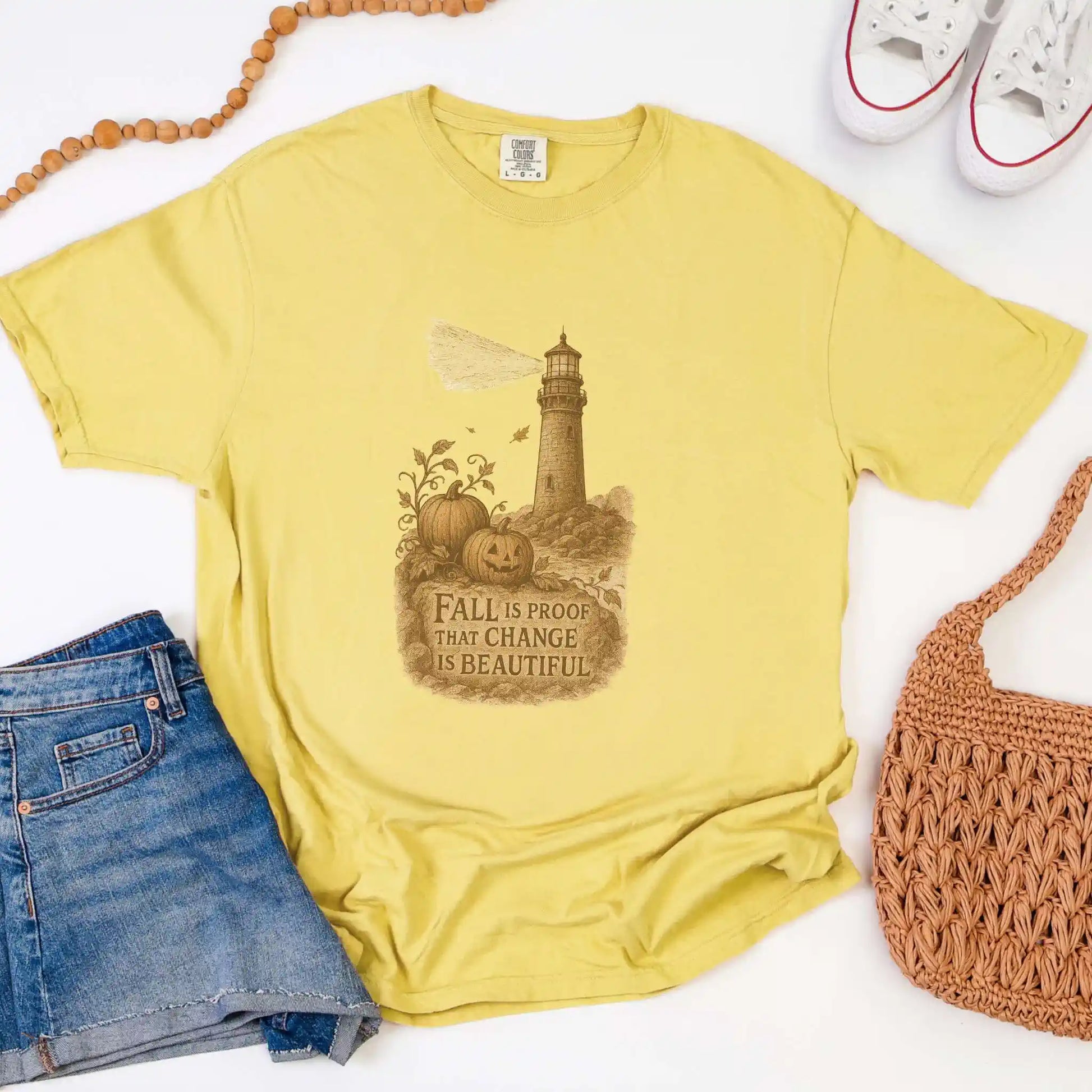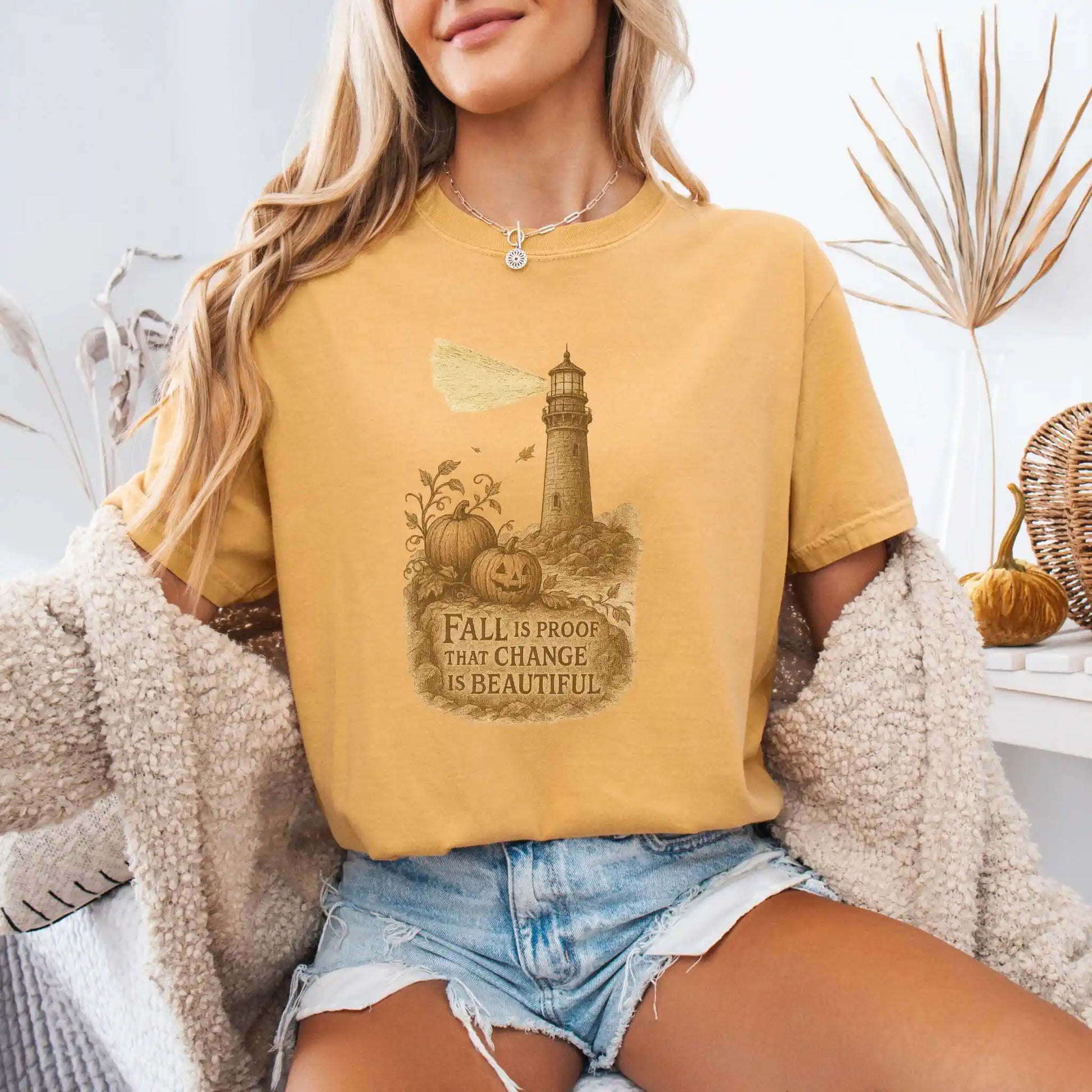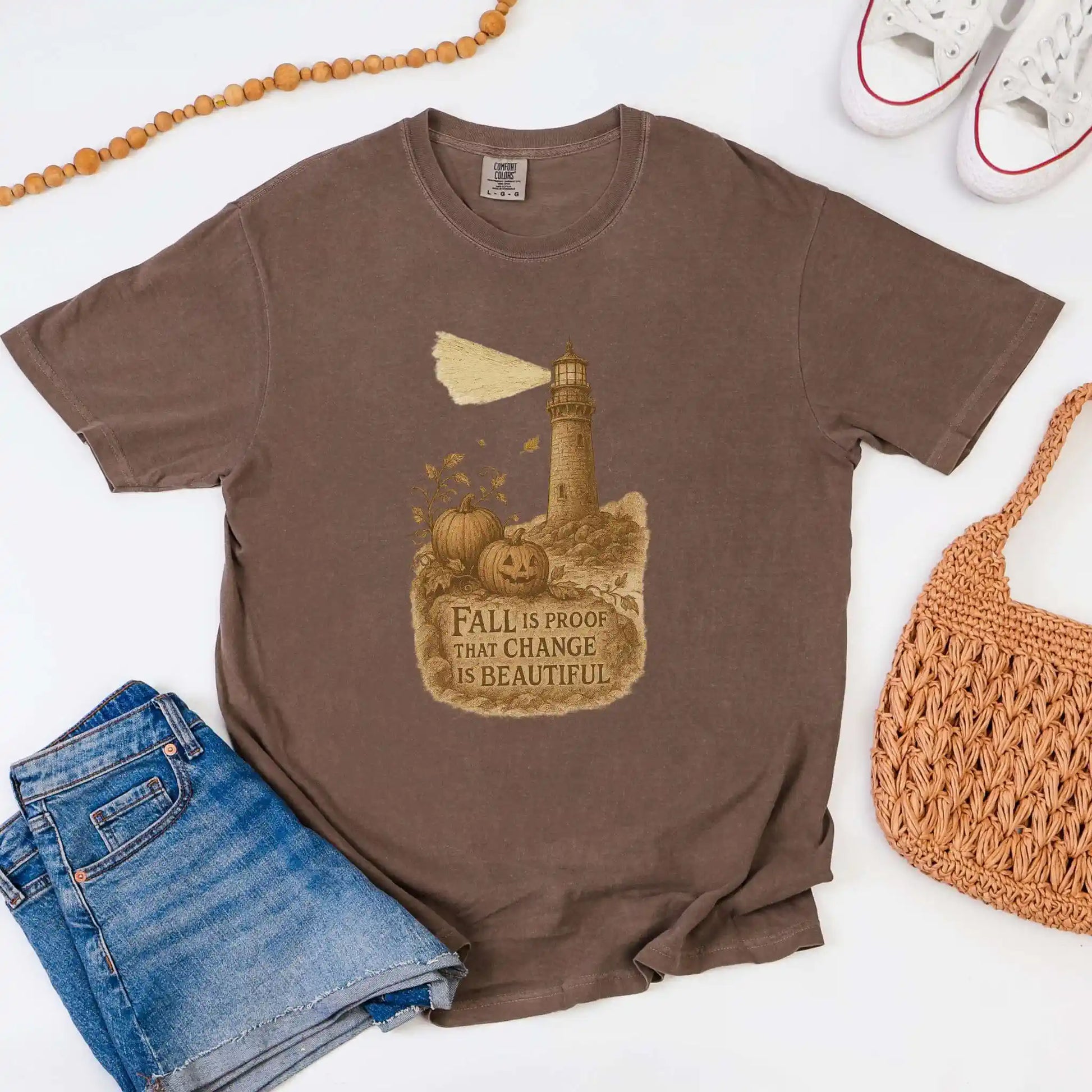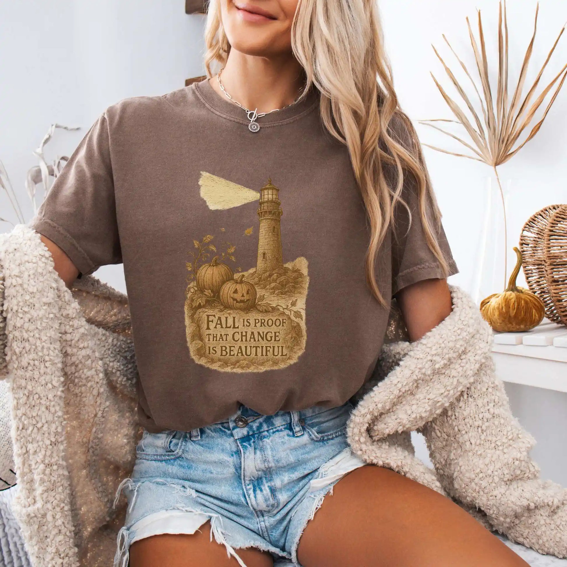 The front design features a lighthouse casting its golden beam beside pumpkins, swirling leaves, and the words “Fall is Proof That Change is Beautiful.” Printed on the front of this t-shirt, it’s a perfect piece for fall strolls, seasonal gatherings, or anyone who finds comfort in autumn’s wisdom.