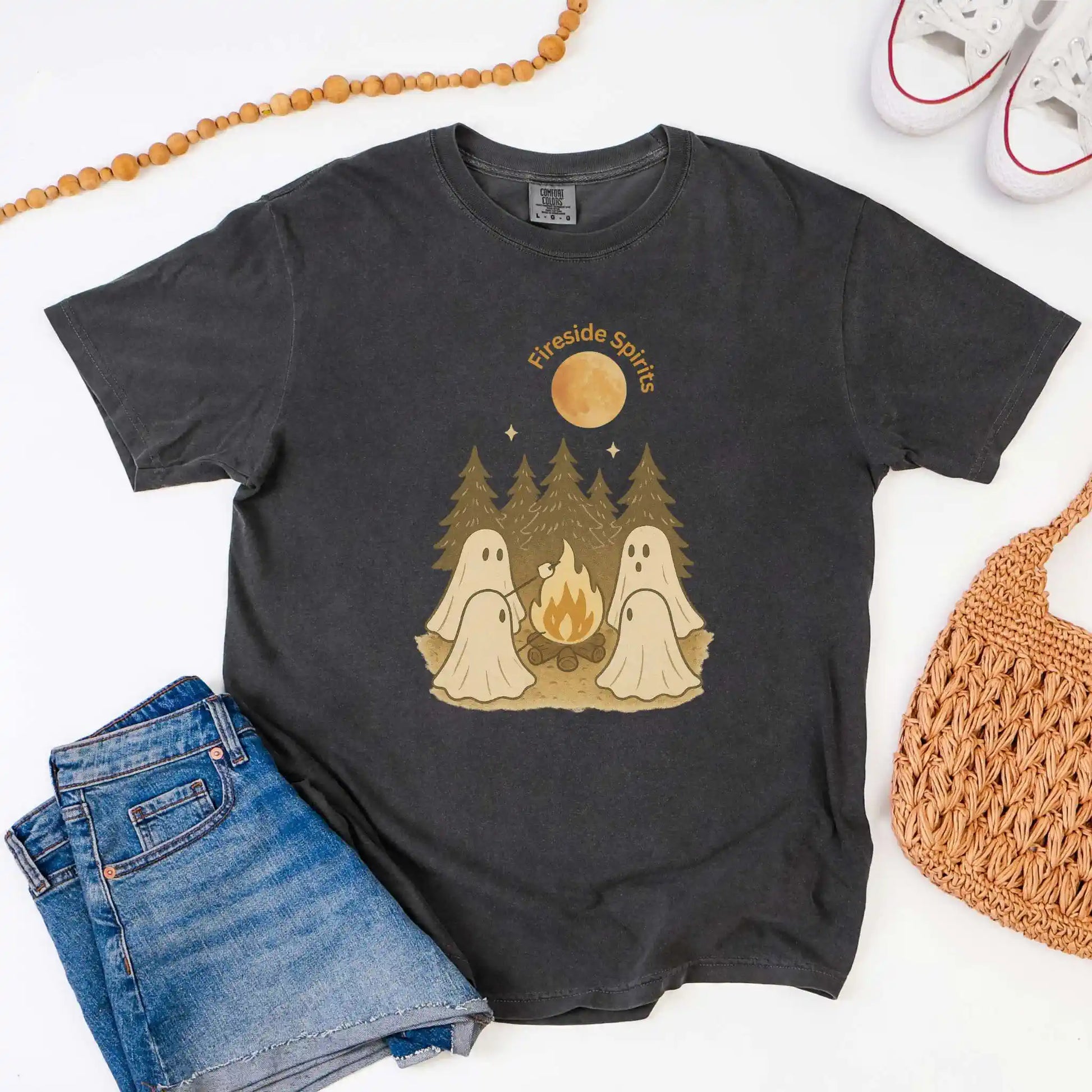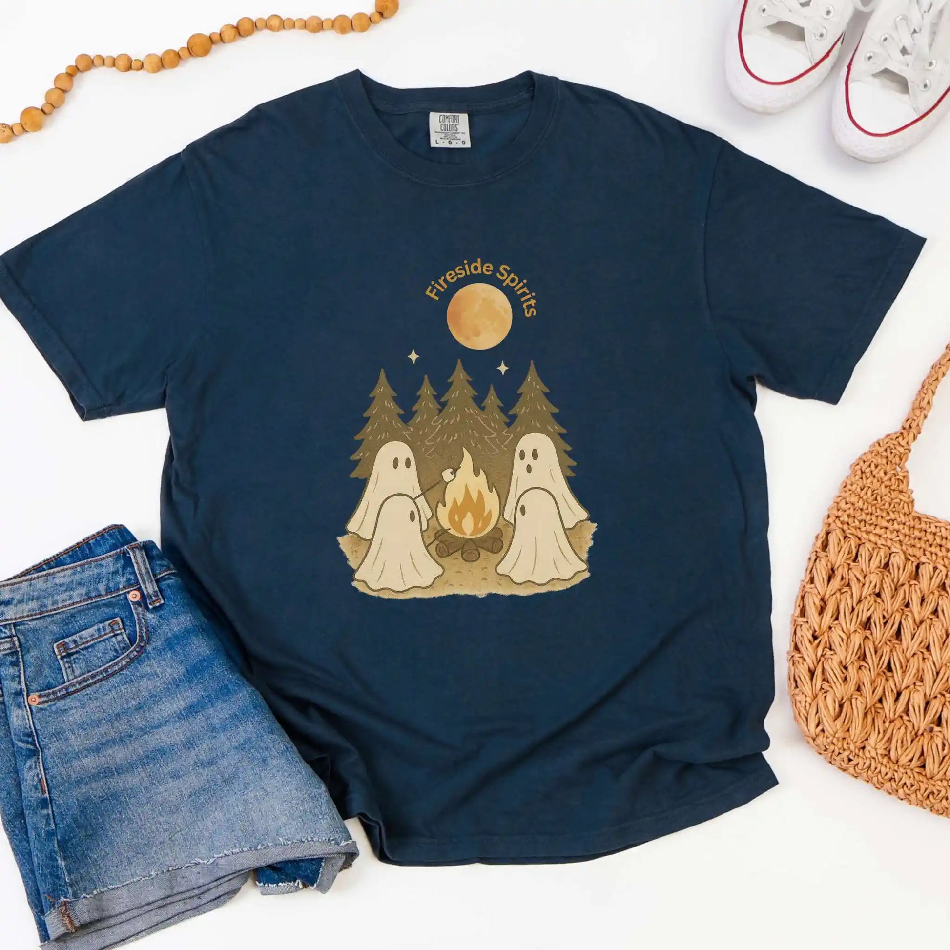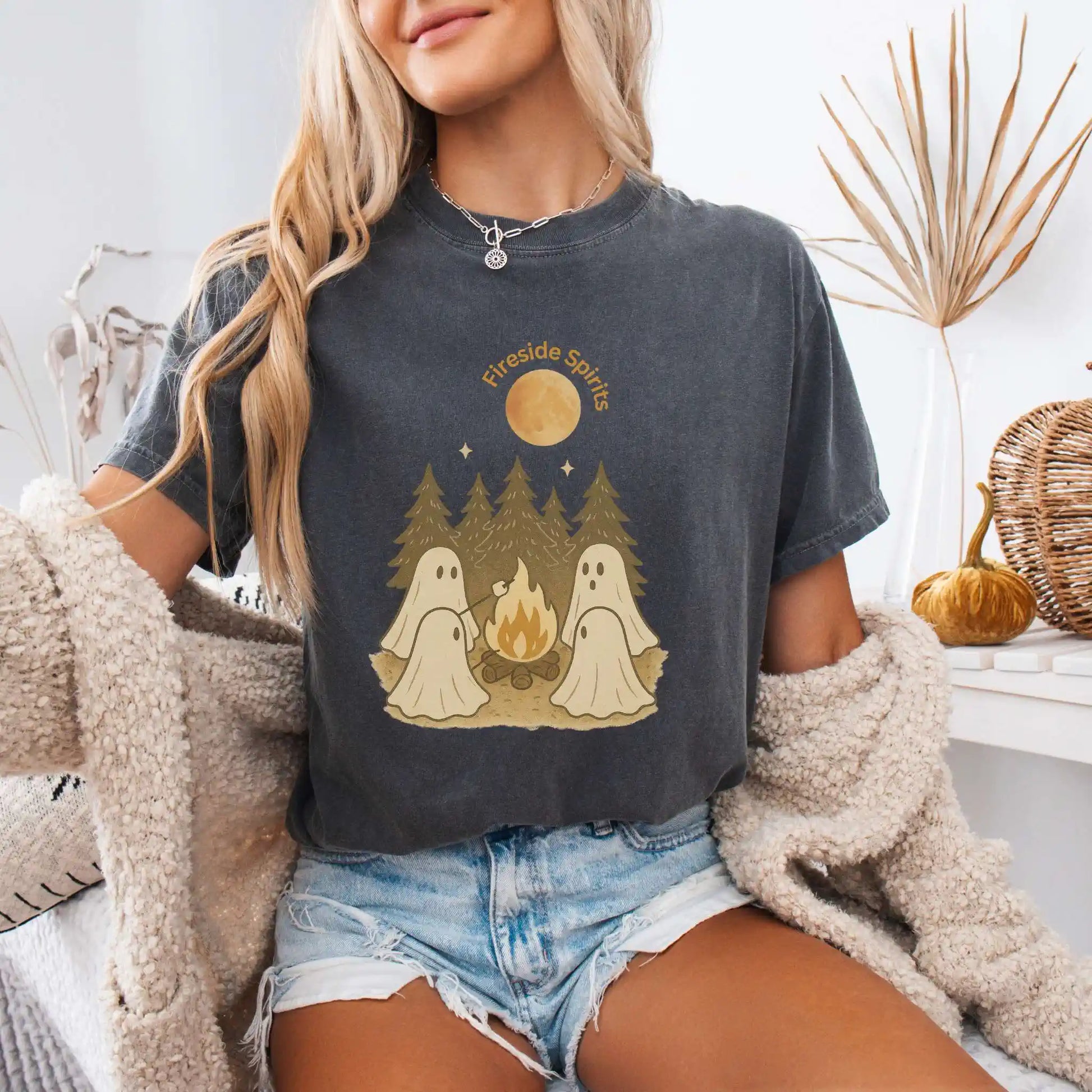 Features a front graphic of “Fireside Spirits” with four ghosts sitting around a fire in the woods, roasting marshmallows beneath tall pines and a full moon. Printed on the front of a t-shirt, this design is ideal for autumn camping trips, bonfire nights, or anyone who loves cozy evenings outdoors.
