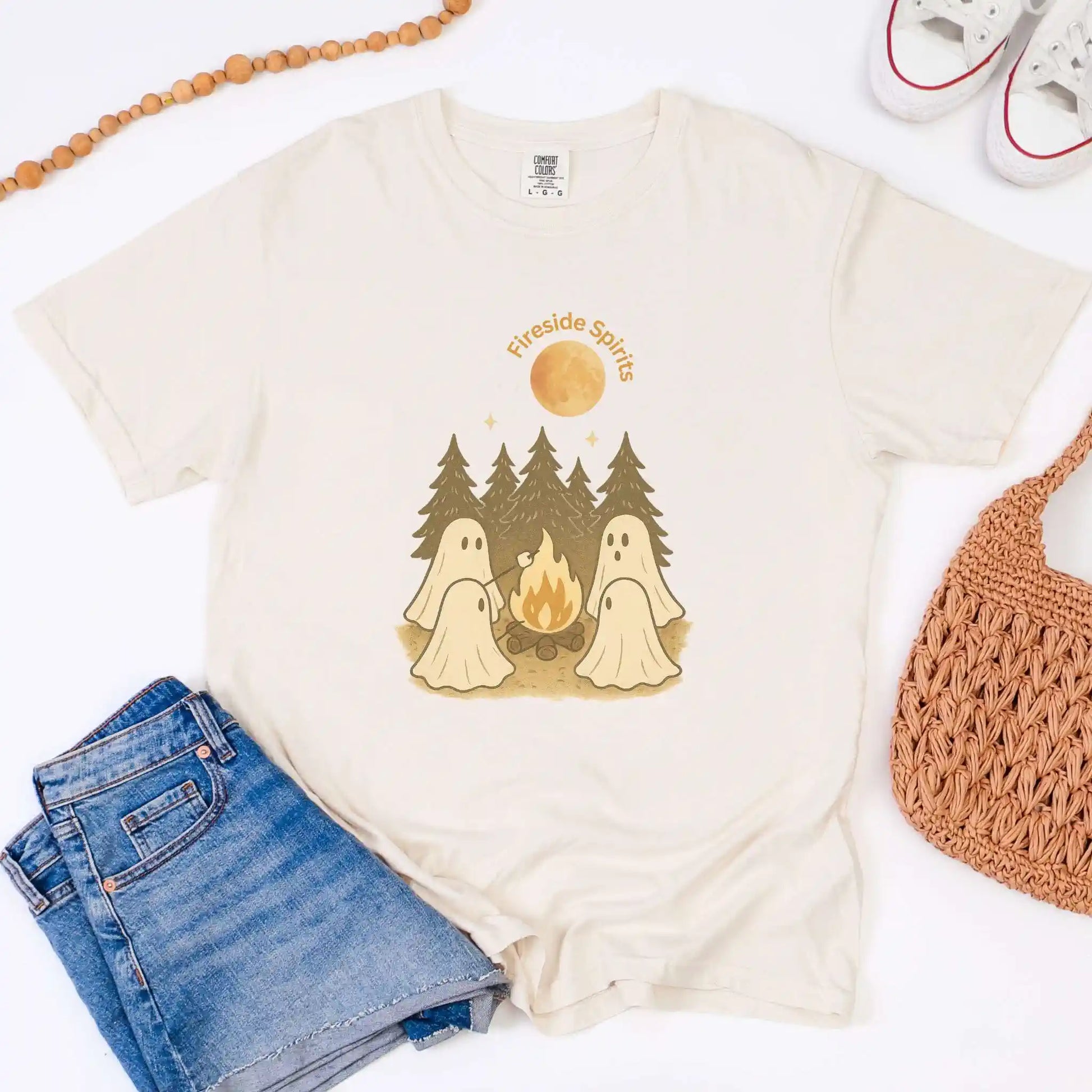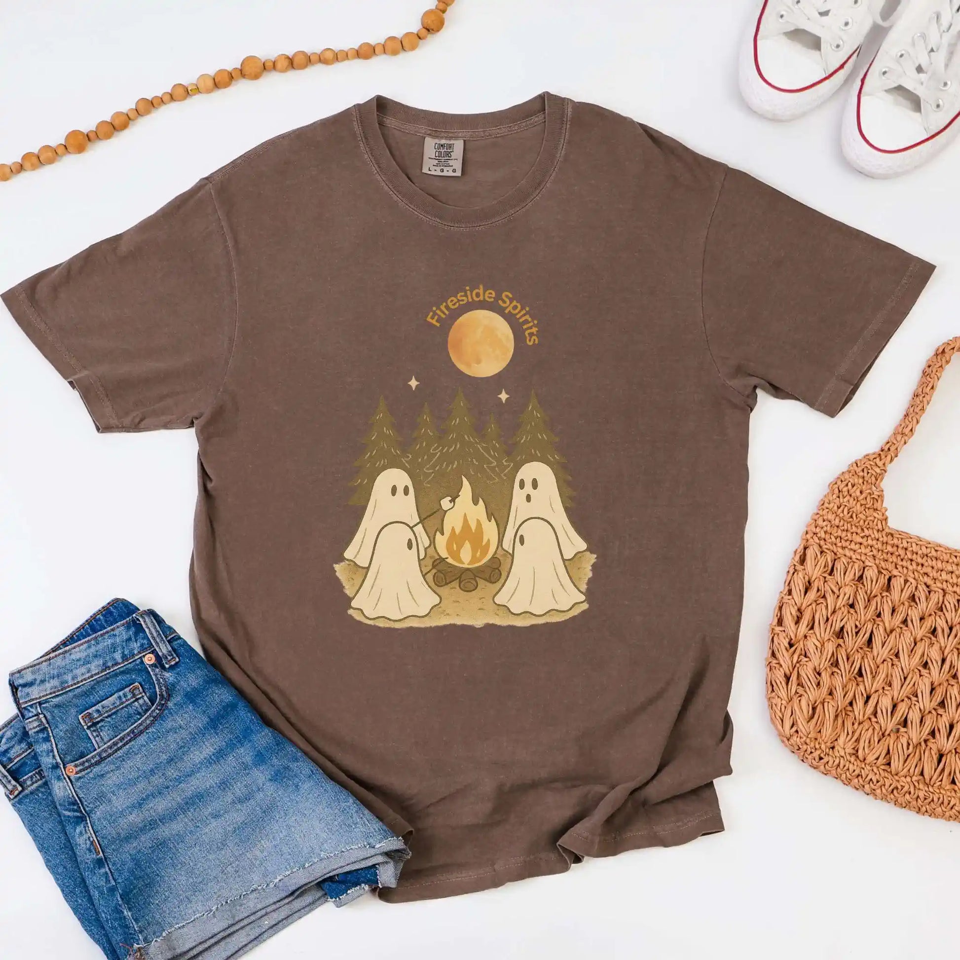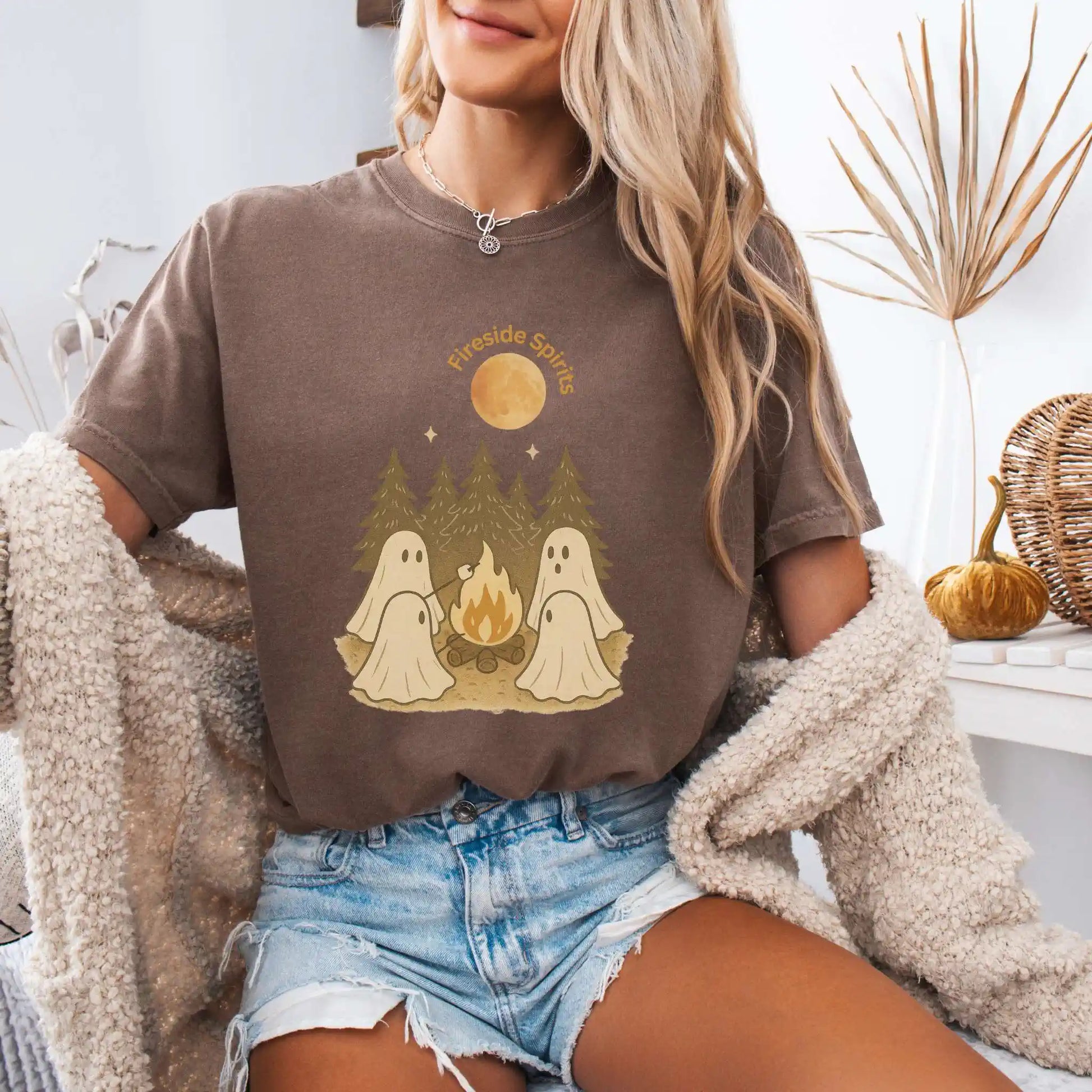 Features a front graphic of “Fireside Spirits” with four ghosts sitting around a fire in the woods, roasting marshmallows beneath tall pines and a full moon. Printed on the front of a t-shirt, this design is ideal for autumn camping trips, bonfire nights, or anyone who loves cozy evenings outdoors.