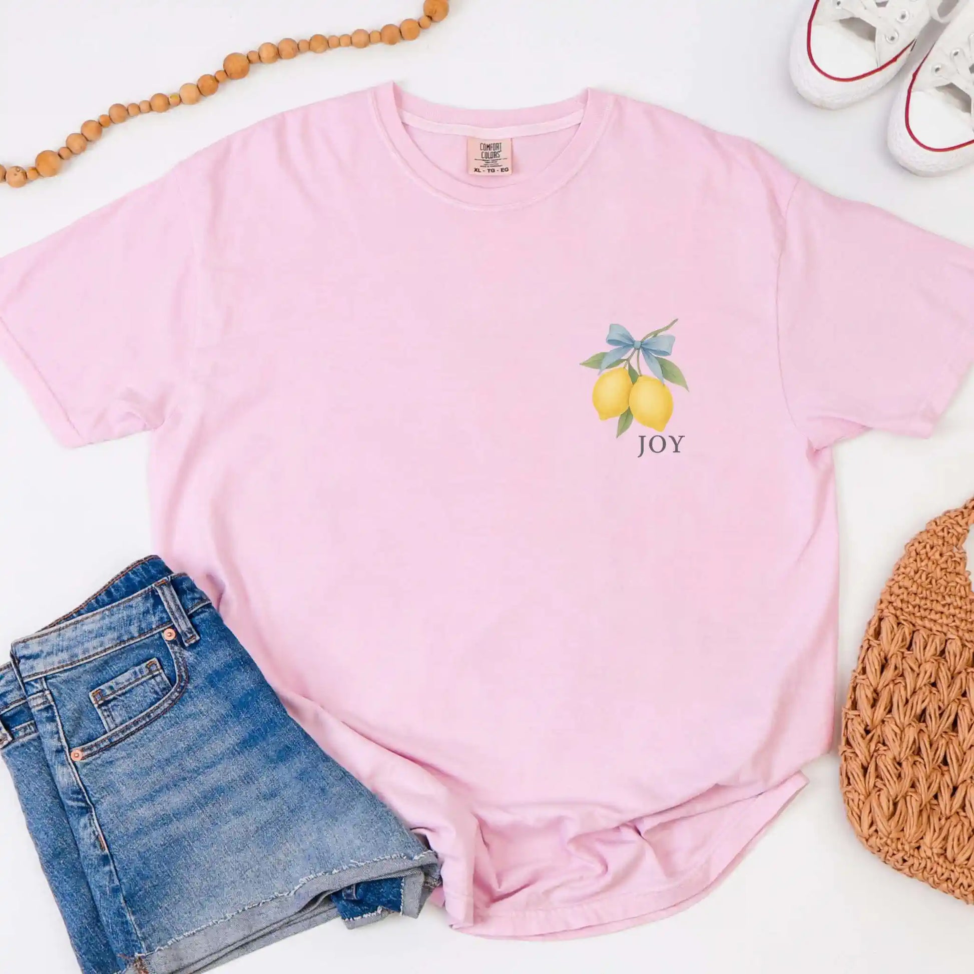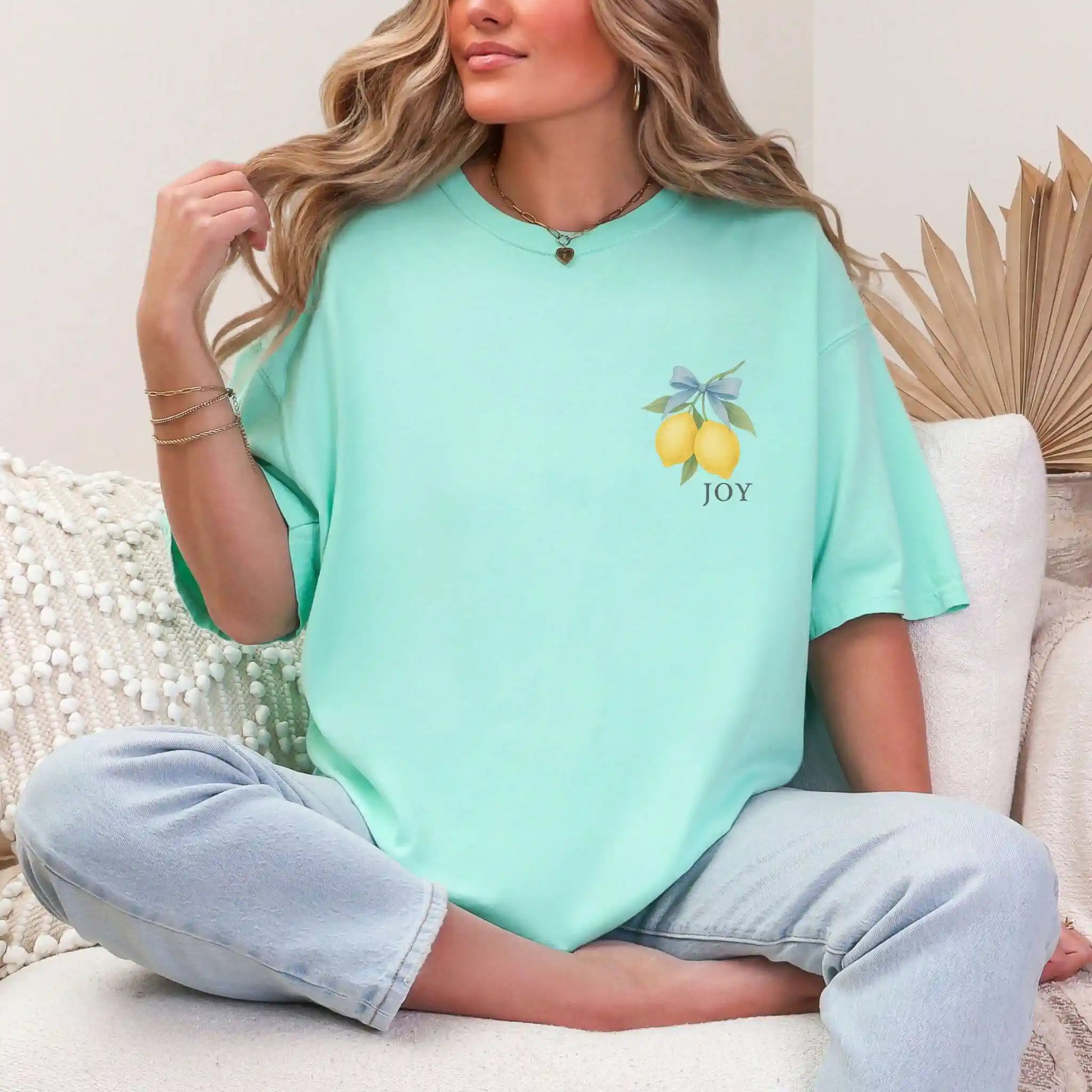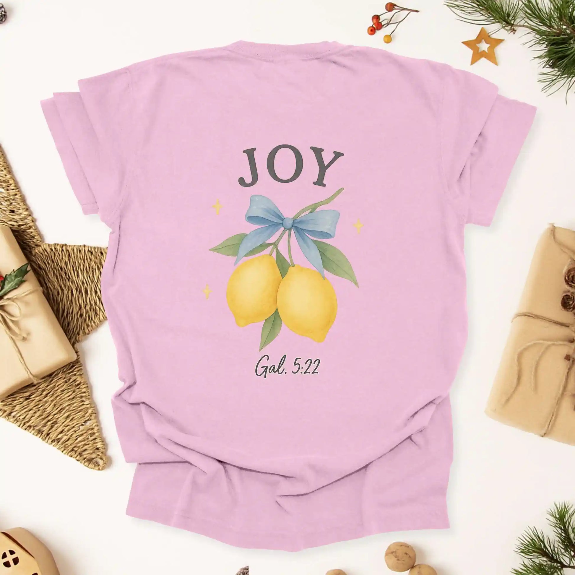 The back features a hand-painted lemon illustration tied with a soft bow and paired with the word “Joy” and Galatians 5:22. The front includes a coordinating pocket-sized lemon graphic. This t-shirt features a front-and-back design and is perfect for everyday encouragement or meaningful gifting.