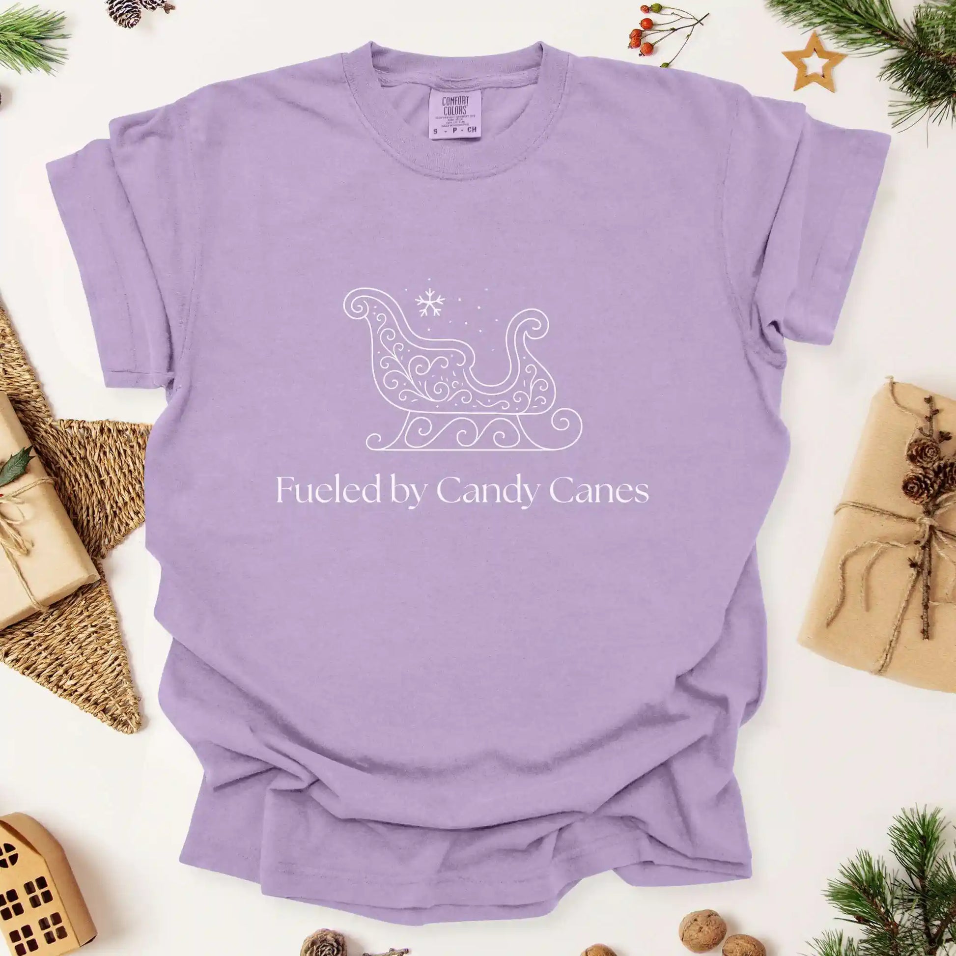Features a front centered design of a vintage sleigh with swirling details and a snowflake accent above the phrase “Fueled by Candy Canes.” Printed on a soft t-shirt perfect for cookie baking, gift wrapping, or sipping cocoa by the fire.