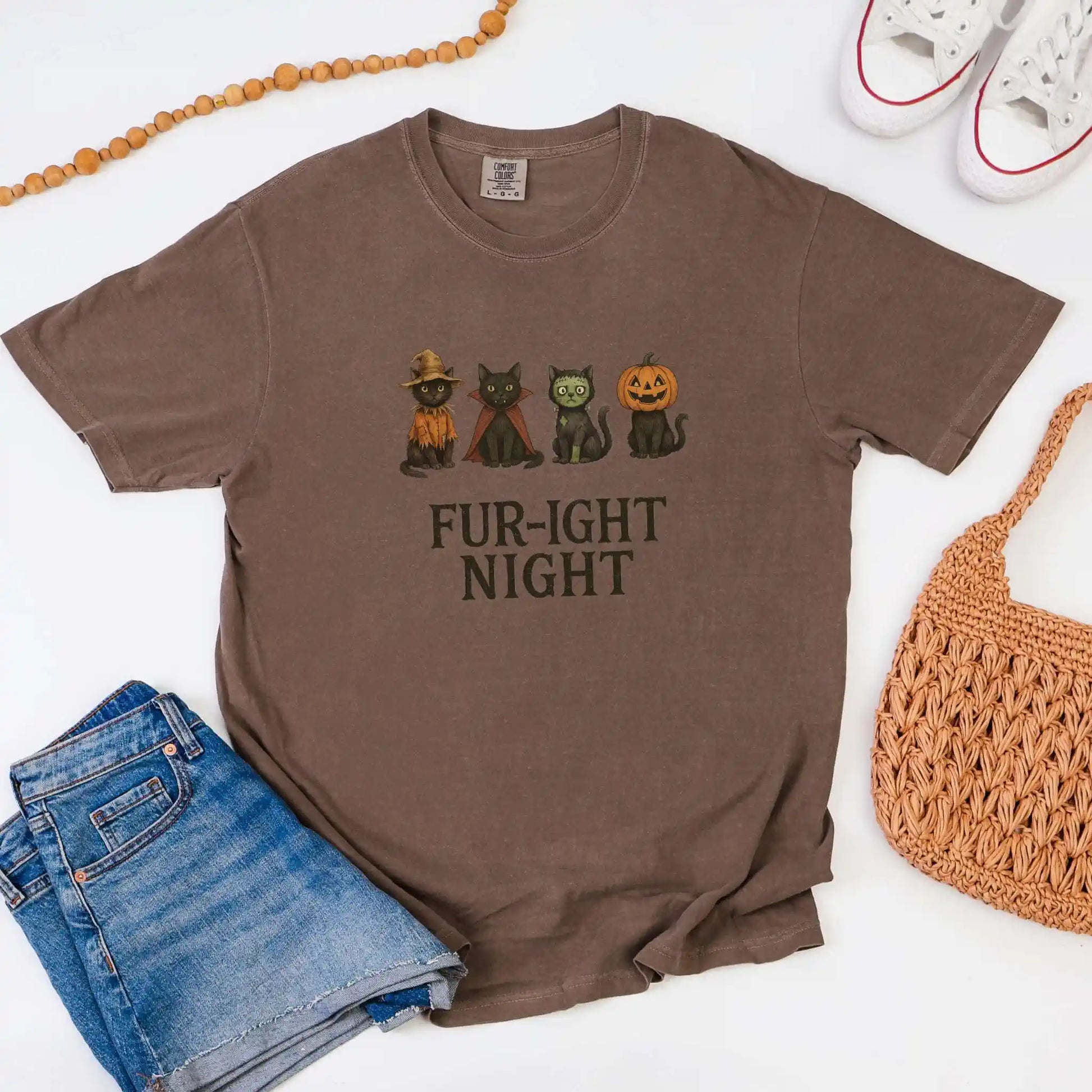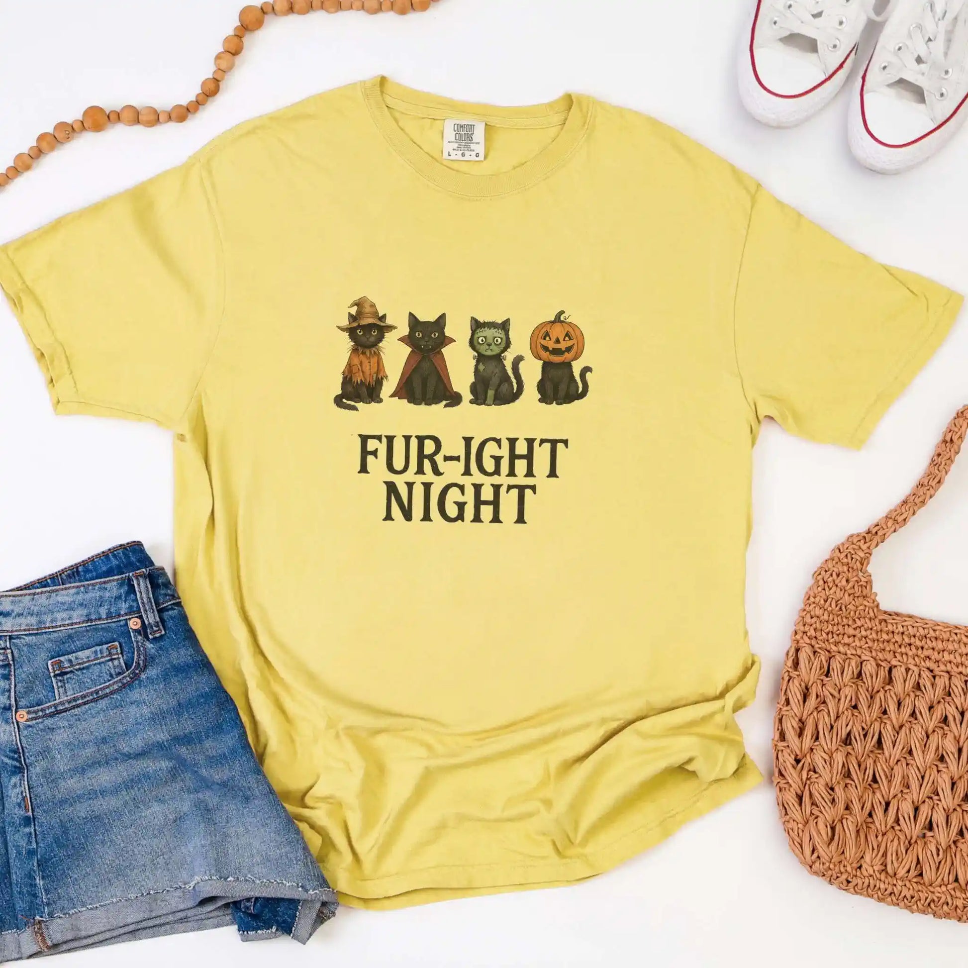 Bring a little spooky-cute energy to your wardrobe with this “Fur-ight Night” tee. Ideal for cat lovers and Halloween fans alike, it blends a touch of humor with cozy seasonal style.