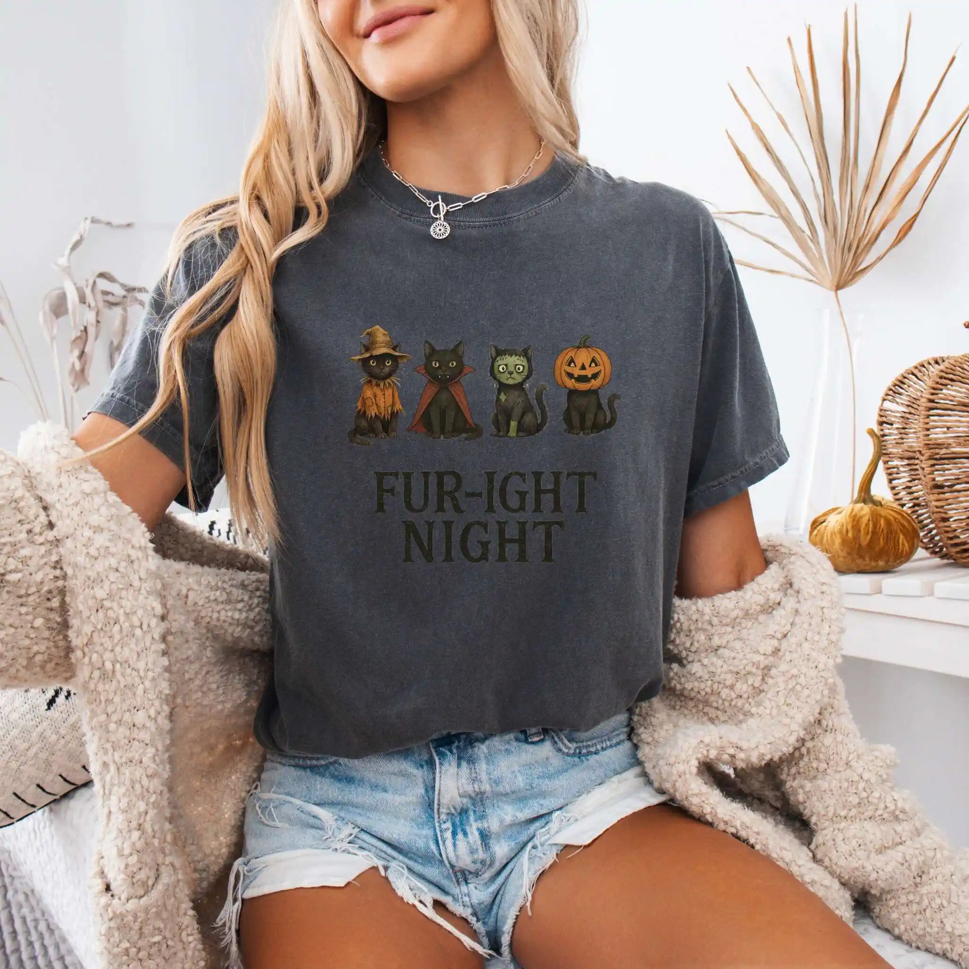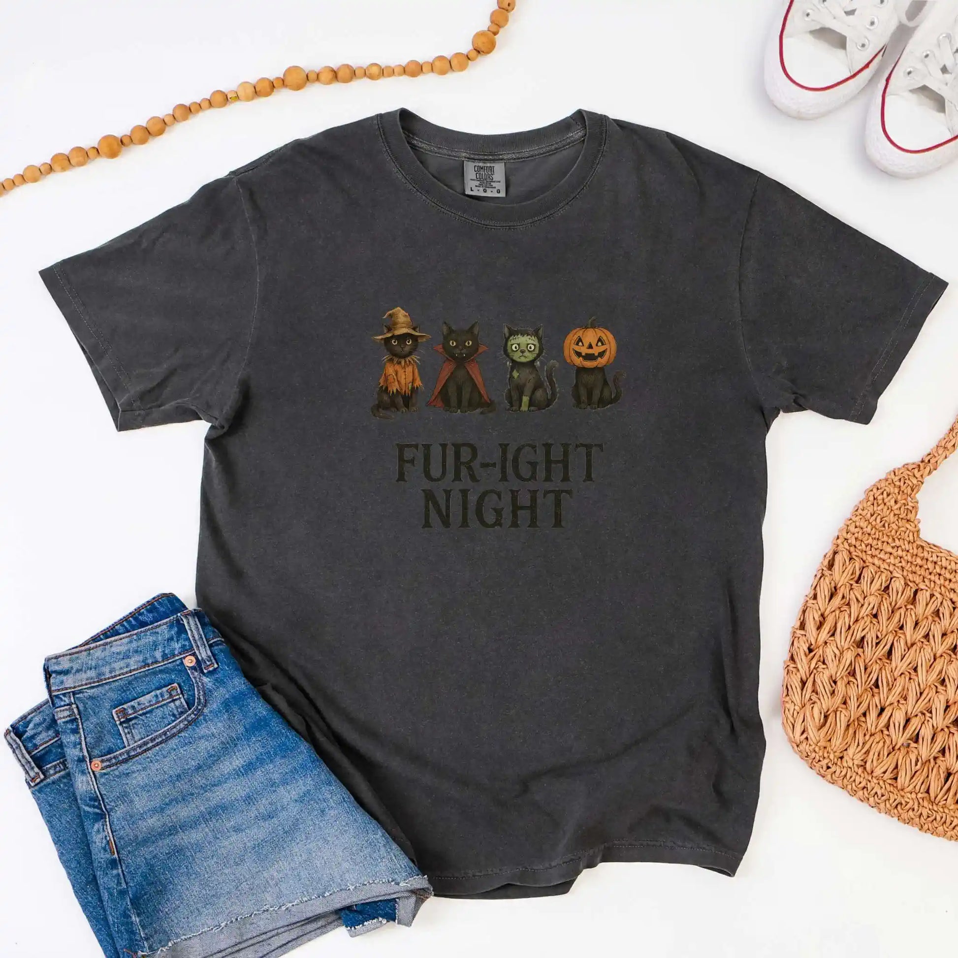 The design showcases four black cats dressed as classic Halloween characters — a scarecrow, a vampire, Frankenstein, and a pumpkin-head — lined up above the bold phrase “Fur-ight Night.” Printed on the front of a soft t-shirt, it’s a fun choice for trick-or-treating, movie marathons, or casual fall wear.