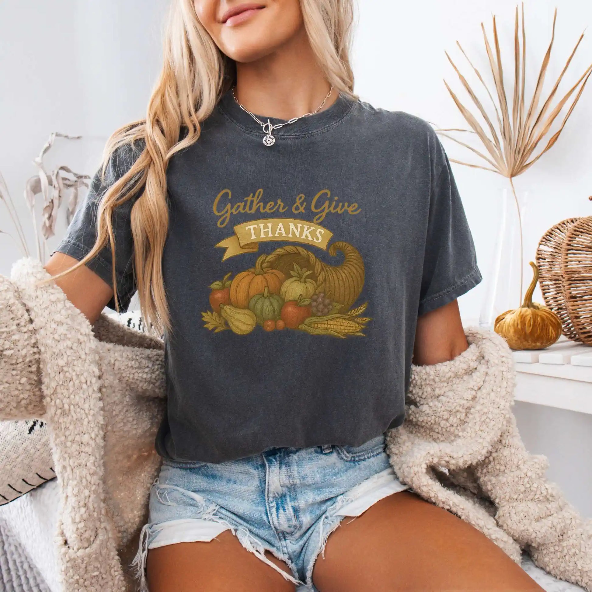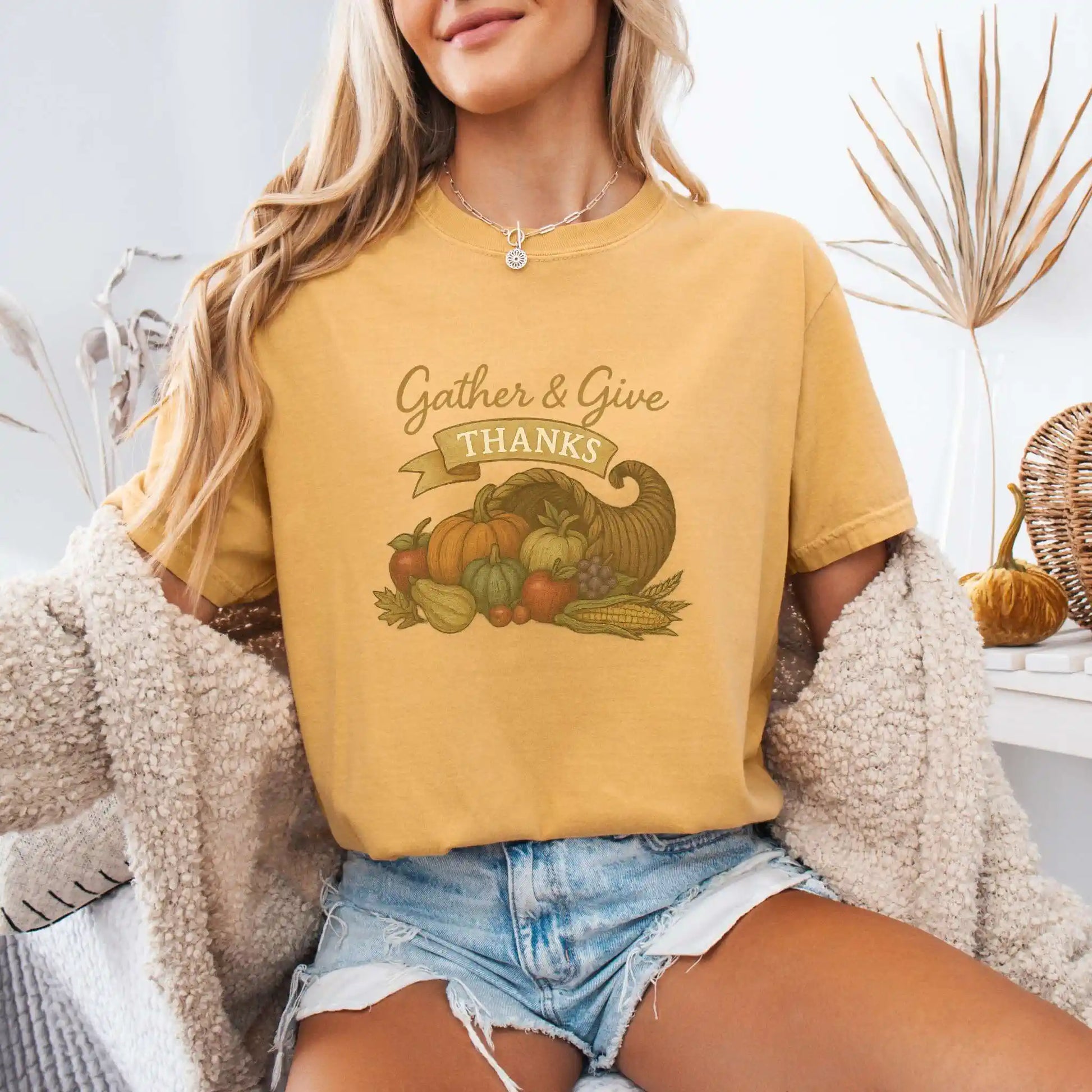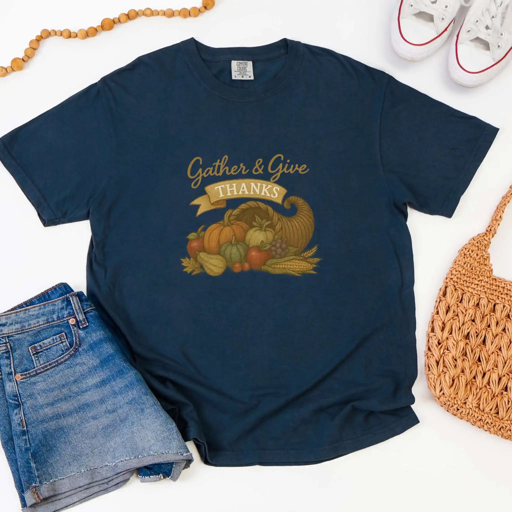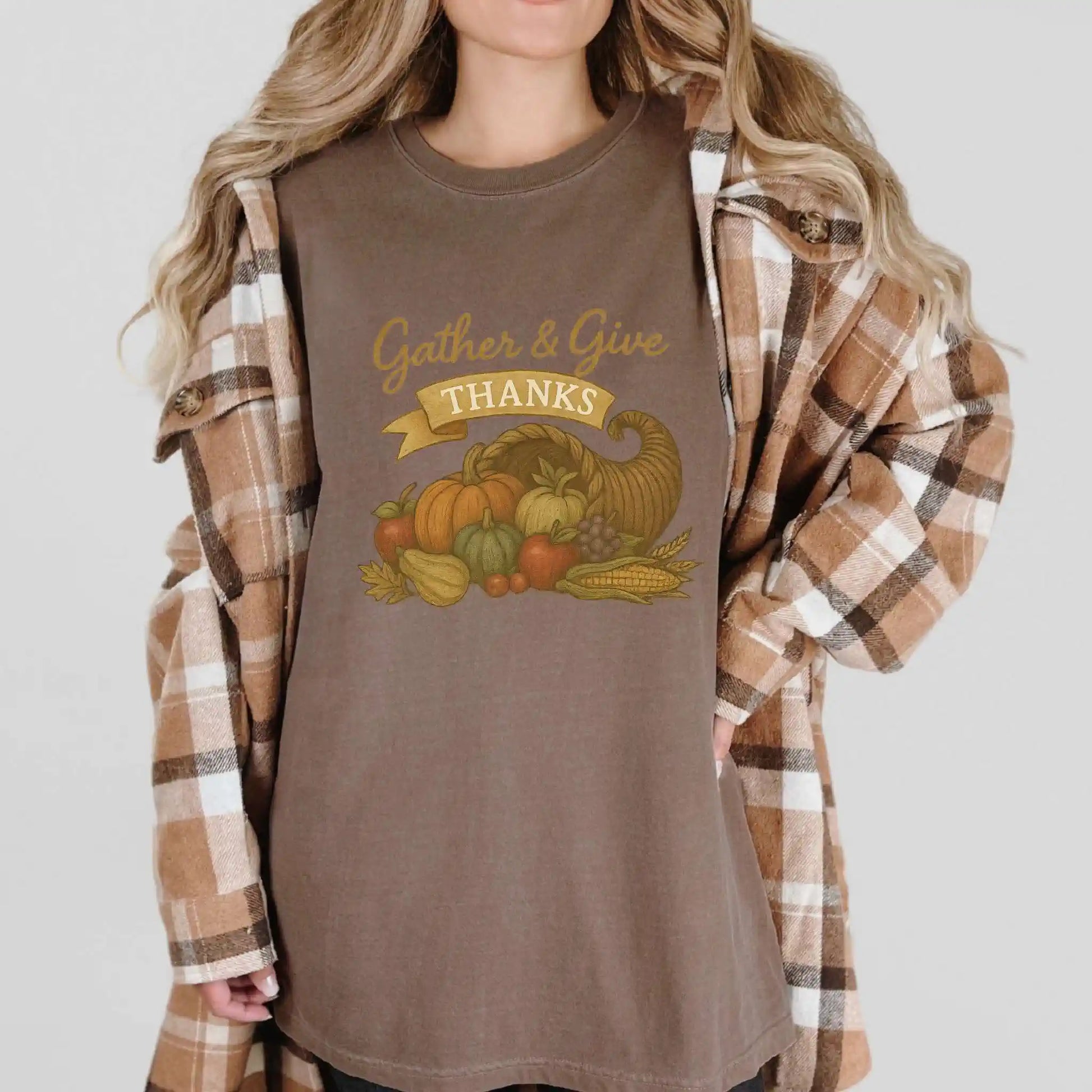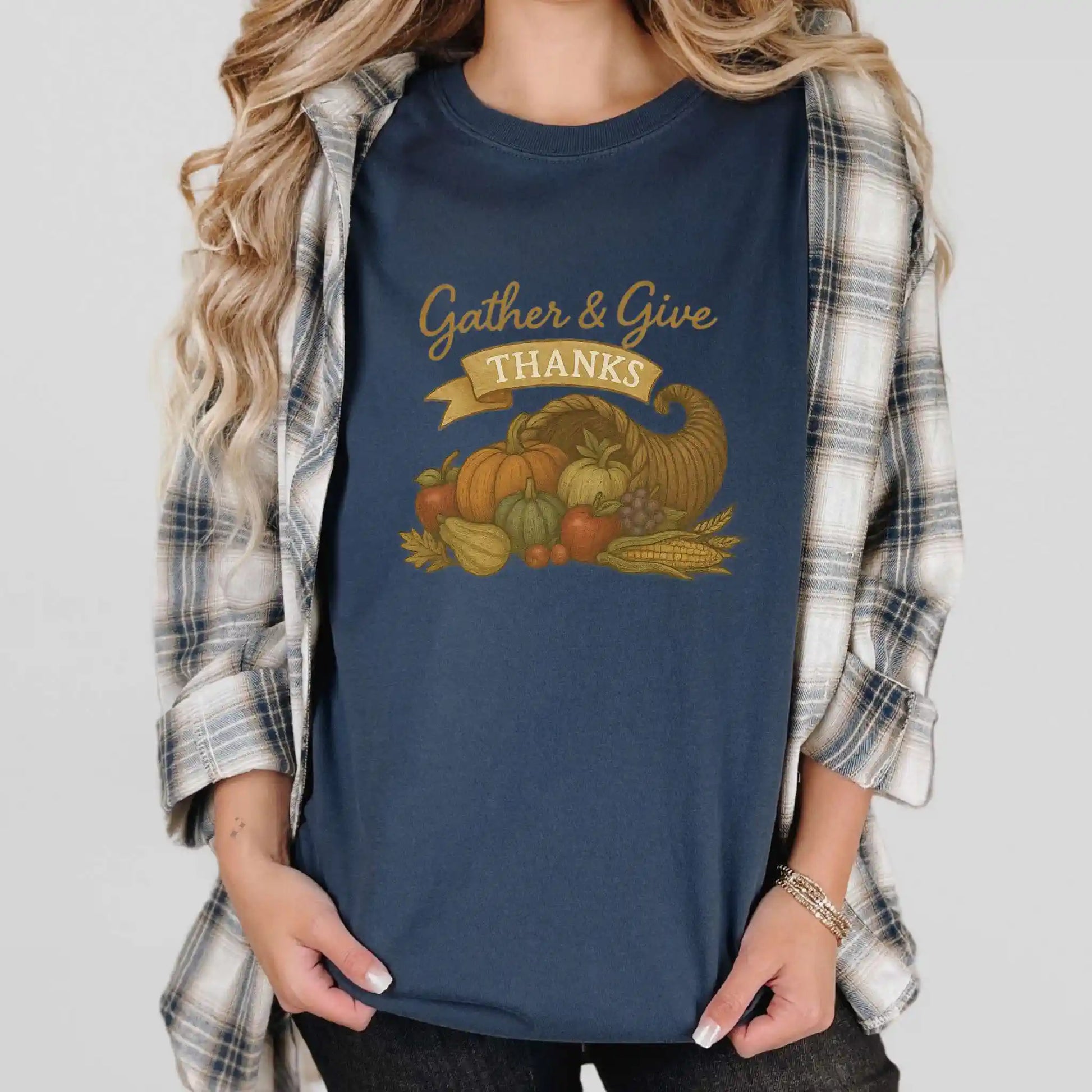 The design showcases a classic cornucopia overflowing with pumpkins, squash, apples, grapes, and corn, topped with a banner reading “Gather & Give Thanks.” Centered on the front of the t-shirt, it’s a timeless seasonal piece made for Thanksgiving dinner or any harvest celebration.