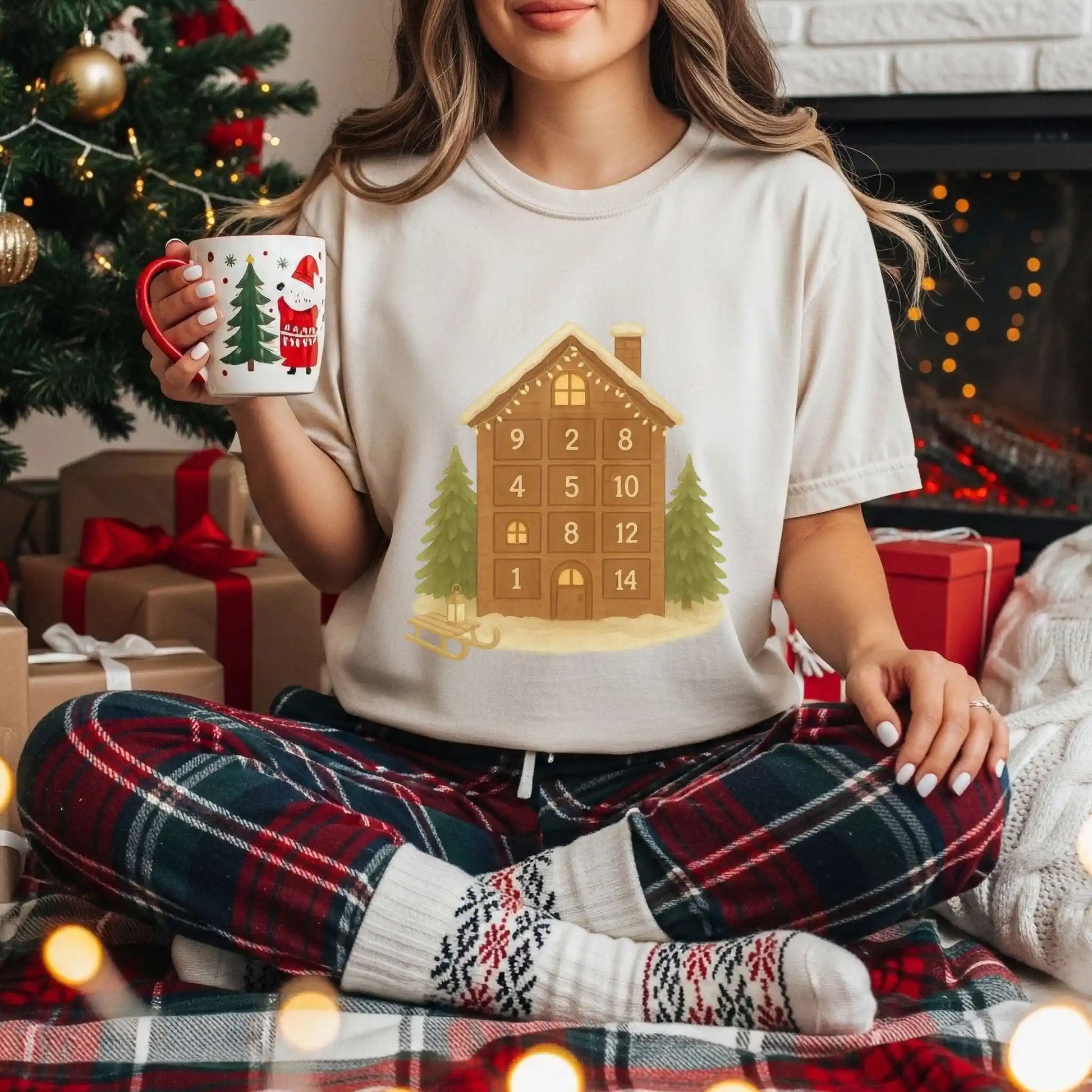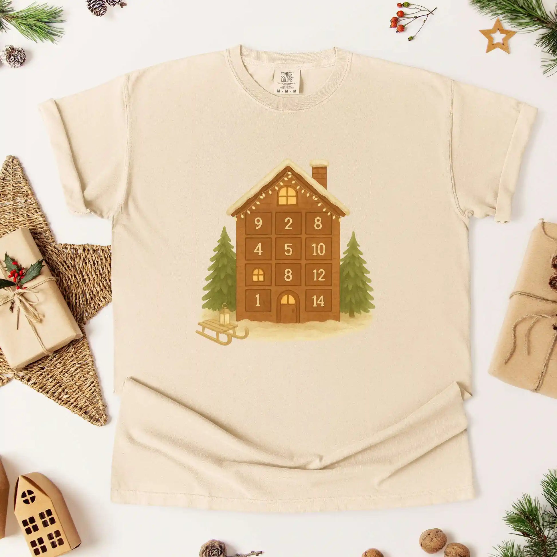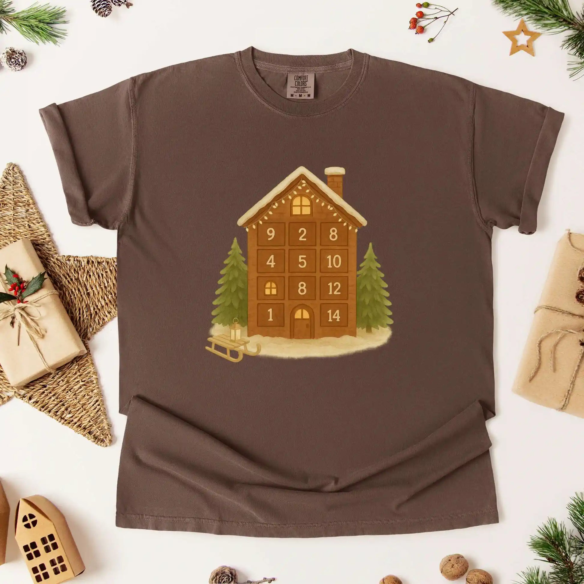 The artwork showcases a gingerbread-style house with numbered advent doors, glowing windows, and snowy evergreens. Printed on the front of the t-shirt, it’s a festive favorite for holiday baking nights, decorating the tree, or cozy evenings at home.