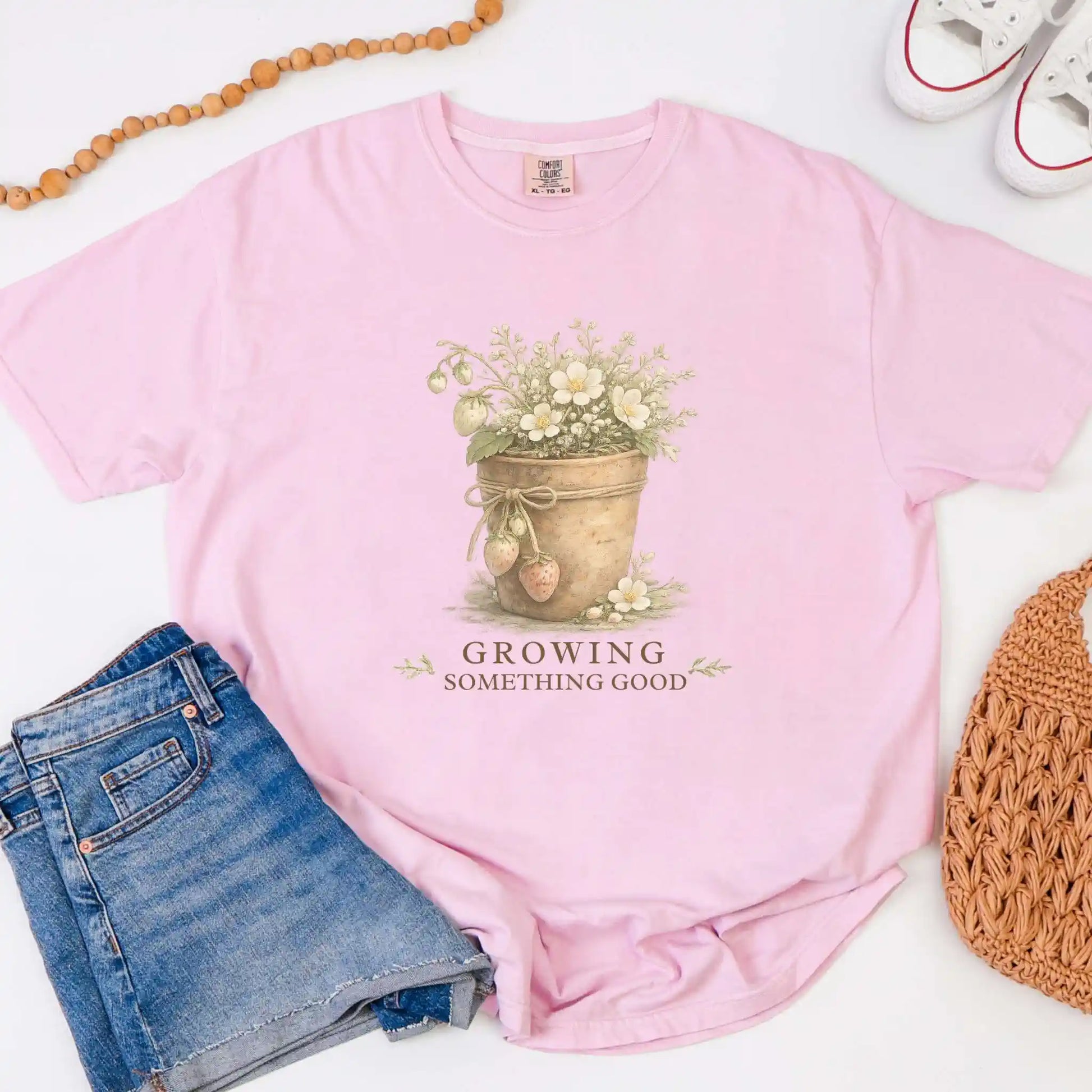 The front design features a rustic garden pot filled with soft florals and strawberries, tied with twine and illustrated in a delicate, storybook style. The words “Growing Something Good” appear beneath the artwork in warm, grounded typography. This front design is printed on a t-shirt and suits everyday wear rooted in intention and care.