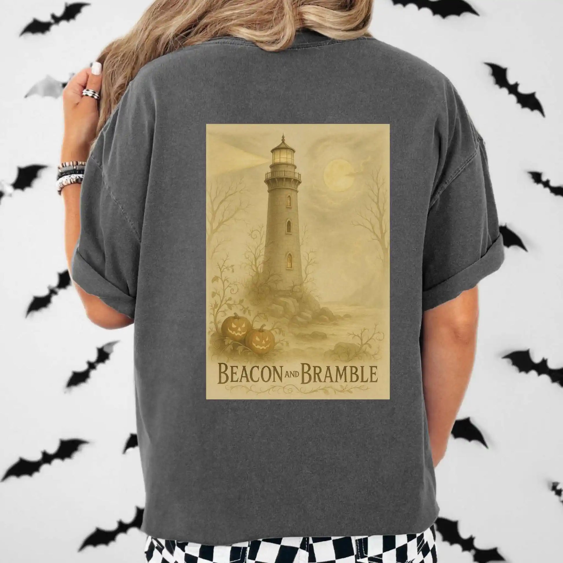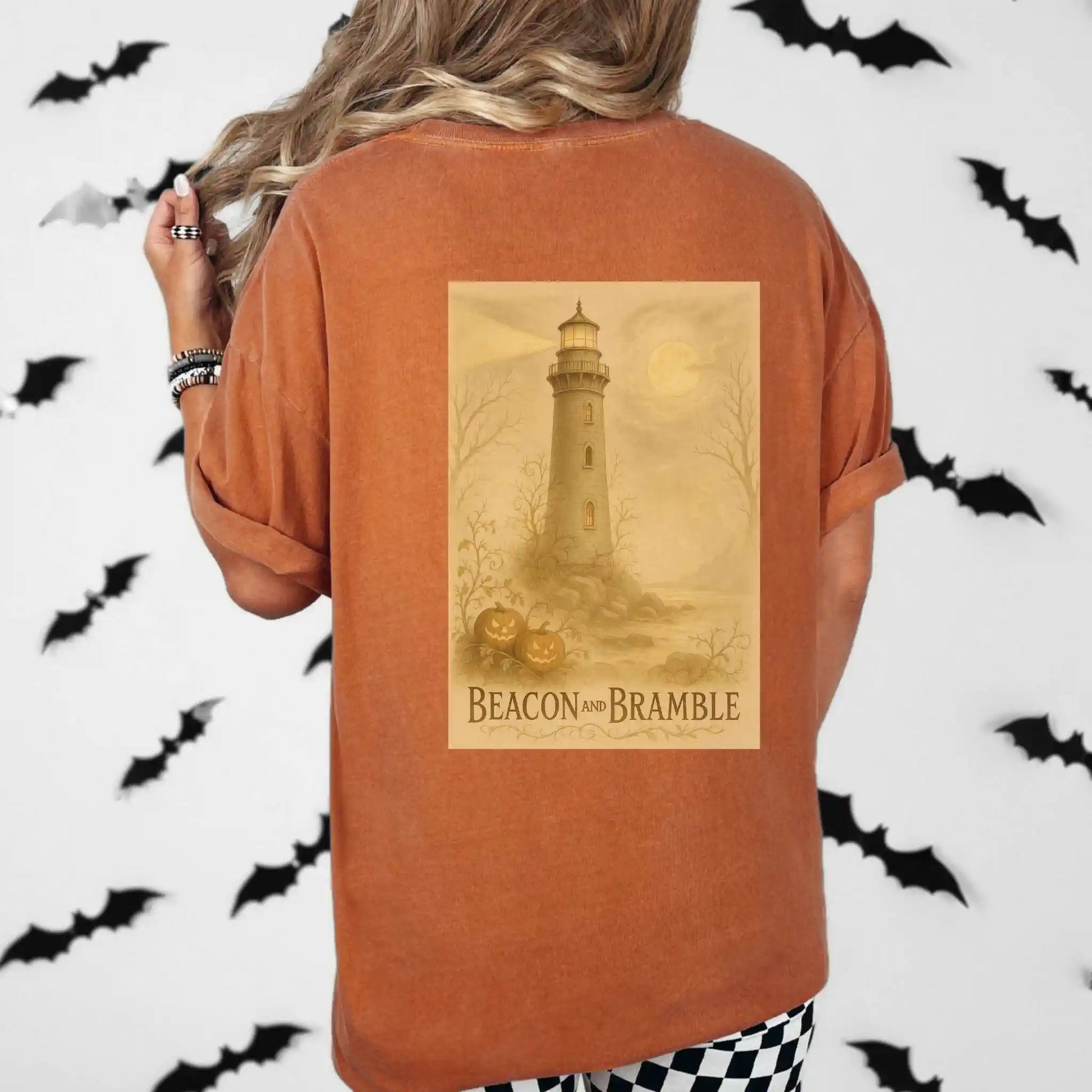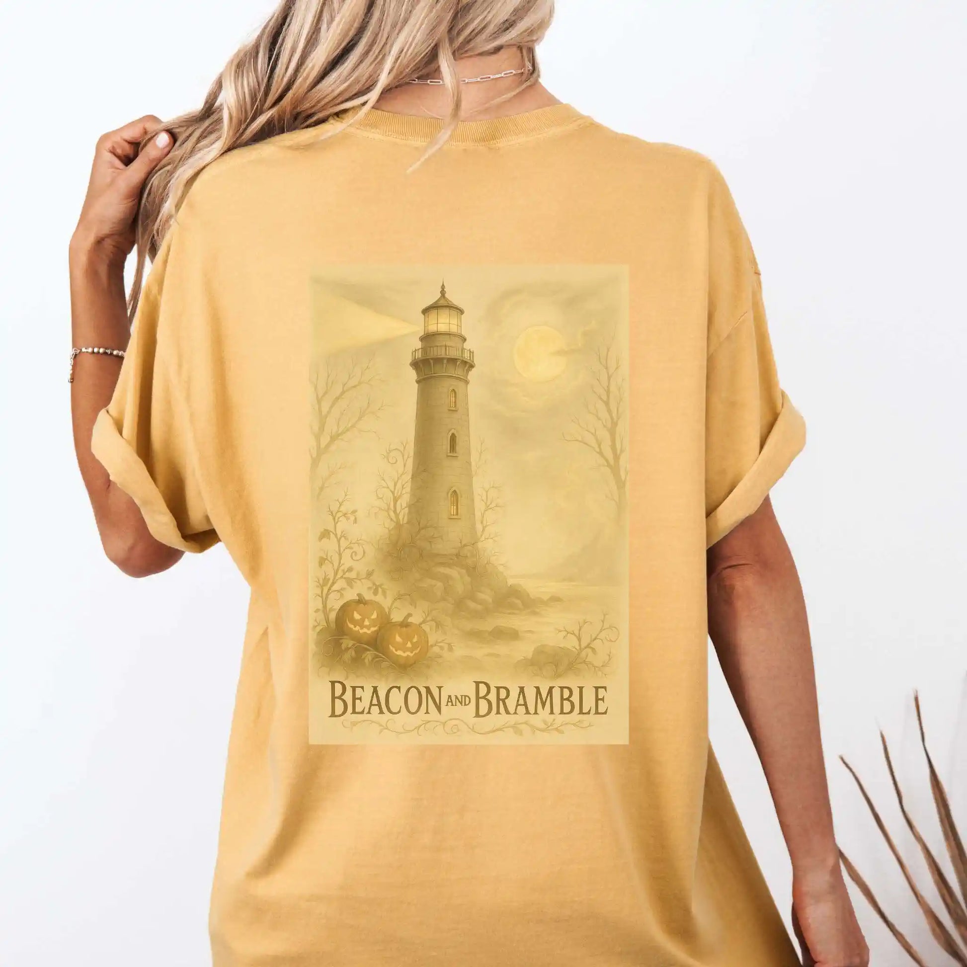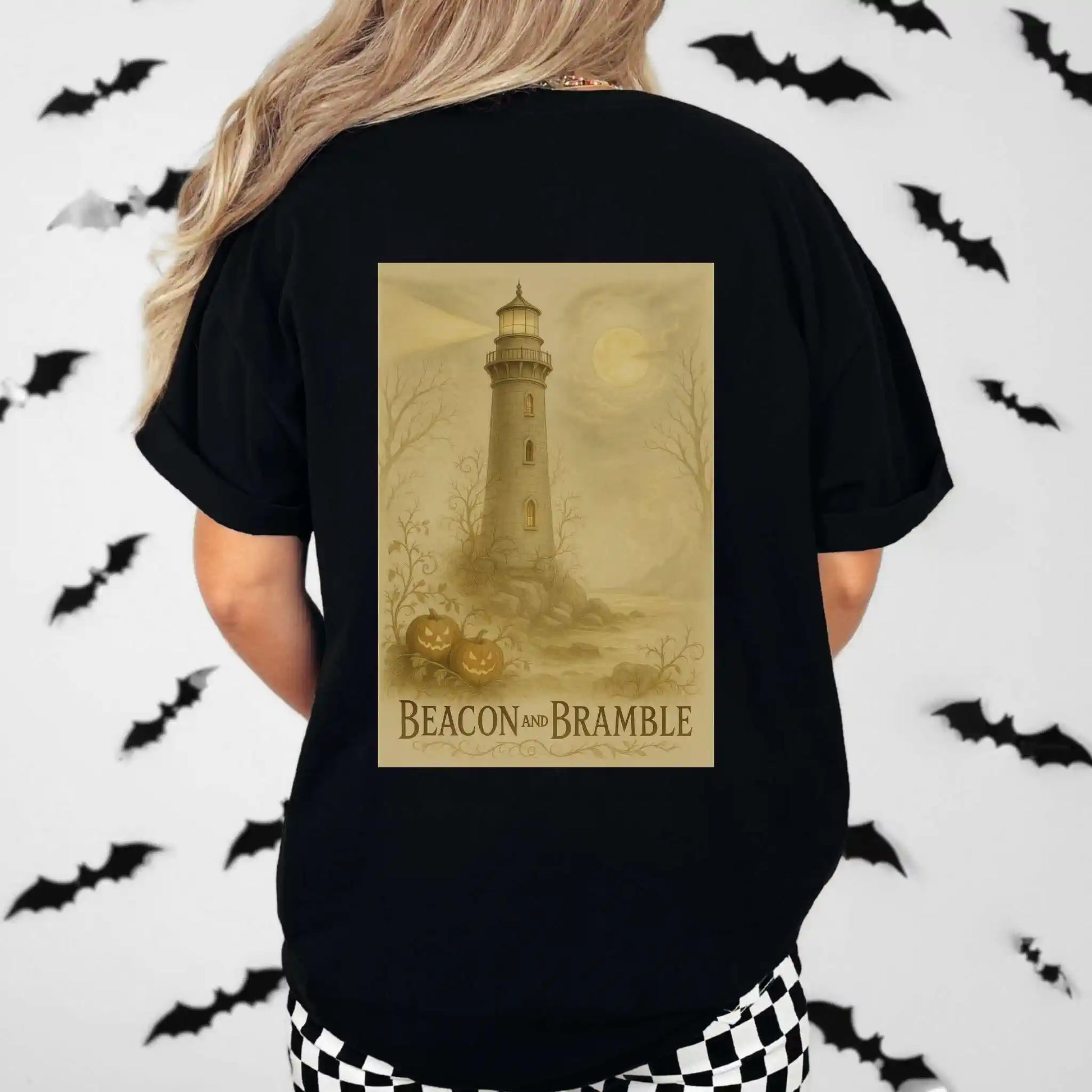 this artwork features a moonlit lighthouse framed by bare trees, jack-o’-lanterns, and autumn mist — all washed in warm golden tones. “Beacon and Bramble” is etched below in antique-style lettering. A perfect choice for the romantics of Halloween.