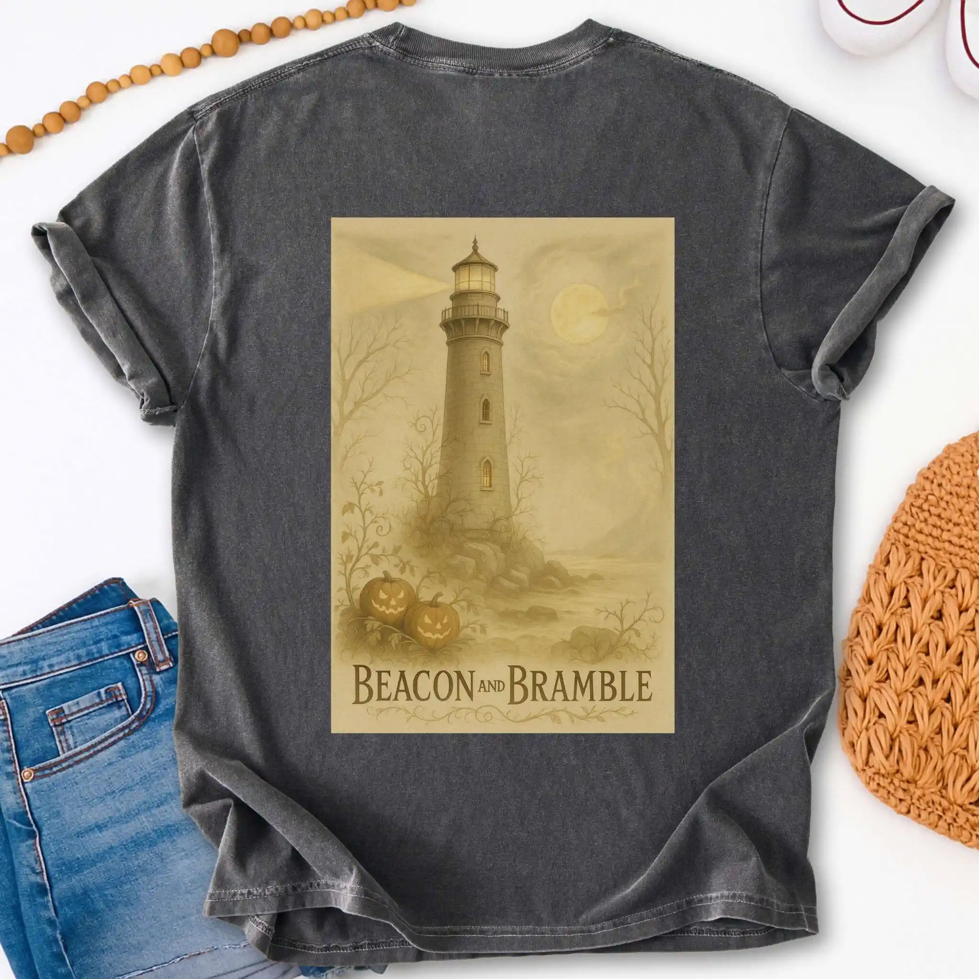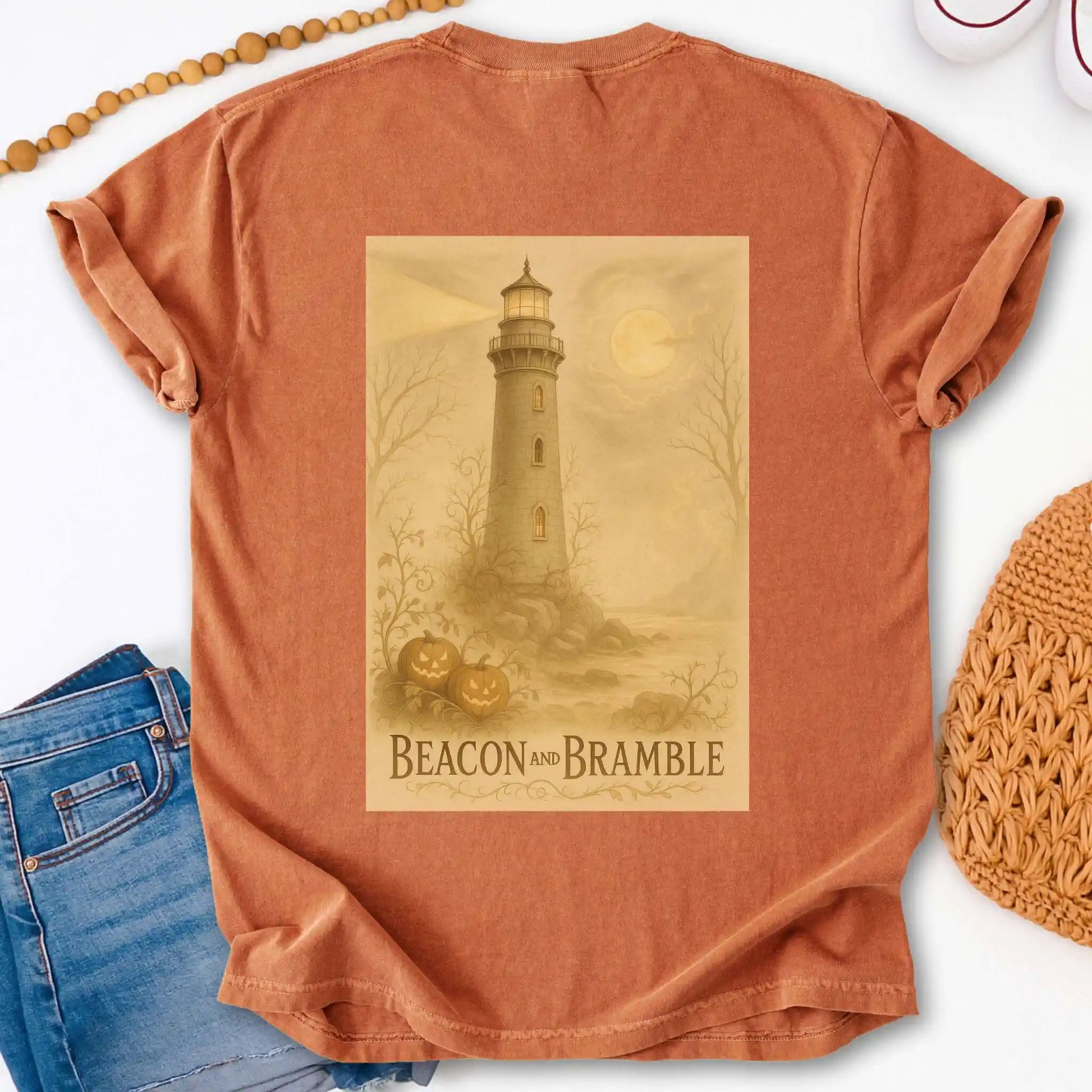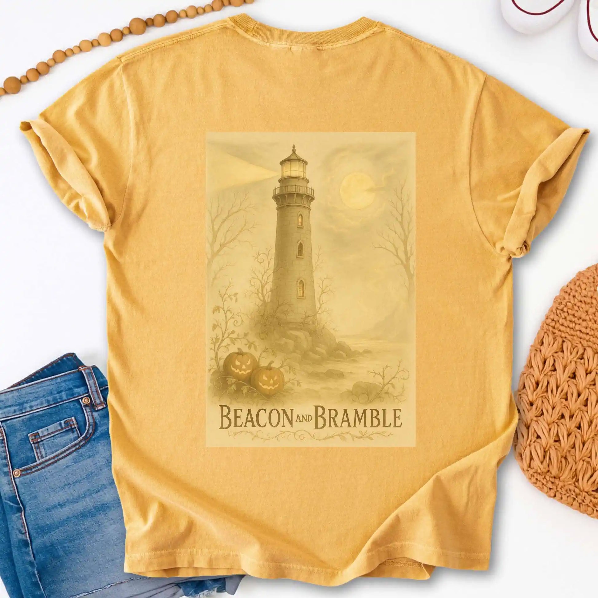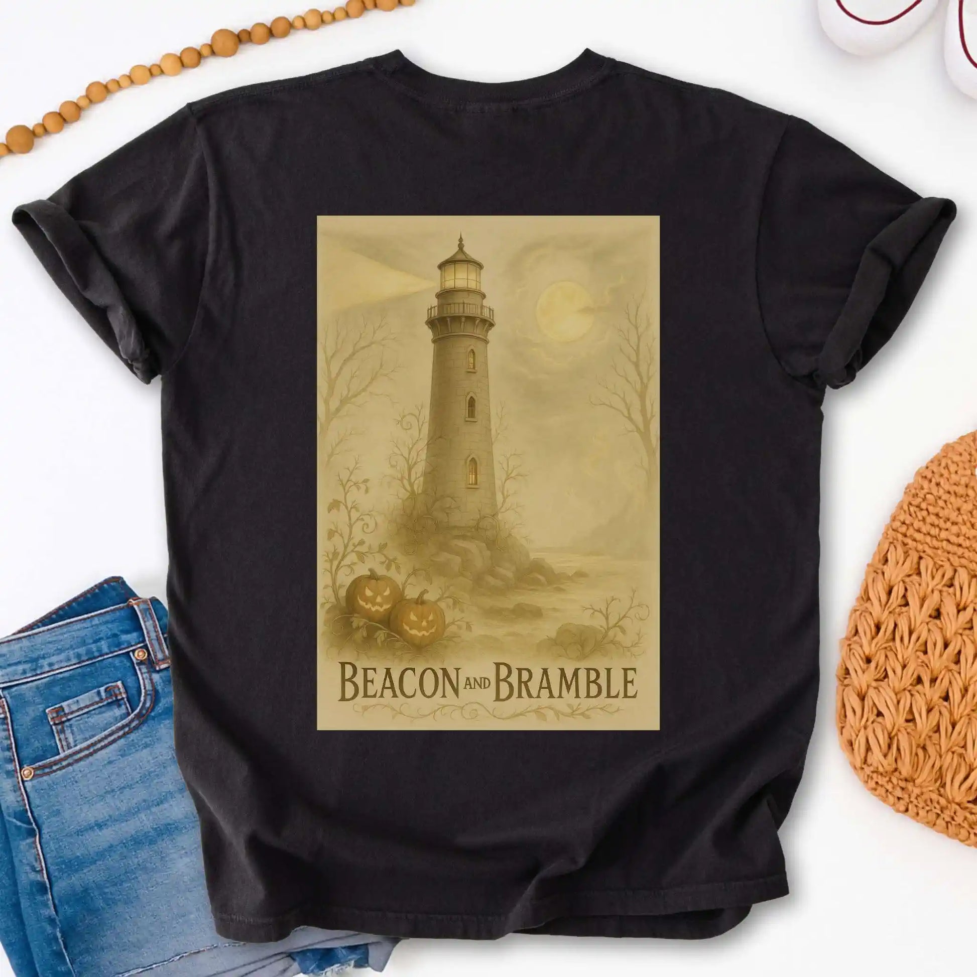 this artwork features a moonlit lighthouse framed by bare trees, jack-o’-lanterns, and autumn mist — all washed in warm golden tones. “Beacon and Bramble” is etched below in antique-style lettering. A perfect choice for the romantics of Halloween.