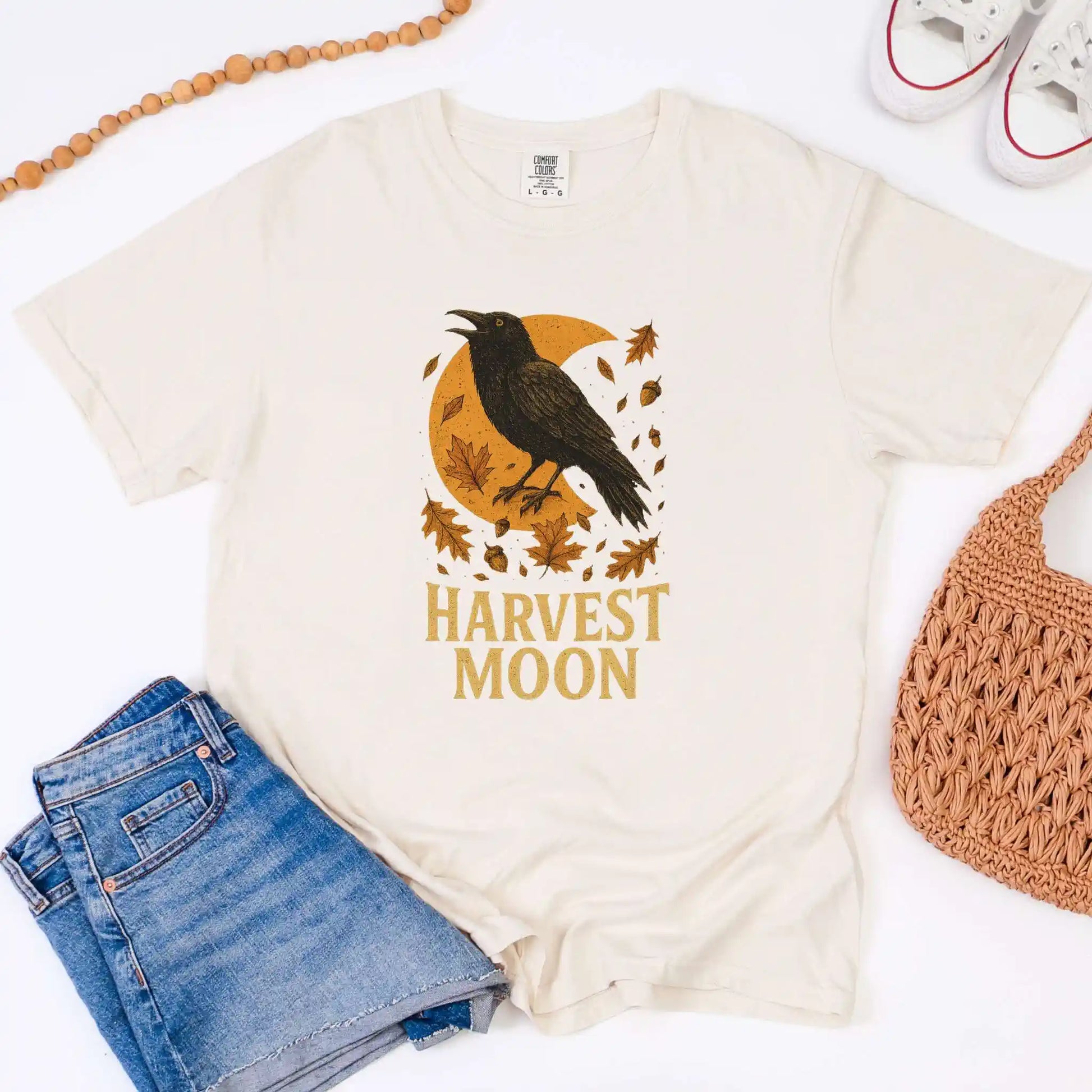 Celebrate the enchantment of crisp fall evenings with this striking “Harvest Moon” design. A bold raven takes center stage against a golden moon, surrounded by swirling autumn leaves and acorns — a nod to the season’s beauty and mystery. It’s a design that captures the stillness and wonder of harvest nights.