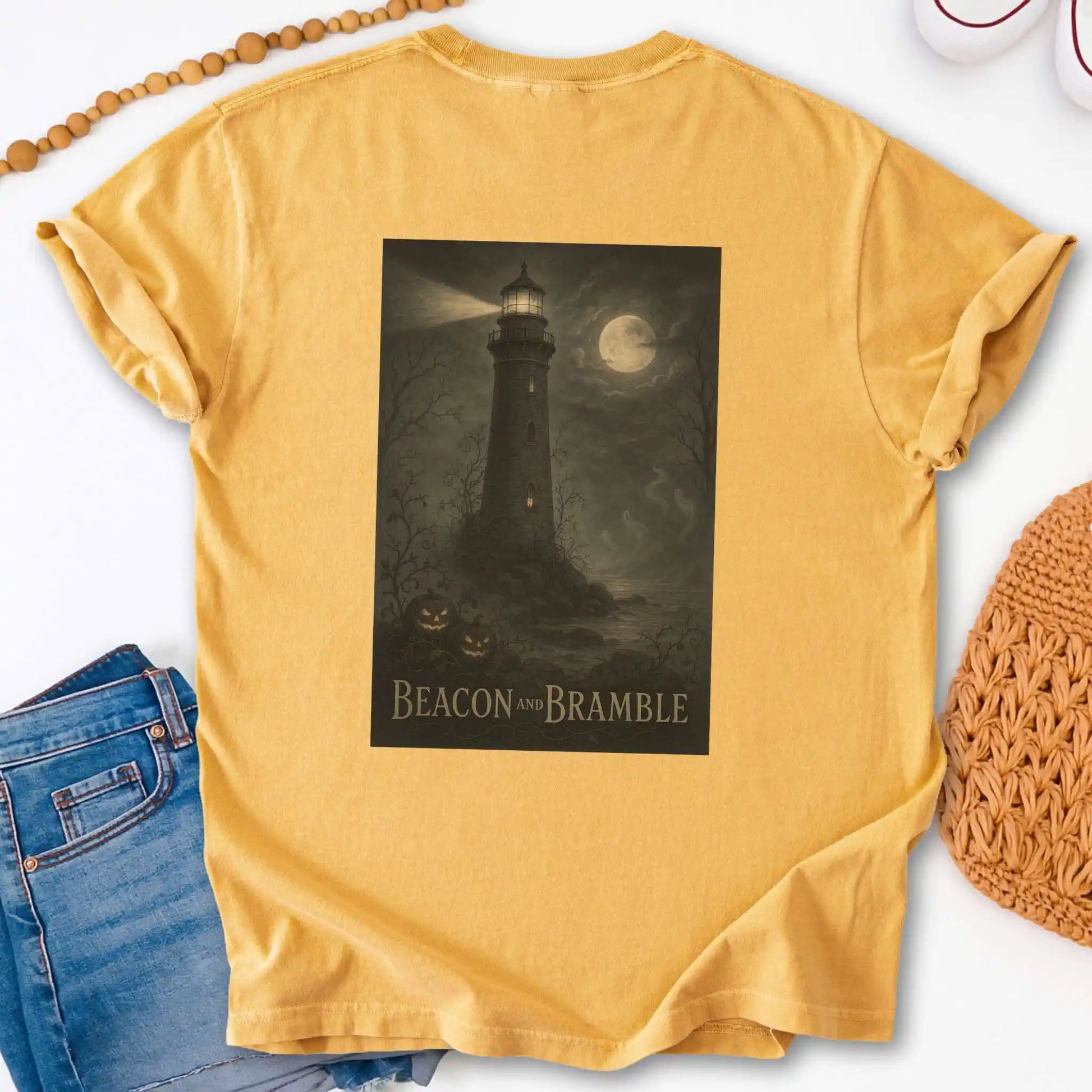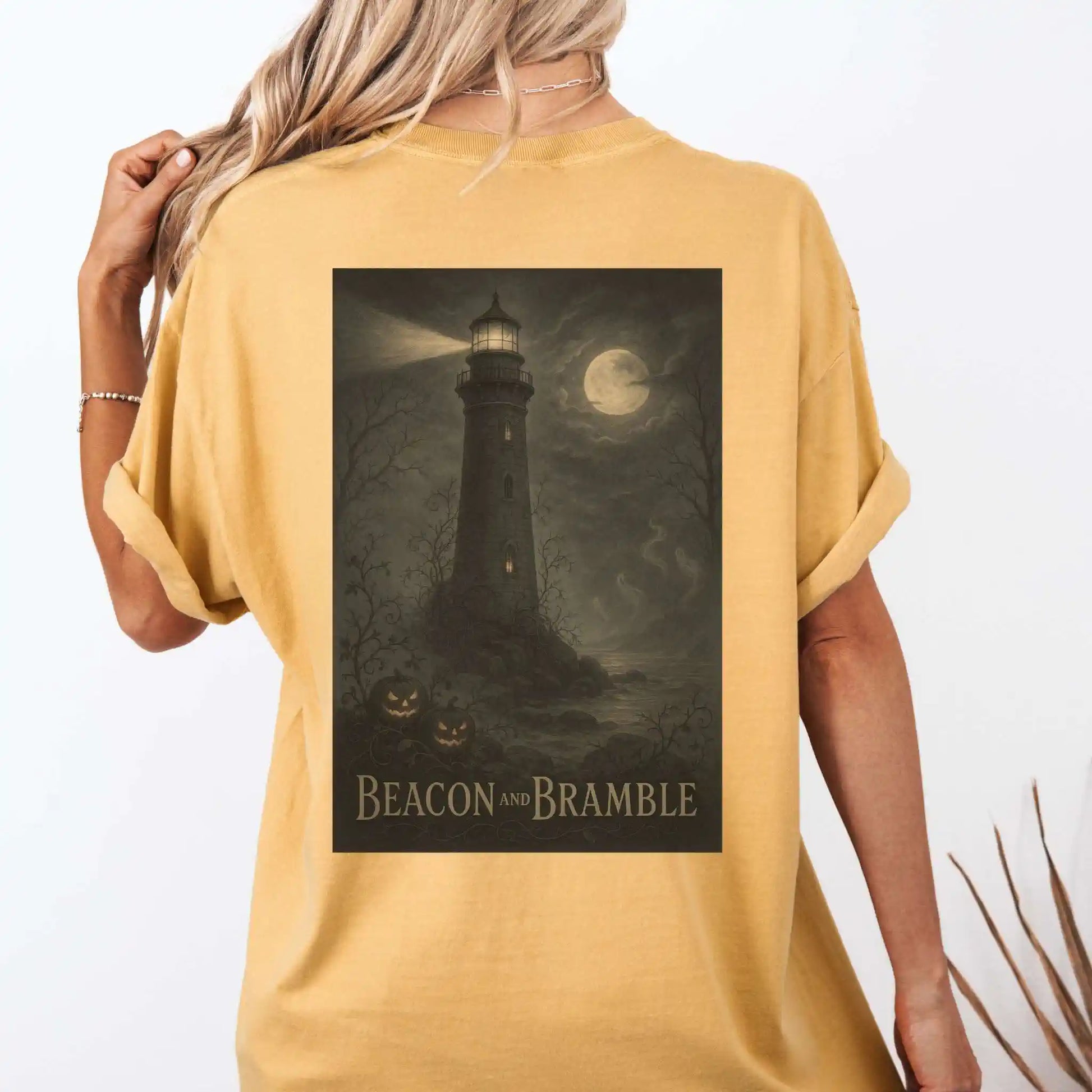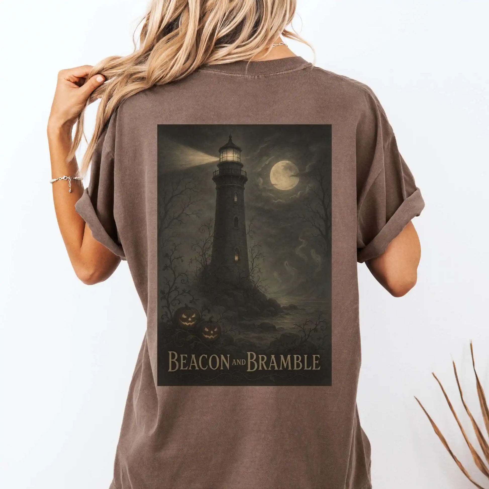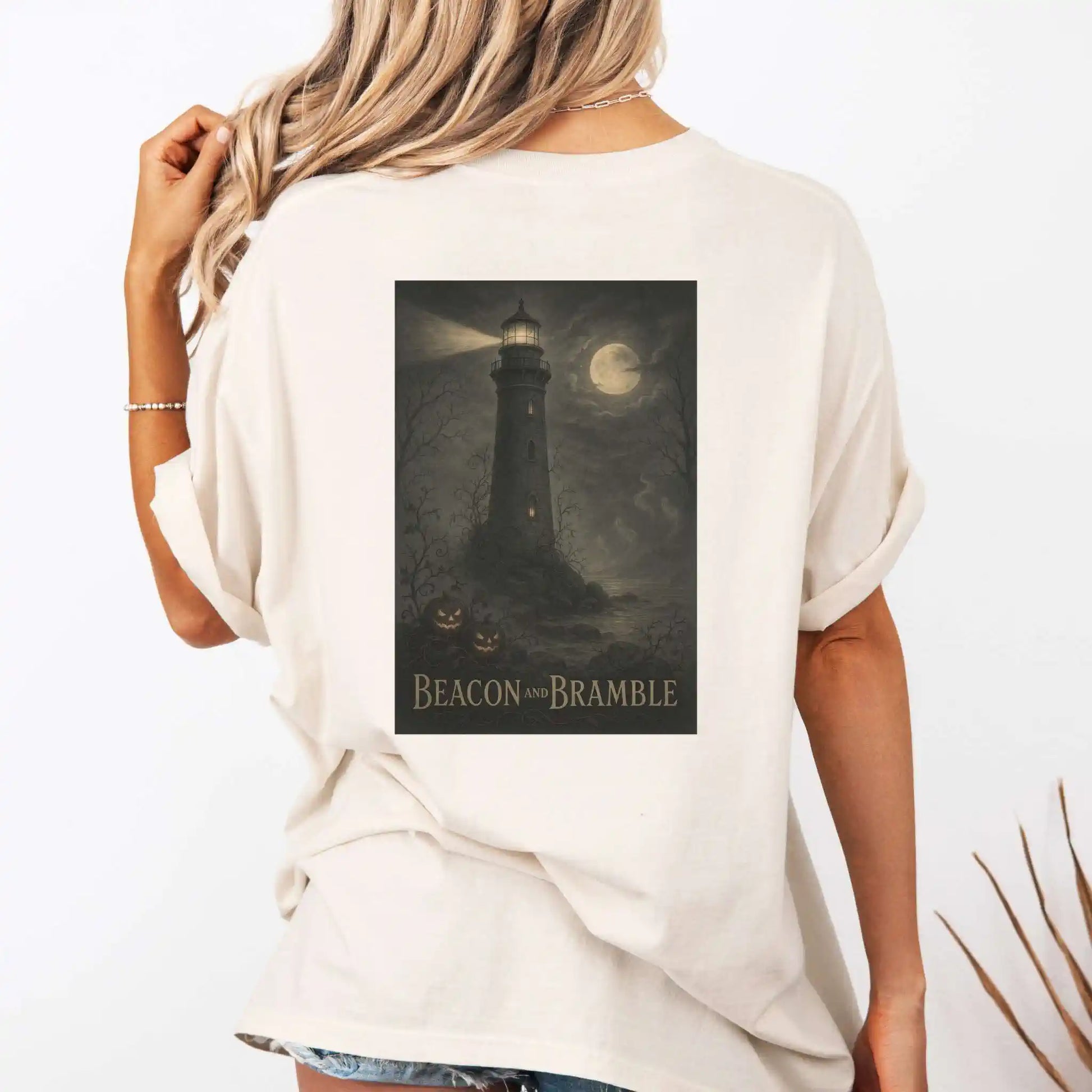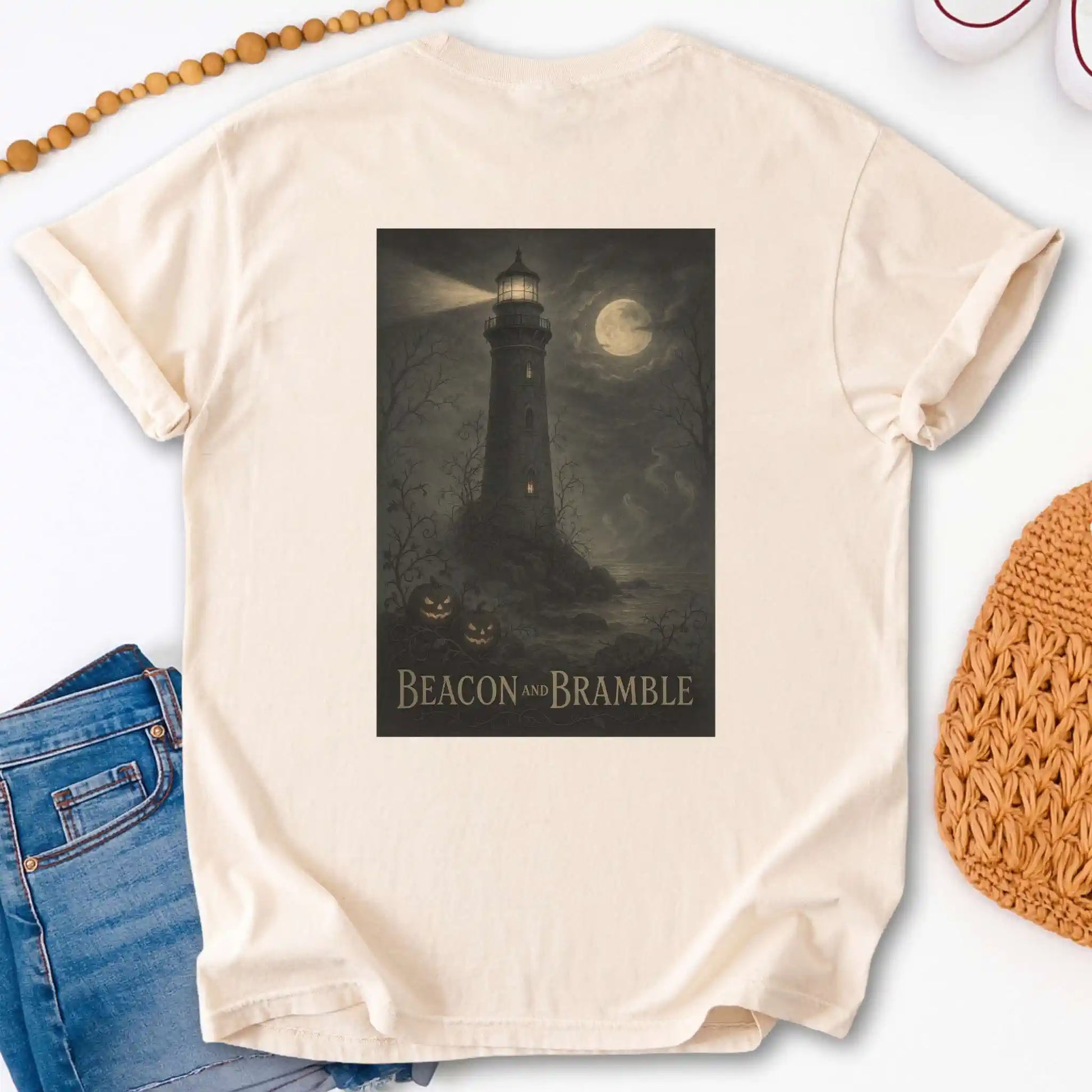 The front features the Beacon & Bramble logo beneath a carved jack-o’-lantern. On the back, a towering lighthouse casts its beam across a moonlit, haunted shoreline, with grinning pumpkins lighting the rocky coast. Printed front-and-back on a t-shirt, it’s ideal for bonfires by the water, ghost tours, or late-night autumn strolls.