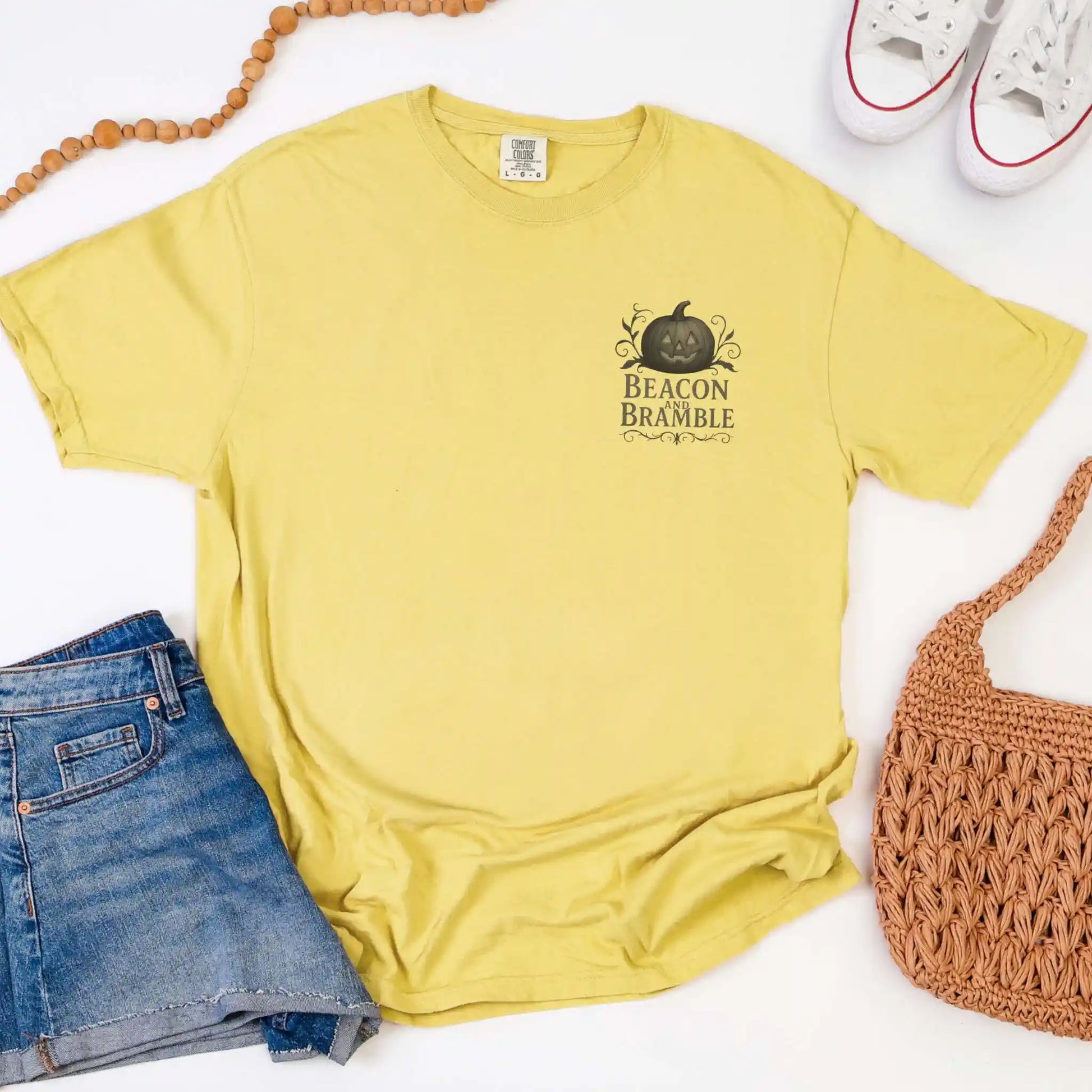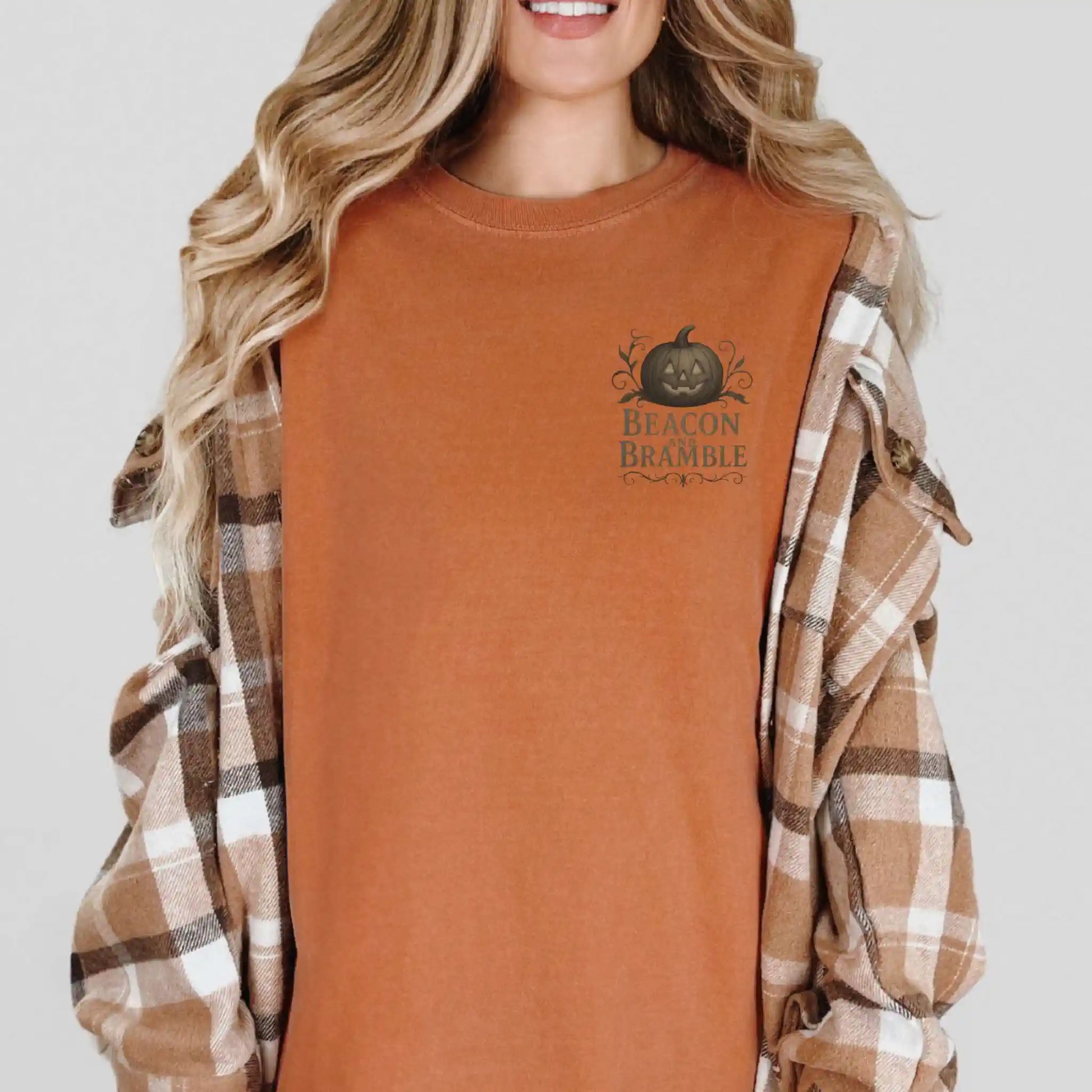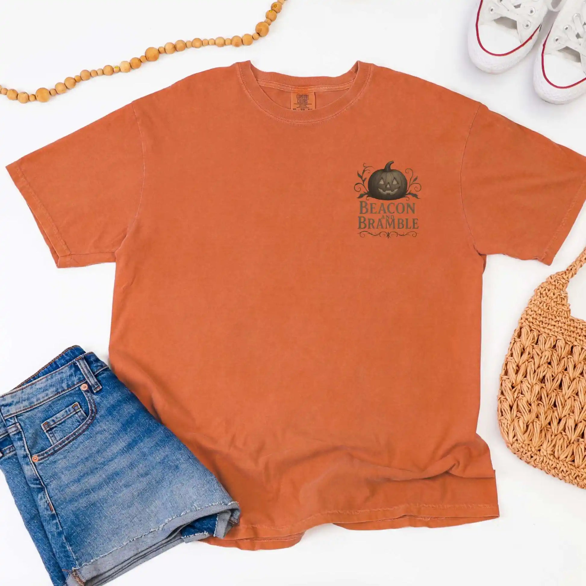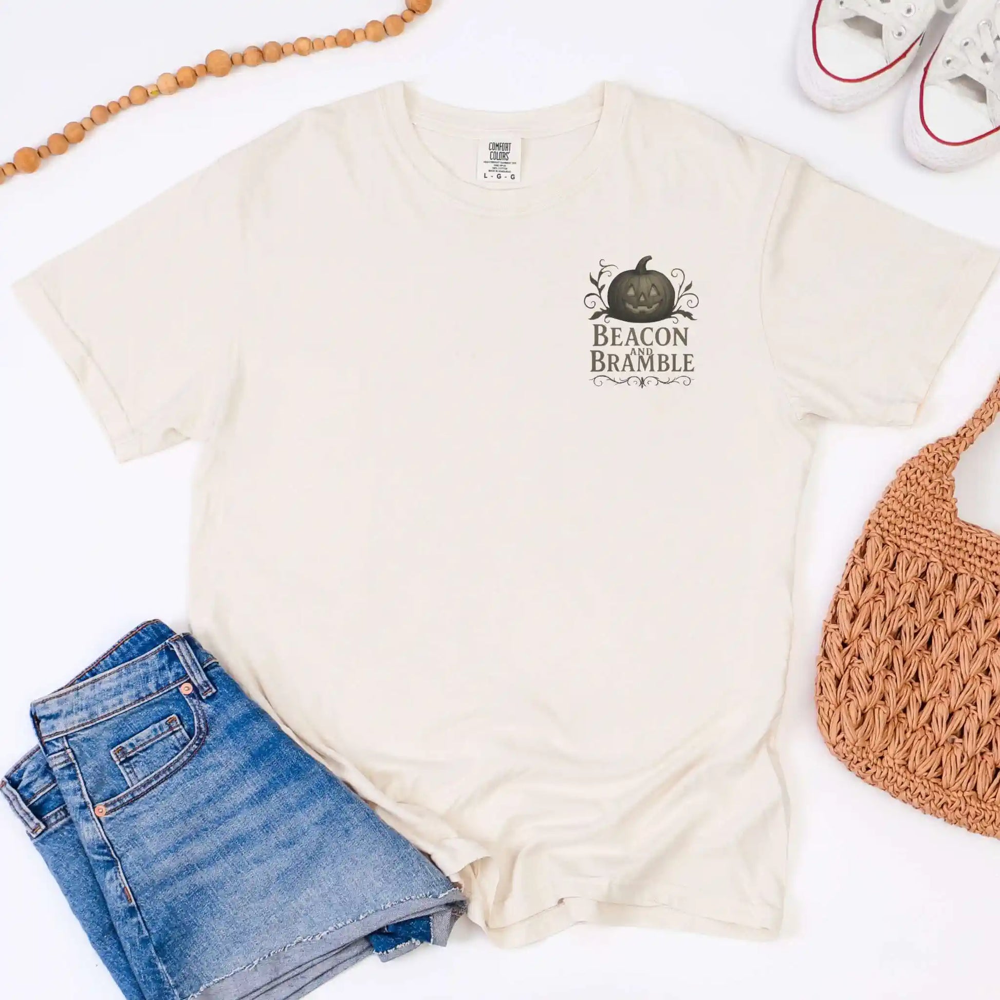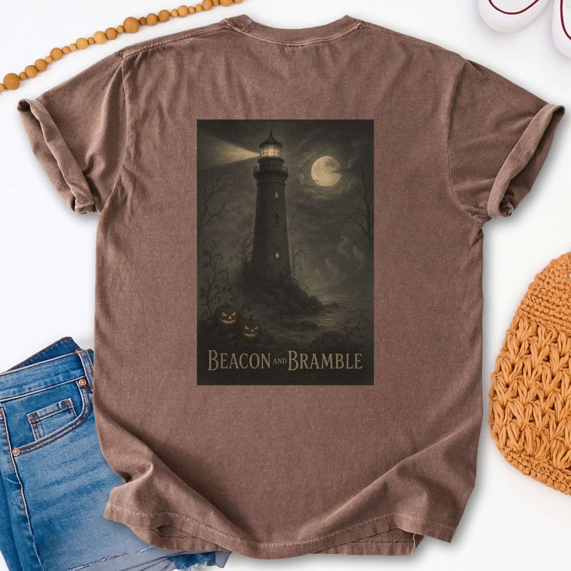 The front features the Beacon & Bramble logo beneath a carved jack-o’-lantern. On the back, a towering lighthouse casts its beam across a moonlit, haunted shoreline, with grinning pumpkins lighting the rocky coast. Printed front-and-back on a t-shirt, it’s ideal for bonfires by the water, ghost tours, or late-night autumn strolls.
