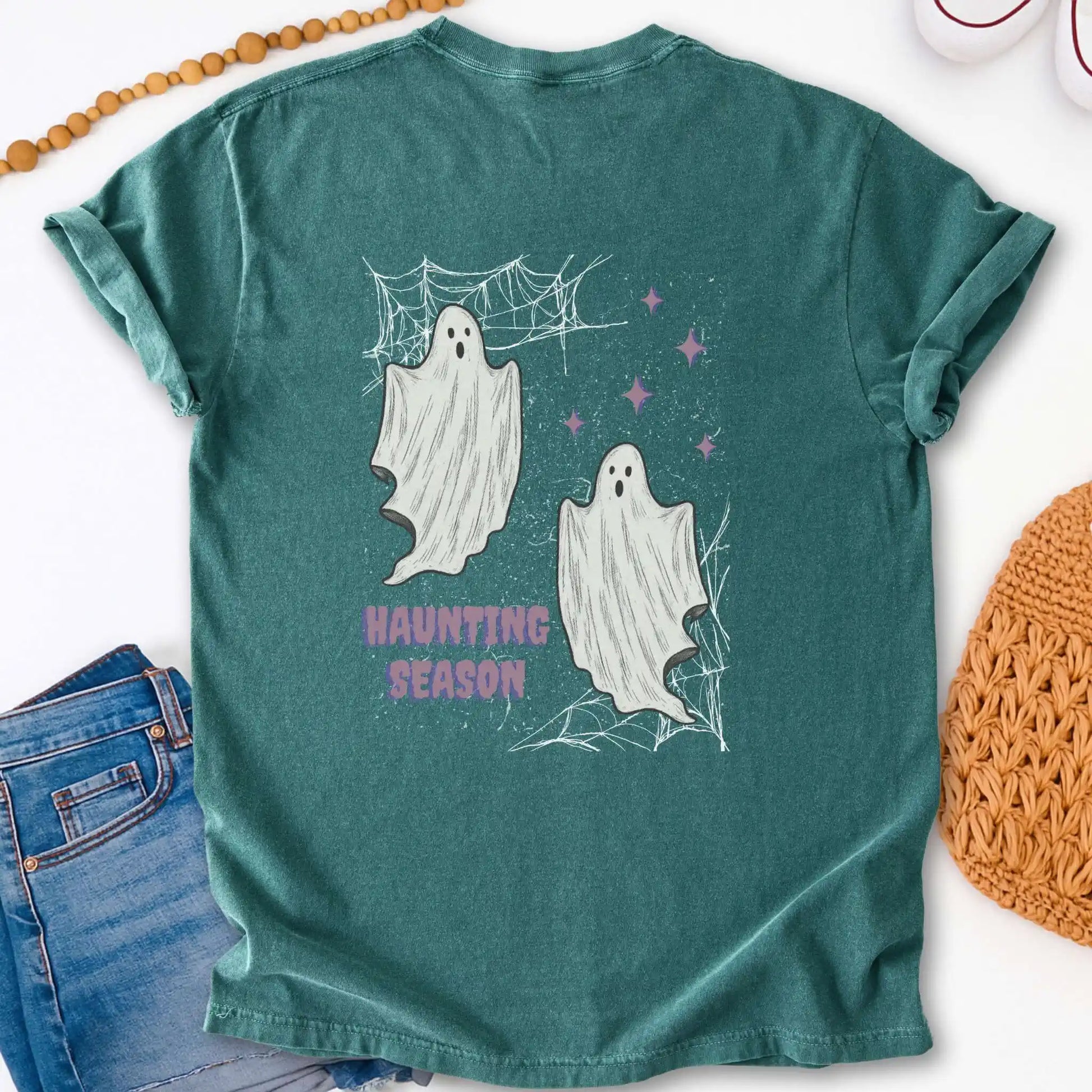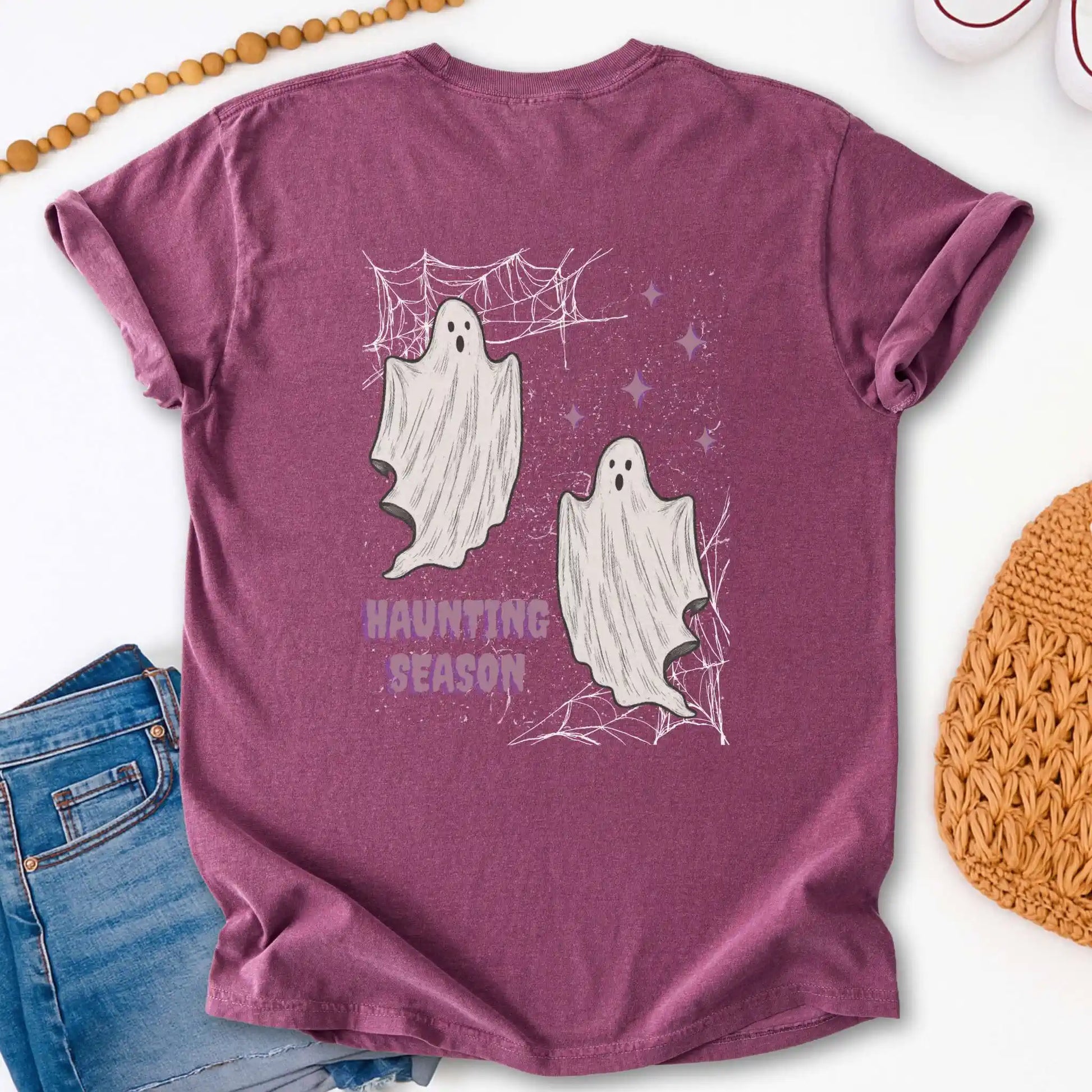 The design features two classic sheet ghosts floating against a textured backdrop, framed by cobwebs and purple stars, with bold “Haunting Season” text below. Printed on the front of the t-shirt, it’s a statement piece ideal for haunted hayrides, costume parties, or everyday October fun.