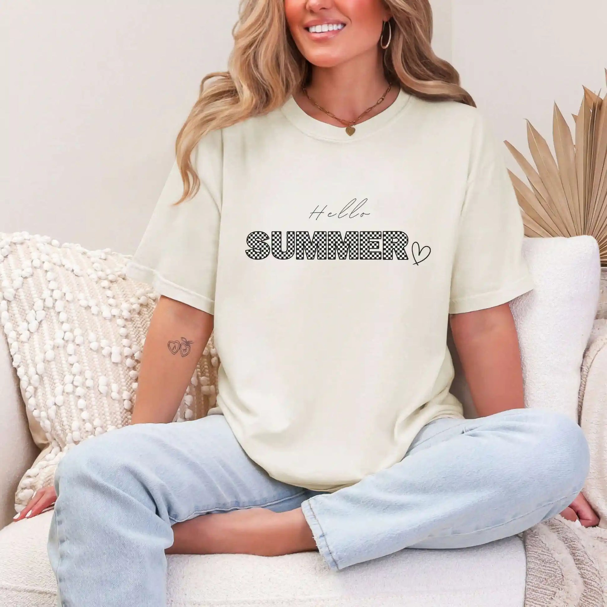 Features a handwritten “Hello” above bold black-and-white “SUMMER” lettering in checkerboard style, finished with a tiny heart doodle that adds charm and personality.